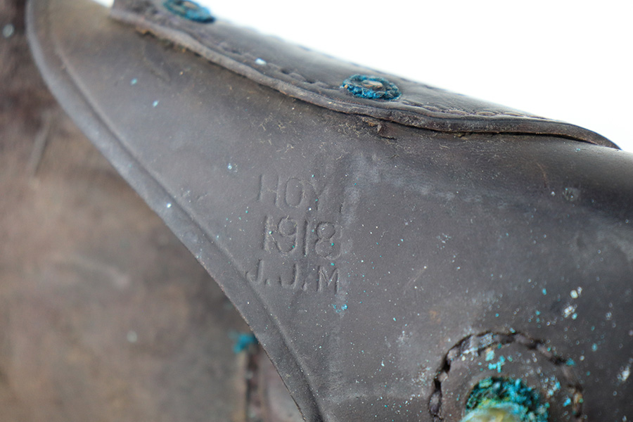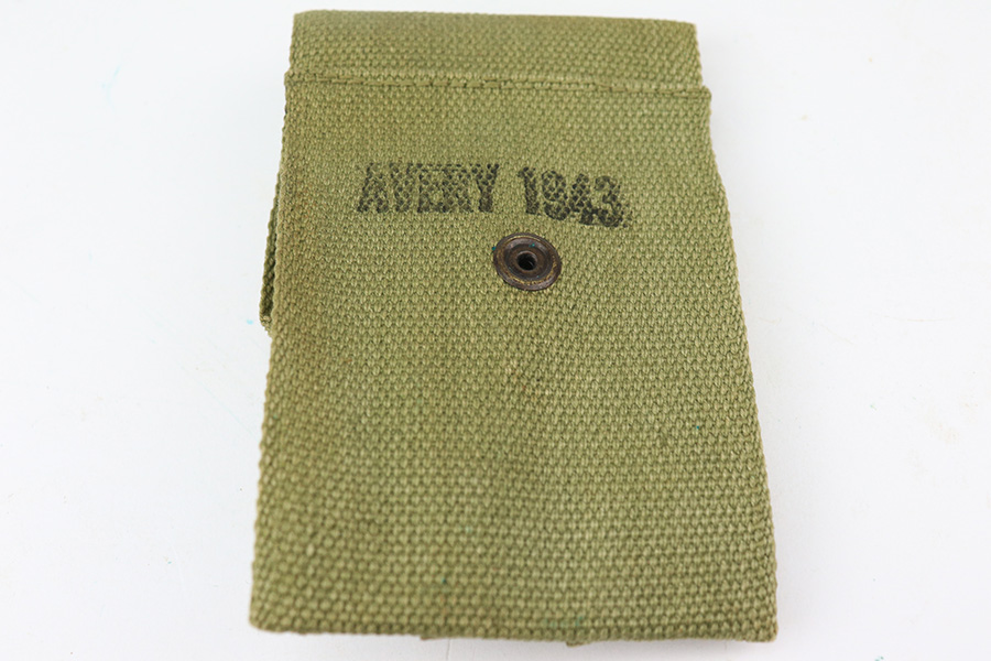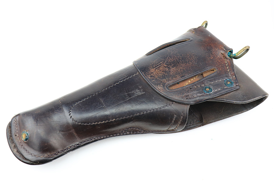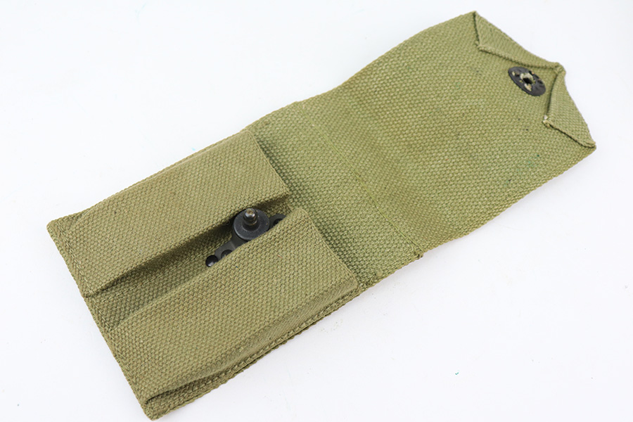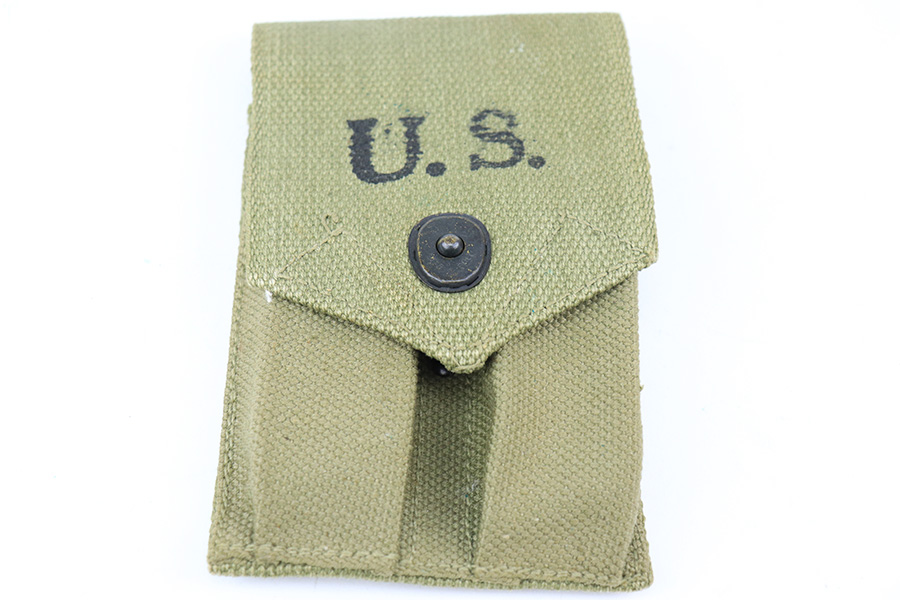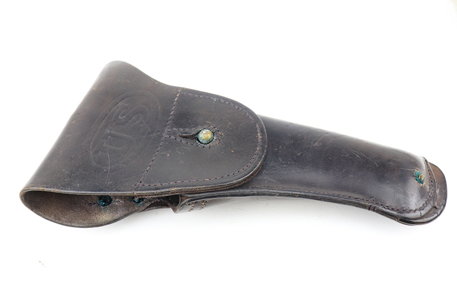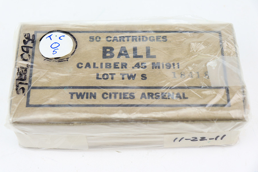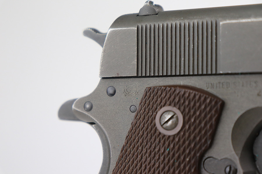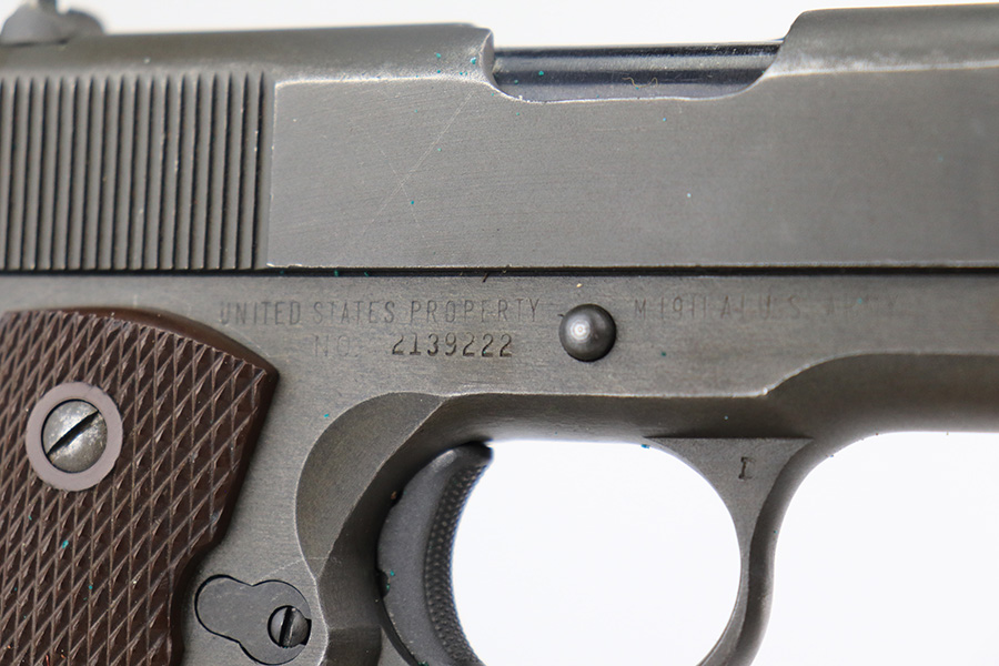 5/20/22 – This is a minty example of a Remington Rand Model 1911A1 issued to the US military in 1945. The gun is “United States Property” marked, has the proper “FAJ” inspection marking, and has a cross-cannon military cartouche. Flannery barrel. The gun comes as a rig with a nice 1918-dated Hoyt holster, an original rope lanyard, one box (50 cartridges) of original ammo, a cleaning rod, a 1943-dated canvas ammo pouch, and three period-correct magazines. The holster looks like the stitching was reinforced on the top flap. There is blue-green verdigris on all of the brass fittings. We recommend cleaning this off before putting the gun in the holster, so as to protect the finish. The gun itself is excellent, retaining about 97% of its original parkerized finish. There is very minor wear around the high edges in general and around the muzzle. Hints of thinning on the grip straps. Comes with excellent period original plastic grips, though they are Colt grips. Minty bore.
