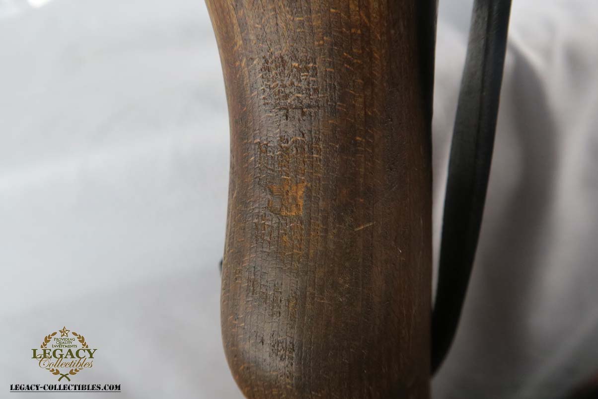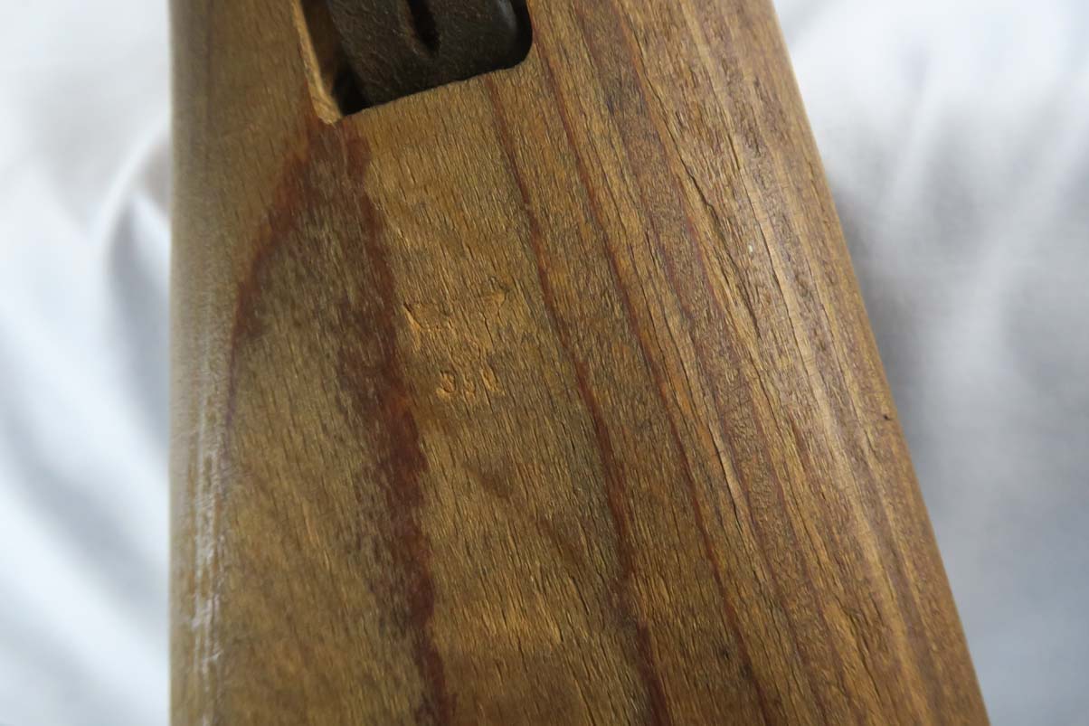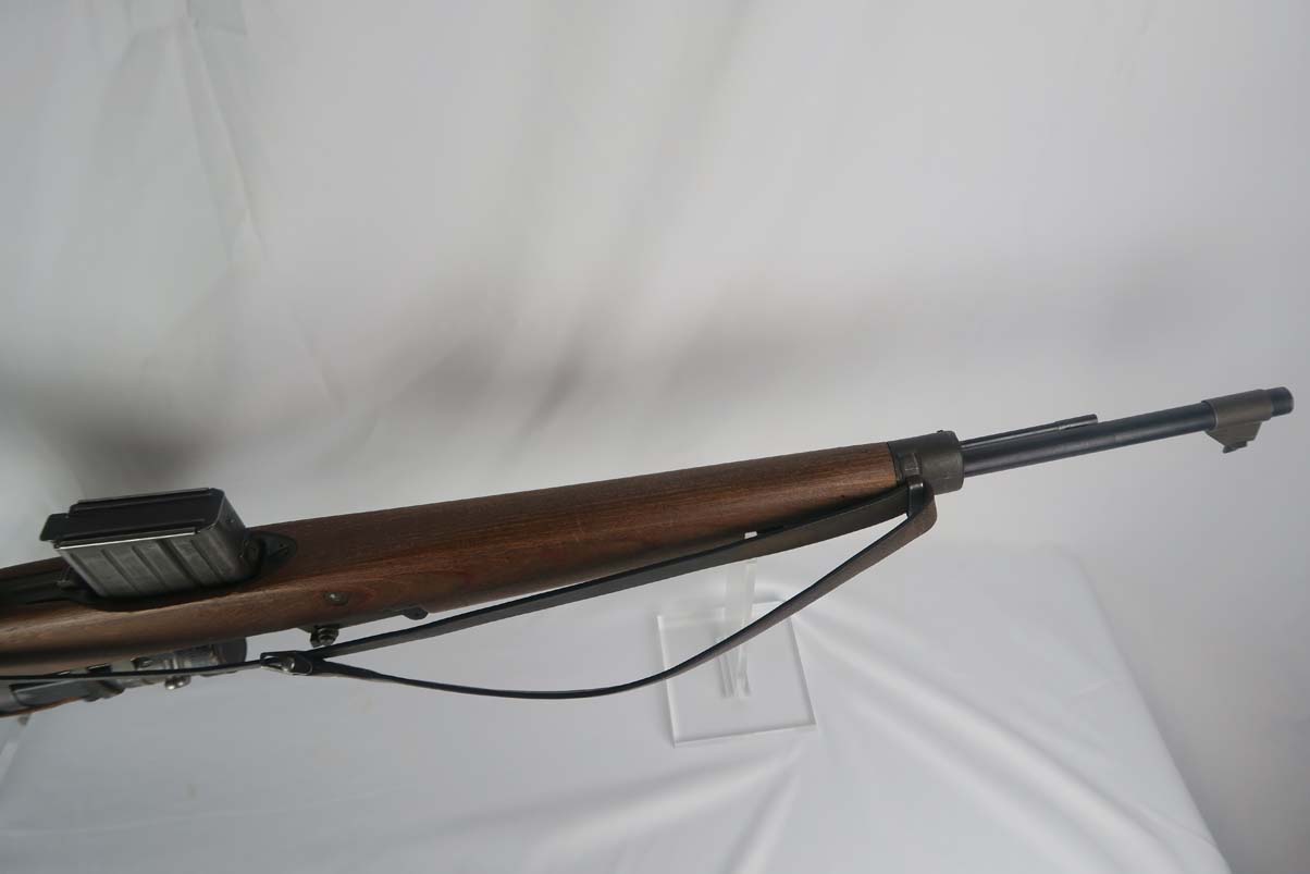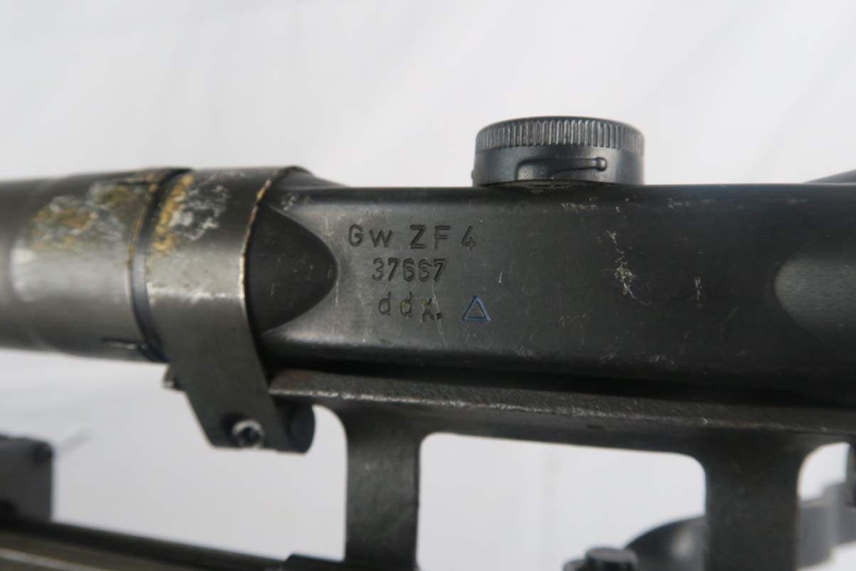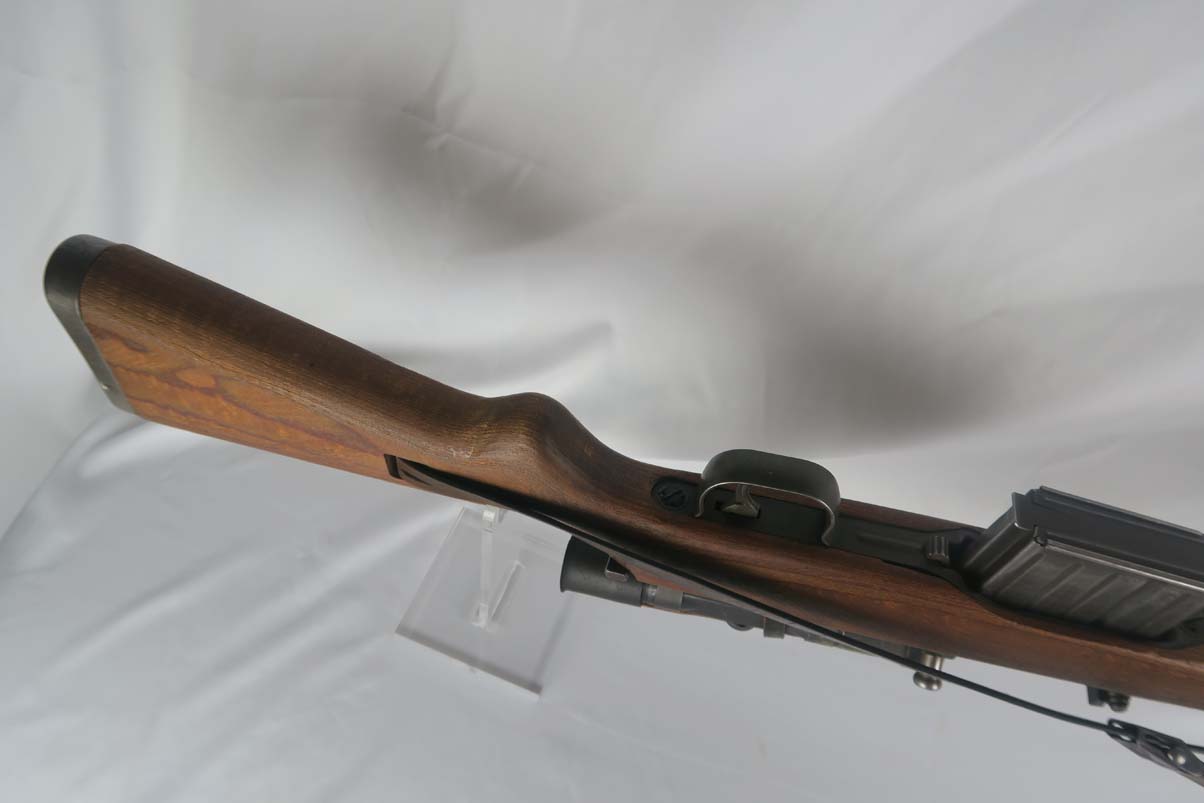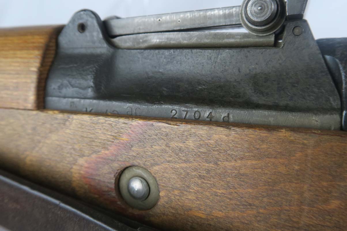 7/14/17 – This an excellent example of a late “d” block Walther manufactured K43 rifle from World War II. It has been fitted with a non-matching WWII ZF4 sniper scope and mount. The left side of the receiver is marked “K43” followed by “ac/45” (stacked) followed by serial number “2704d”. The right side receiver flat is correctly stamped with a E/359 proof. The rifle has a late war type three rough forged receiver with the dual bolt guides. It is fitted with a type three rough cast bolt carrier with the reinforcing web on the front end (only) and it still retains the hold open latch with the hollow cocking knob. It has a stamped action cover with the sliding manual dust cover. It is fitted with a late laminated stock and handguard version with the single E/359 proof on the right side below the sling slot and a single smaller ones in the pistol grip area. It comes with a K43 marked “aye” manufactured magazine with a single “WaA843” Waffenampt proof. The rifle is complete with a cleaning rod and late war smooth brown leather sling. The rifle is fitted with a late war, very rough cast K43 sniper mount fitted with a blued ZF4 scope. The mount is numbered 8691 on the front end with a single E/359 proof below the locking lever. The scope is marked “GW ZP4/37667/ddx”. The scope comes with a reproduction rubber eyecup, metal rain shield, leather lens covers, amber filter and canvas cover. The optics are very good – the photo was taken on a rainy day so they look cloudier than they are. The rifle has a gray phosphated finish on the action and receiver with a blued barrel and trigger guard. The finish is excellent with 97% plus of the original wartime phosphate finish overall on the metal parts with the bolt carrier and barrel having a blued finish. The stock and handguard are both in excellent condition with nice distinct markings showing the wartime machining on the stock. The scope mount has a blackened, rough cast exterior finish and color with a purplish tint to the base. The scope retains 95% of the blue finish with clear markings. The optics are very clear and might be the nicest optics we have seen. This is a nice looking late WWII K43 rifle with sniper scope and mount.