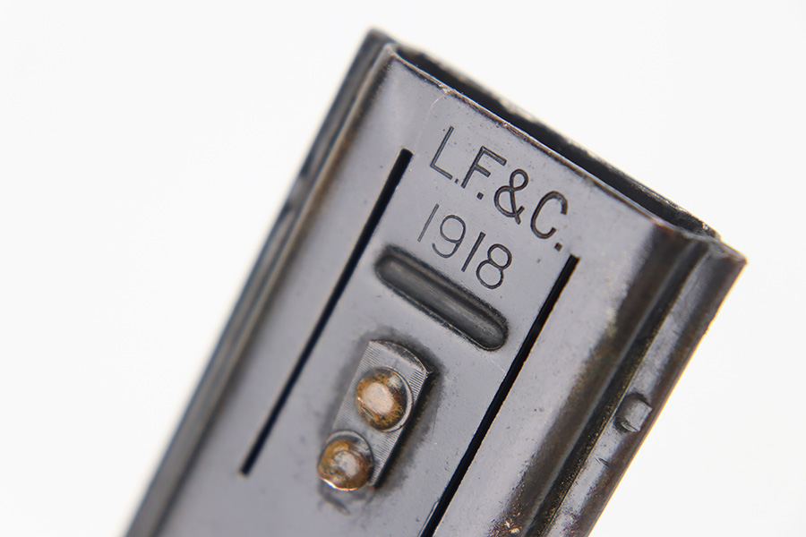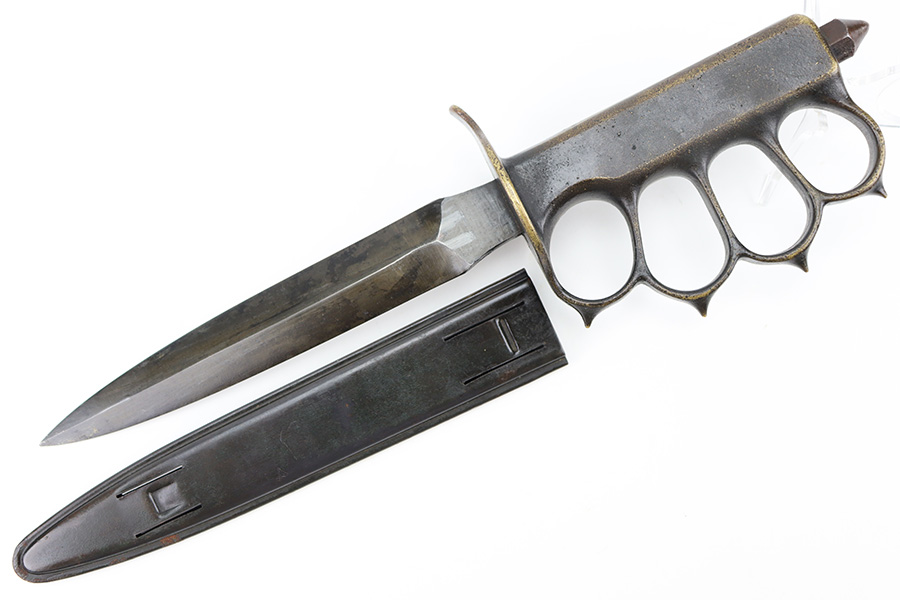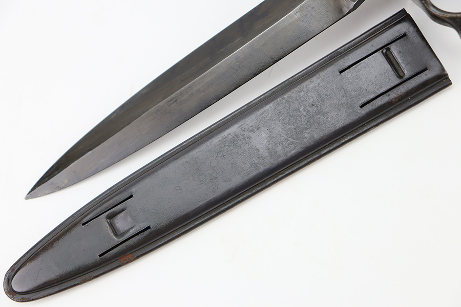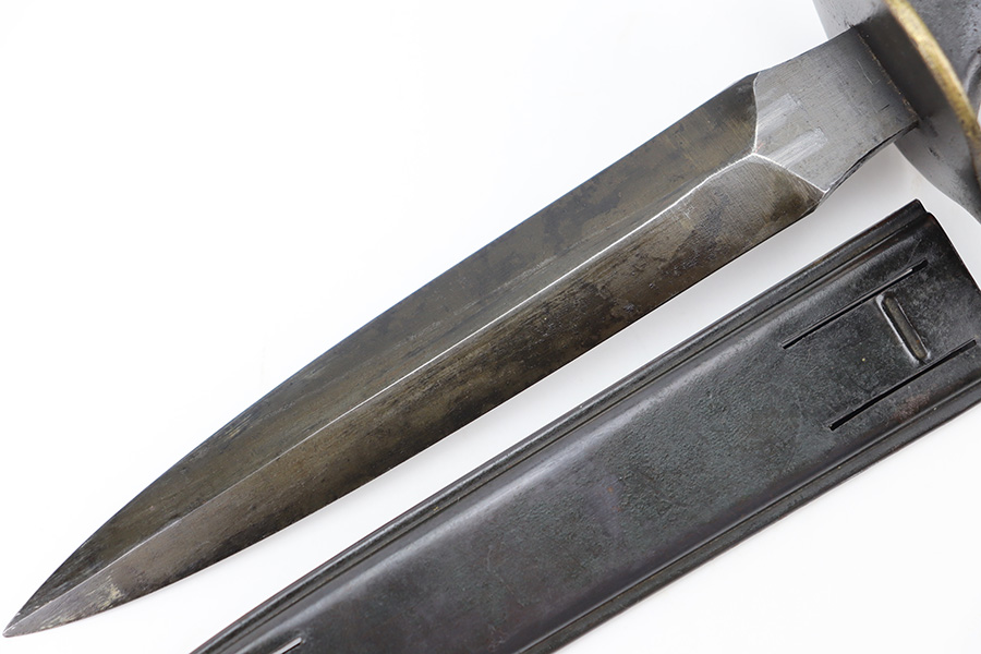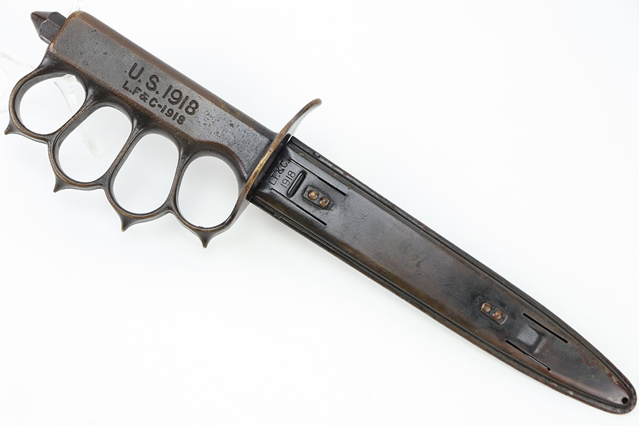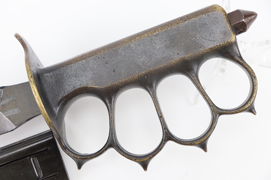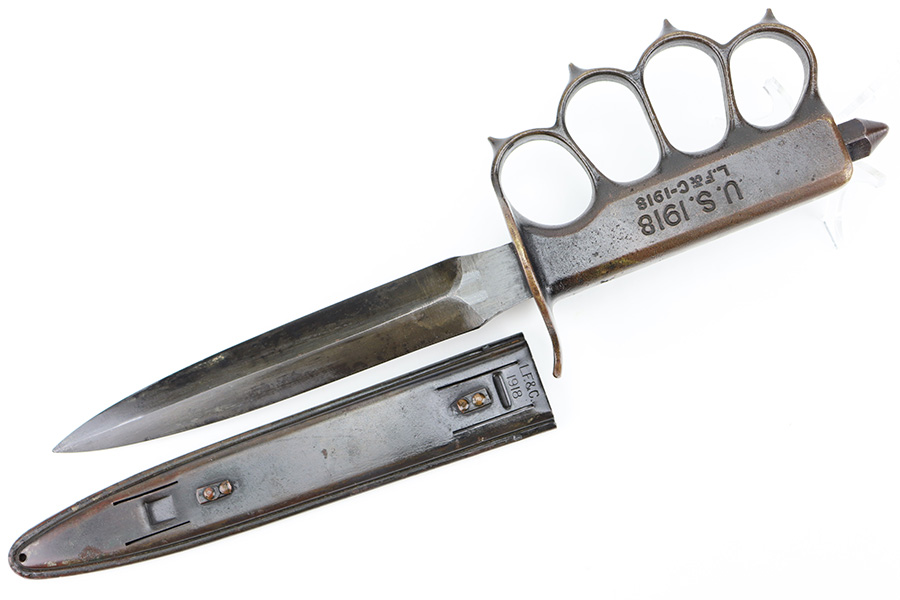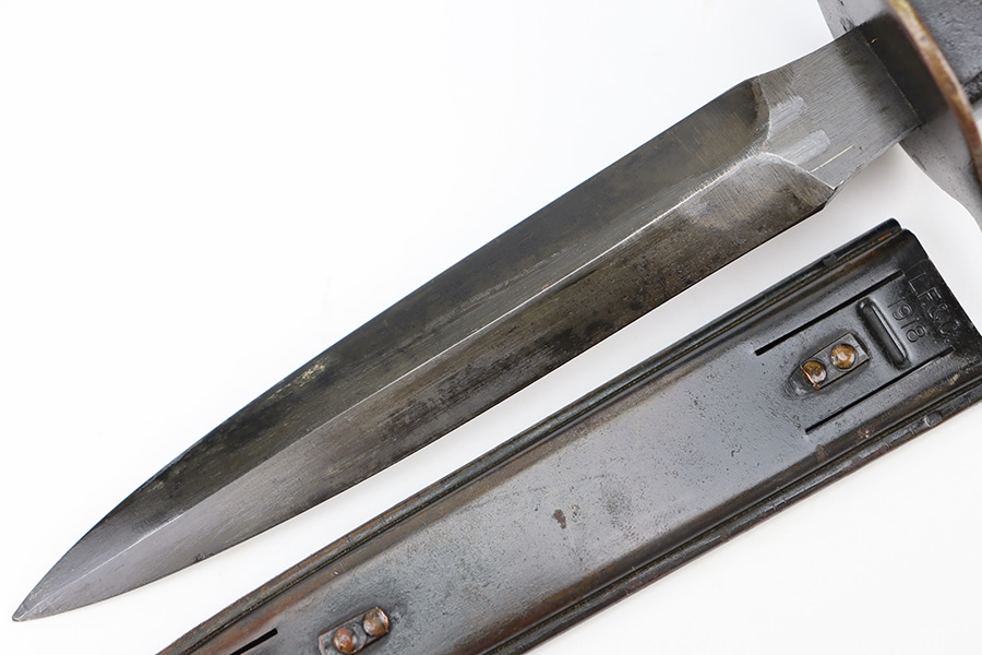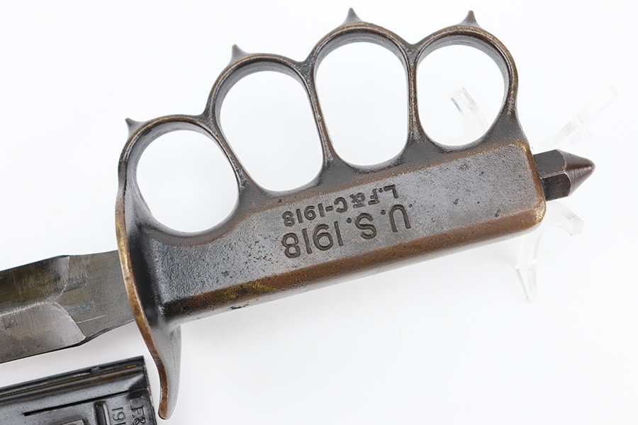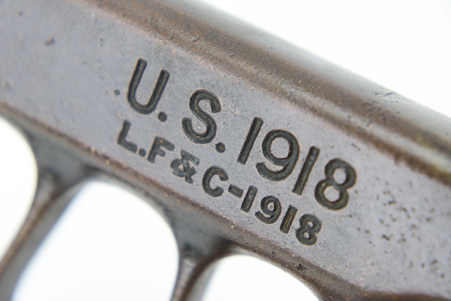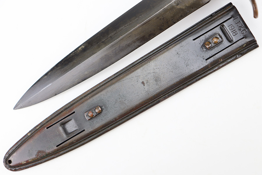 12/28/23 – This is an original 1918 US Trench Fighting Knife by LF&C. This example is in excellent condition, with a remarkable amount of original finish still present throughout the handle, blade, and scabbard. This is the nicest example we’ve encountered, as they often come worn with no visible finish remaining. The blade appears unsharpened, but there is some dark discoloration throughout, as well as light surface scratches from scabbard rub. The handle has light edge wear and mild thinning throughout the original finish. The scabbard is in great shape with a few spots of discoloration, and both prongs are broken.