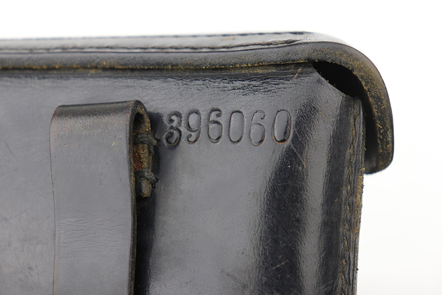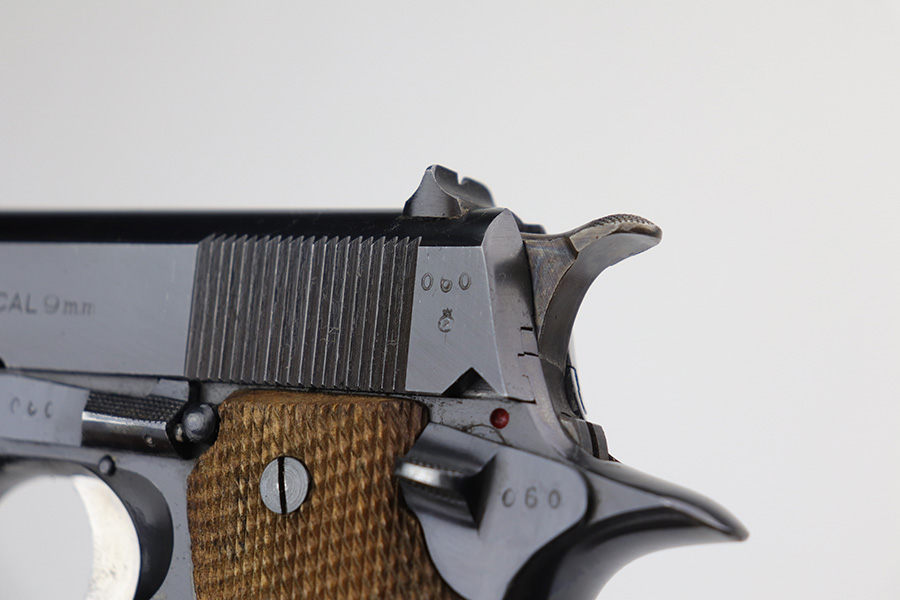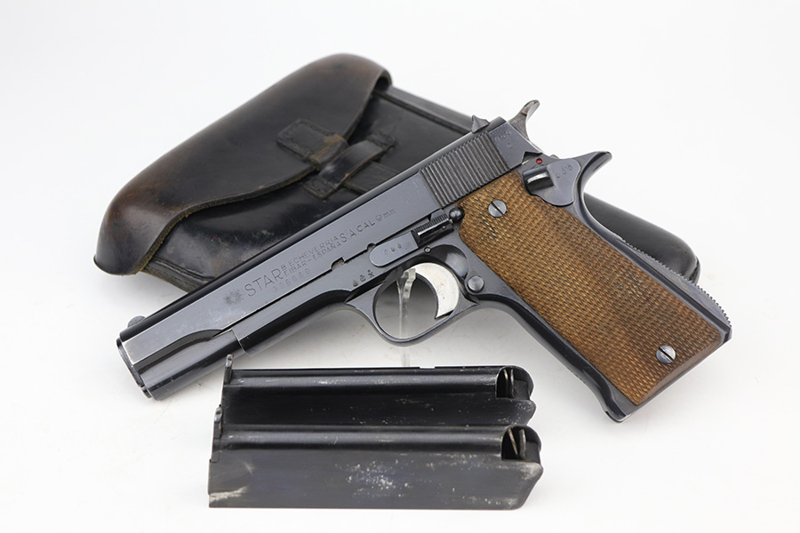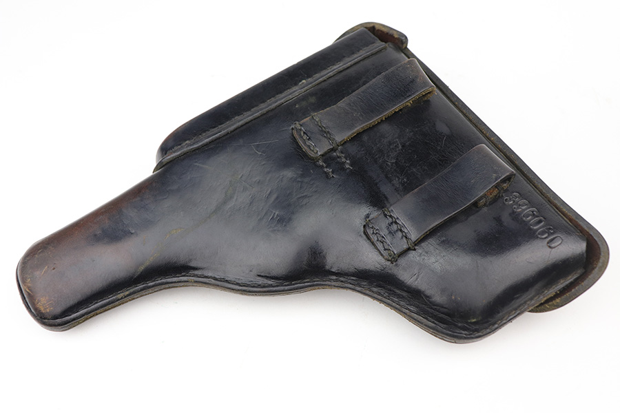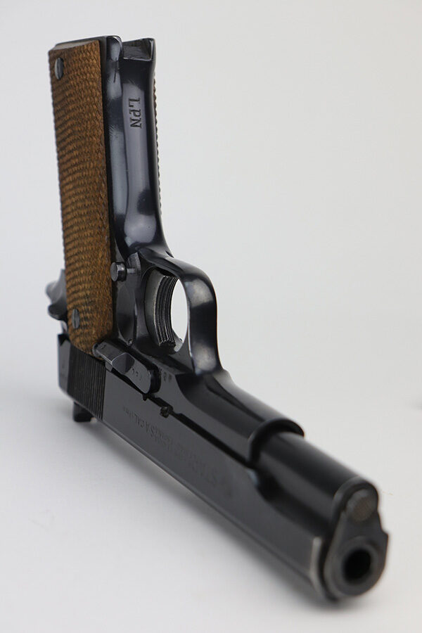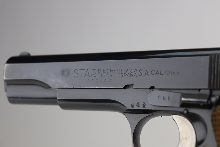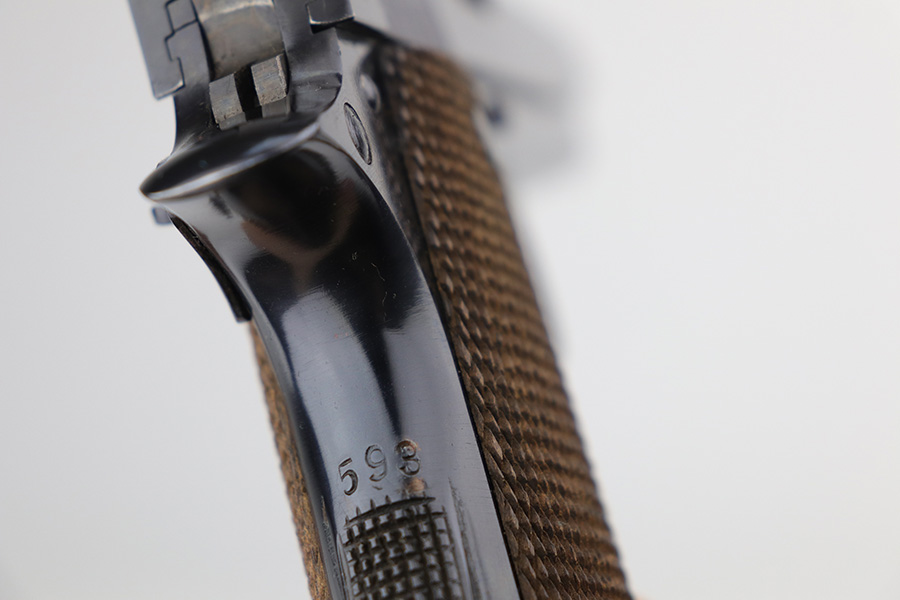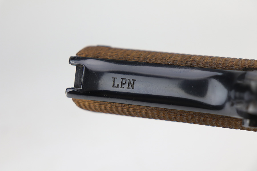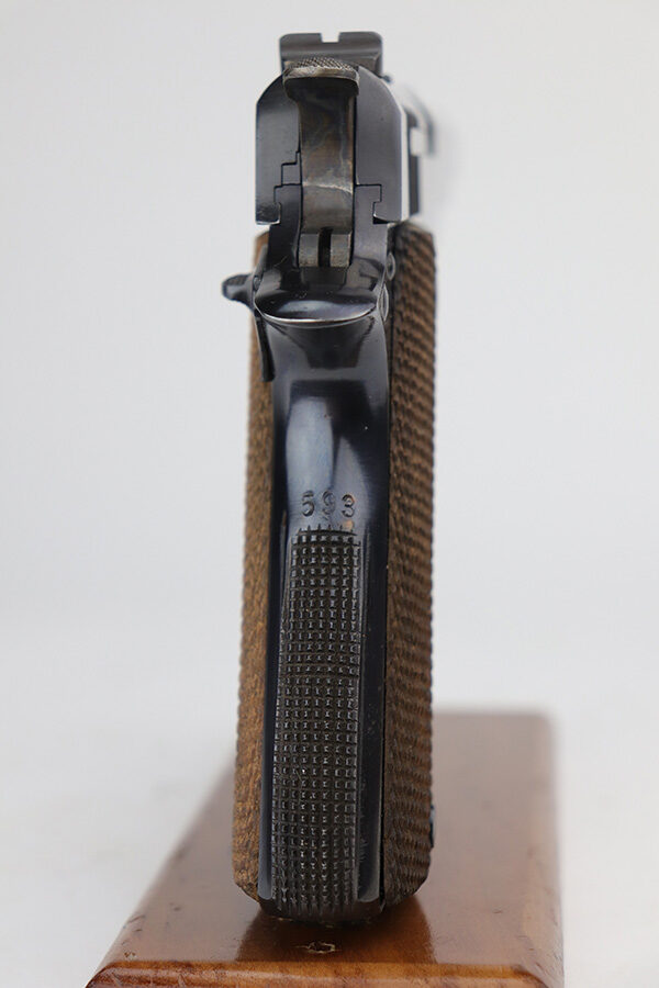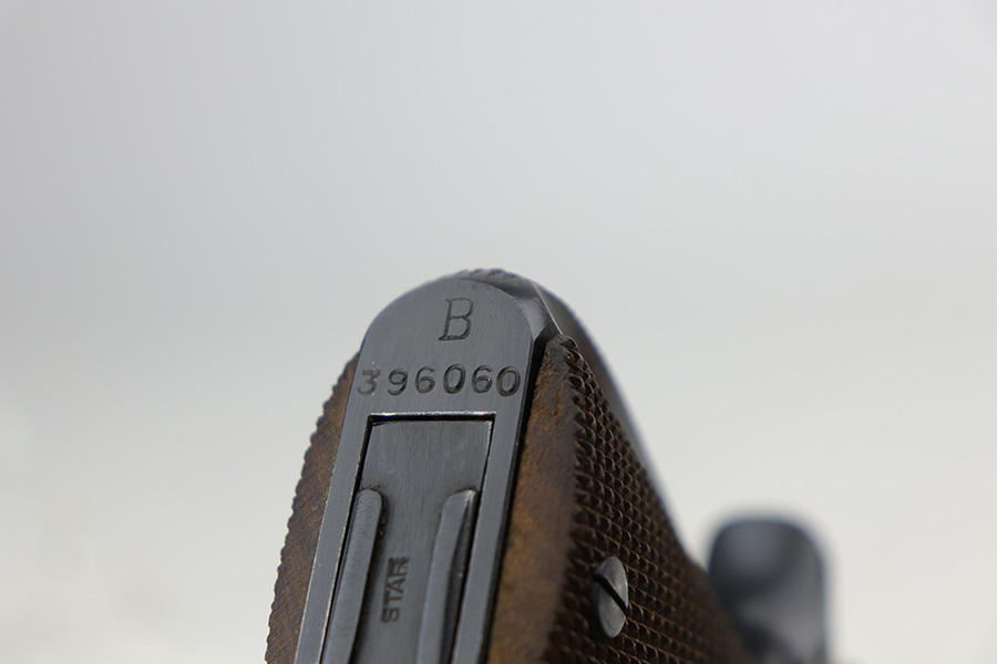 8/2/24 – This is an excellent example of a Star Model B Rig made after WW2. It is all matching and has an “LPN” marking on the front strap, indicating it was issued to the West German Land Police Force. It comes with two original matching magazines and a matching-numbered holster. The holster was made by Geco and also has an “LPN” marking. The gun has retained about 97% of its original finish. There is very minor wear along the high edges of the slide and around the muzzle. Some minor spotty wear on the left side of the slide. The beautiful case-hardening is still intact on the hammer. Comes with minty original wood grips. The bore is near-mint.