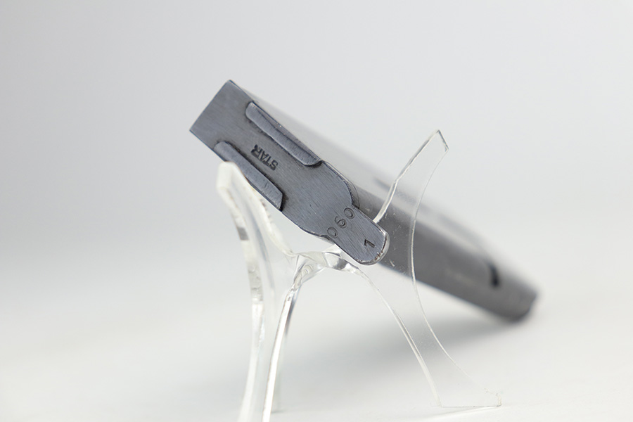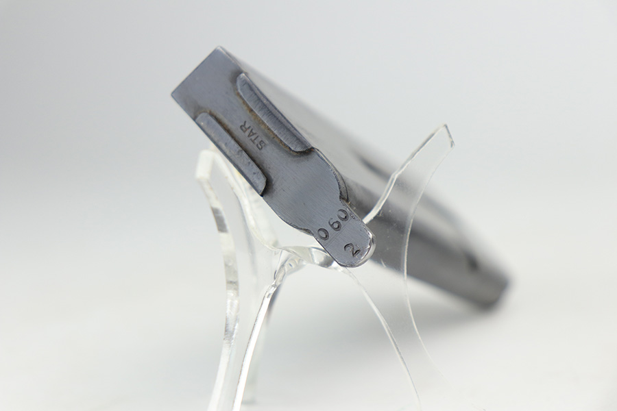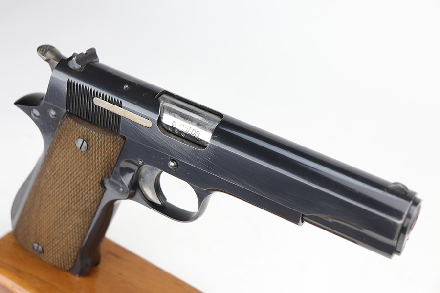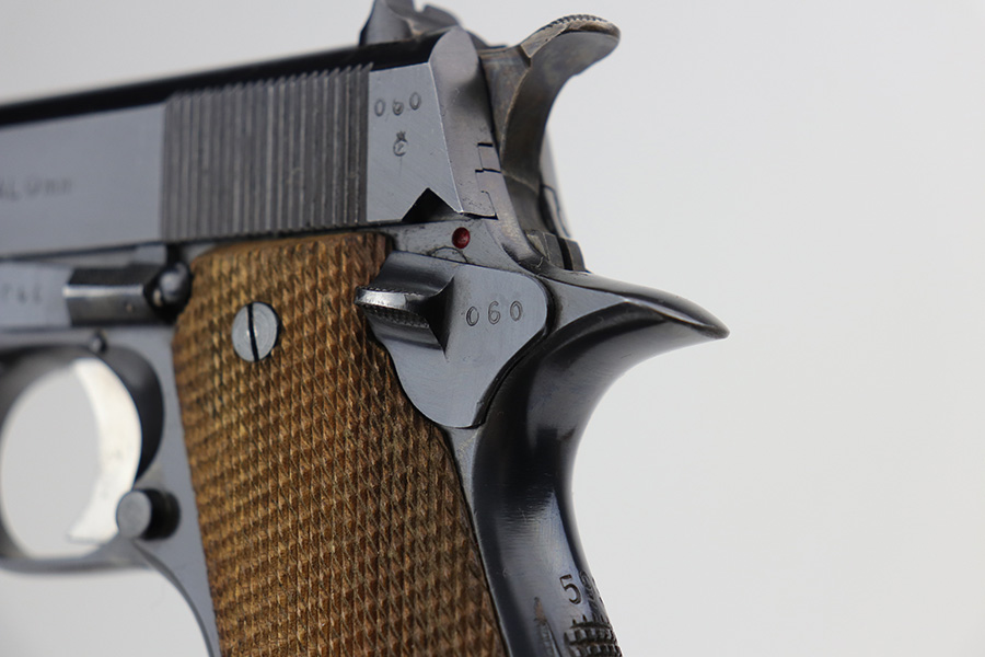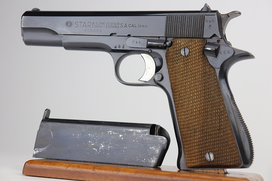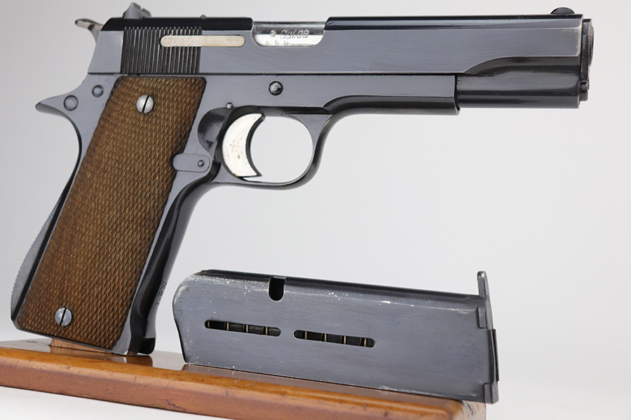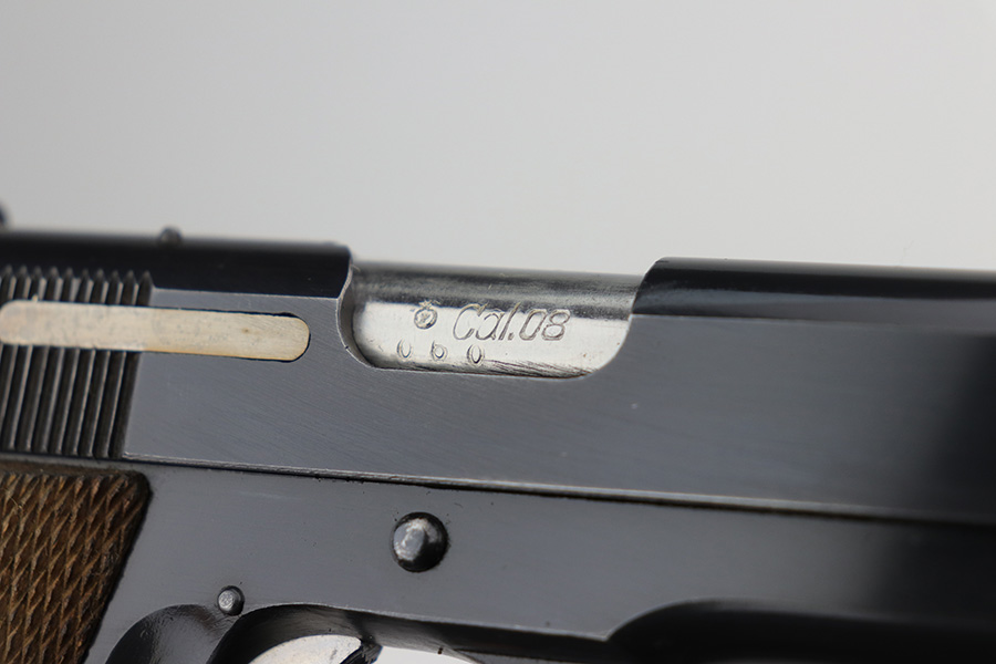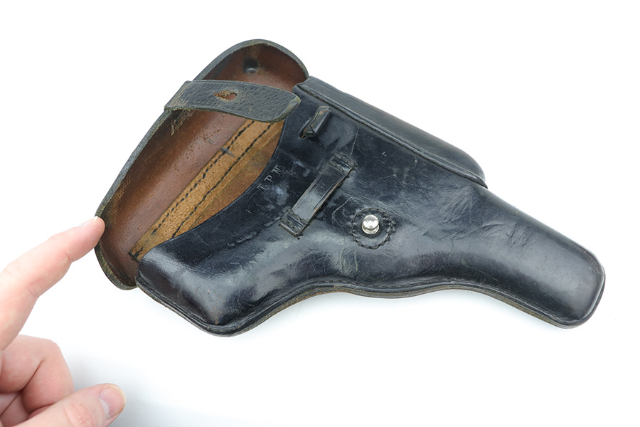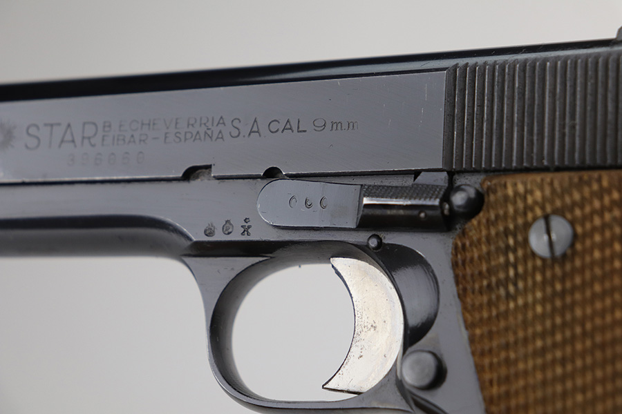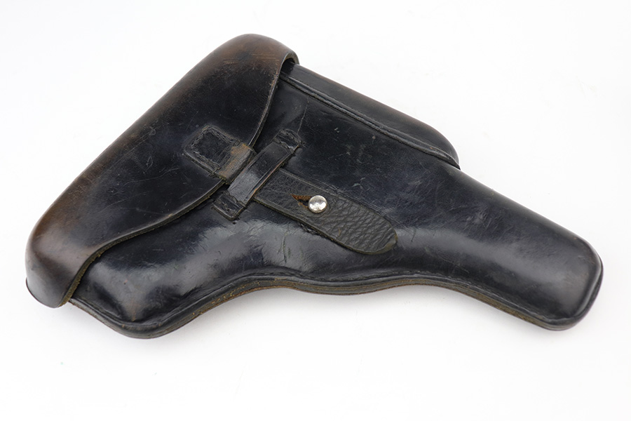 8/2/24 – This is an excellent example of a Star Model B Rig made after WW2. It is all matching and has an “LPN” marking on the front strap, indicating it was issued to the West German Land Police Force. It comes with two original matching magazines and a matching-numbered holster. The holster was made by Geco and also has an “LPN” marking. The gun has retained about 97% of its original finish. There is very minor wear along the high edges of the slide and around the muzzle. Some minor spotty wear on the left side of the slide. The beautiful case-hardening is still intact on the hammer. Comes with minty original wood grips. The bore is near-mint.