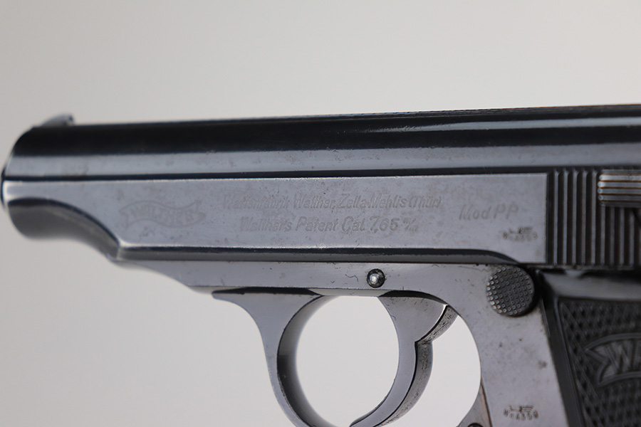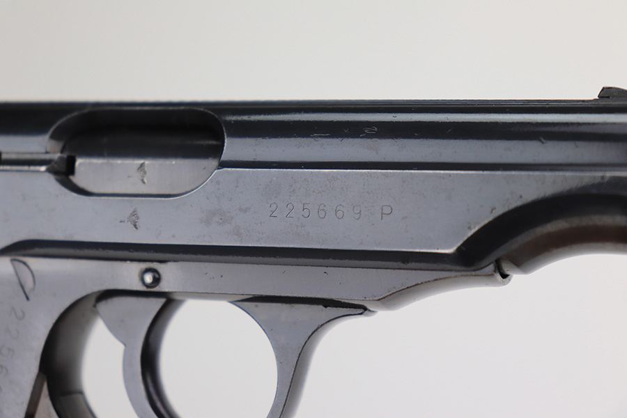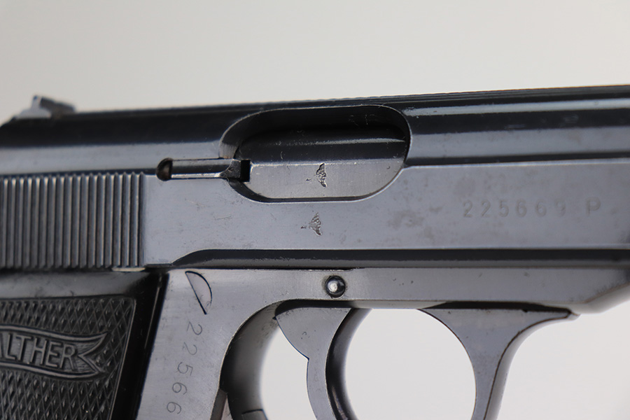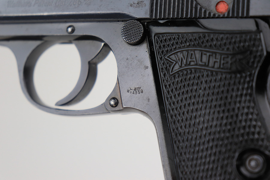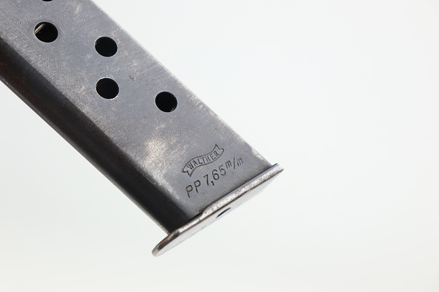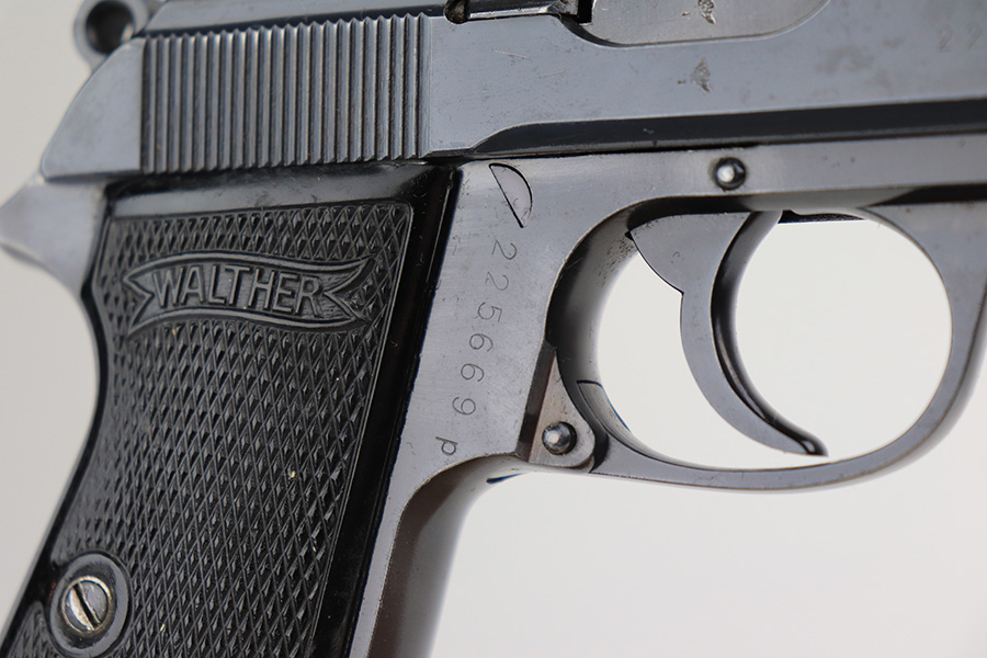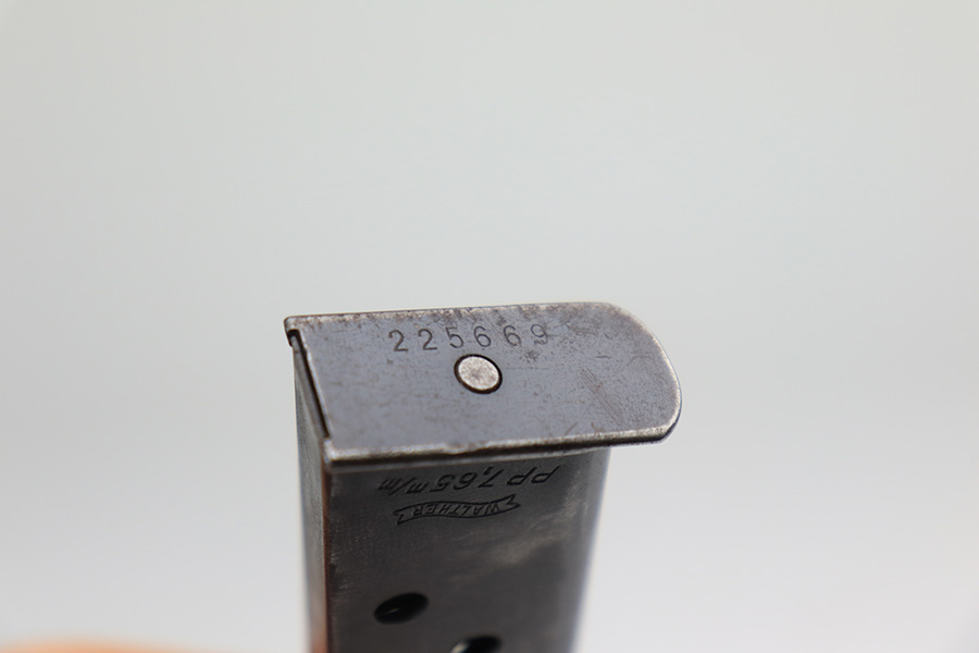 3/24/22 – This is an excellent example of a Walther PP issued to the Luftwaffe in 1941. The gun is all matching, has the proper “Waffen 359” military proofs on the frame and slide, and is in the proper serial number range for a Luftwaffe-issued gun. It comes with one original matching-numbered magazine. The gun has retained about 96-97% of its finish. There is minor thinning and some small dots of oxidation on both grip straps. Minor muzzle wear. There are some tiny dots of discoloration and areas of very minor pin-pricking along both sides of the slide. Comes with excellent period-correct black bakelite grips. The bore is very nice – strong rifling with some areas of minor frosting here and there.