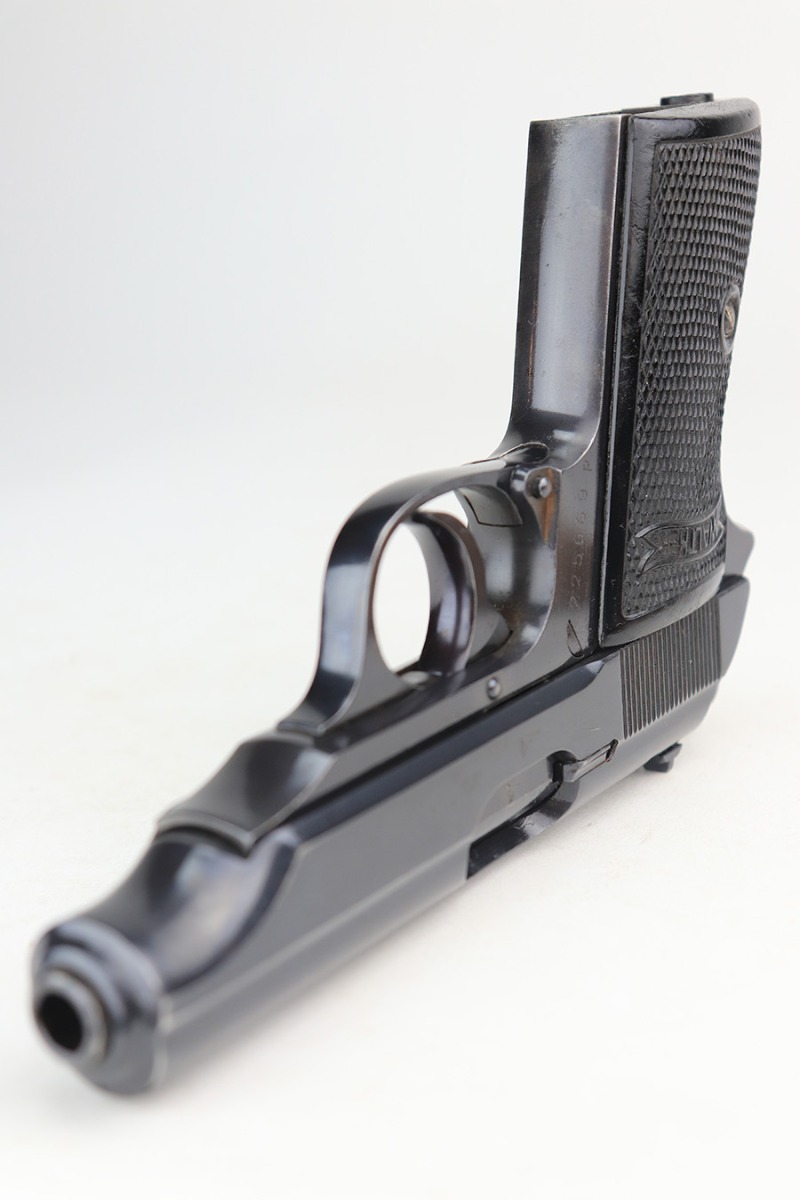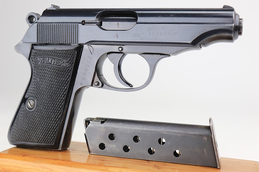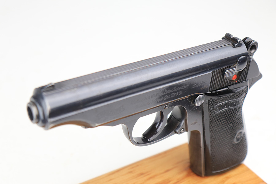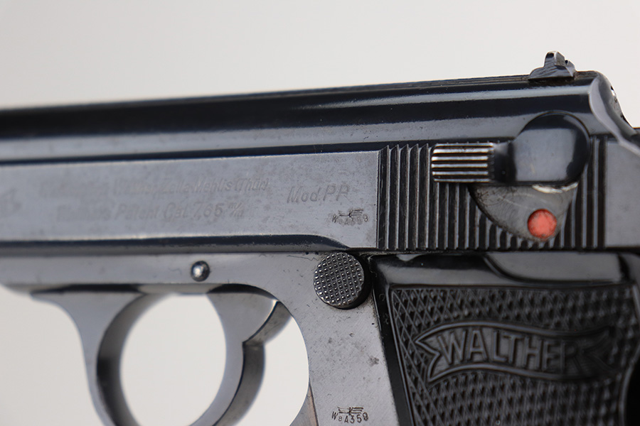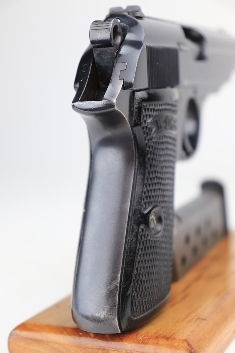 3/24/22 – This is an excellent example of a Walther PP issued to the Luftwaffe in 1941. The gun is all matching, has the proper “Waffen 359” military proofs on the frame and slide, and is in the proper serial number range for a Luftwaffe-issued gun. It comes with one original matching-numbered magazine. The gun has retained about 96-97% of its finish. There is minor thinning and some small dots of oxidation on both grip straps. Minor muzzle wear. There are some tiny dots of discoloration and areas of very minor pin-pricking along both sides of the slide. Comes with excellent period-correct black bakelite grips. The bore is very nice – strong rifling with some areas of minor frosting here and there.