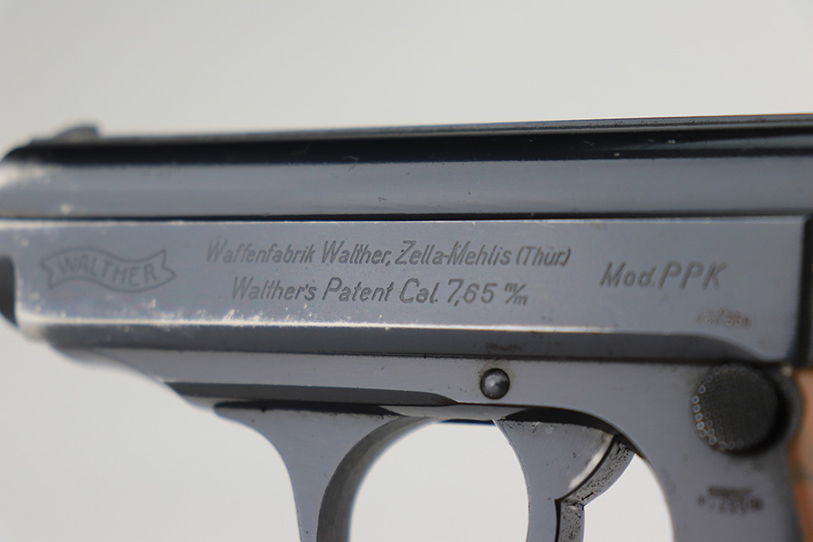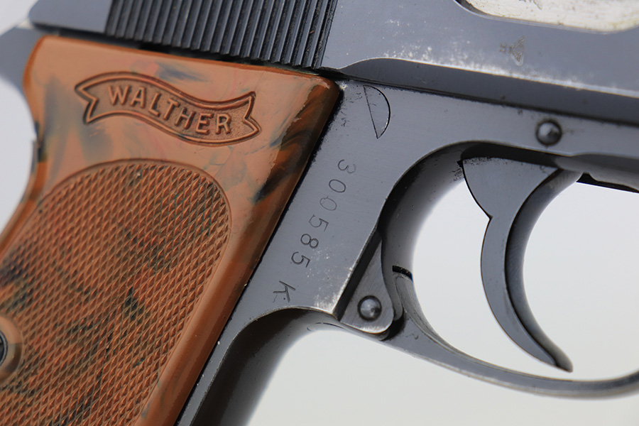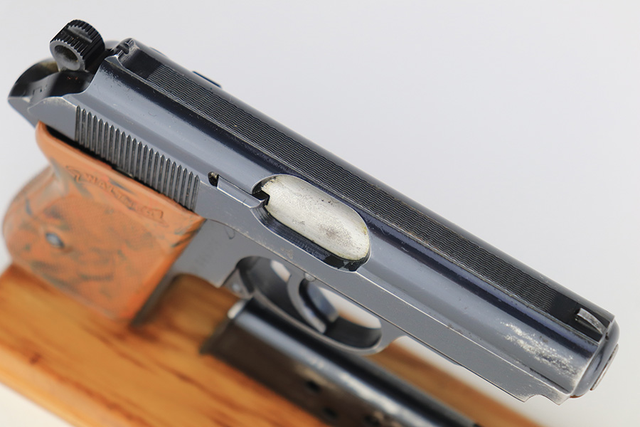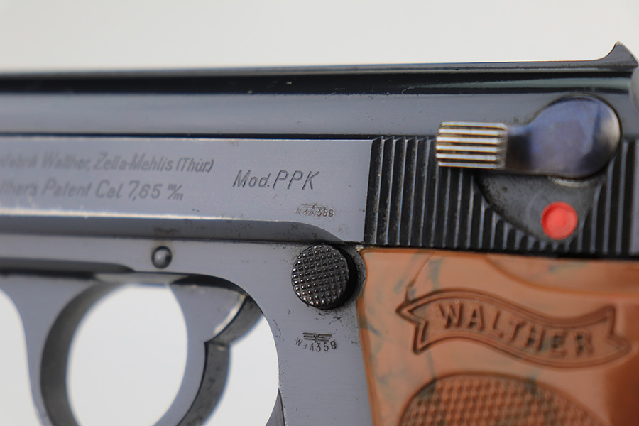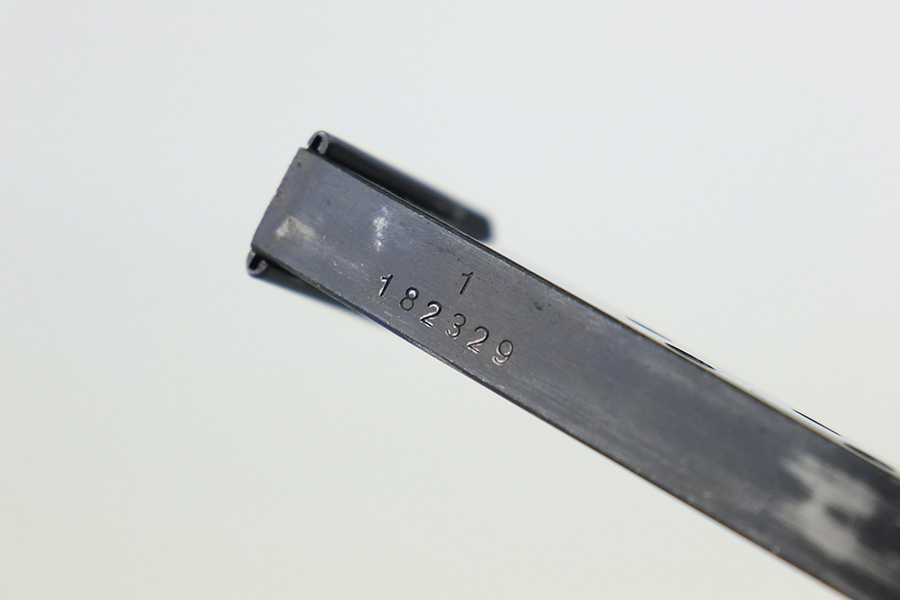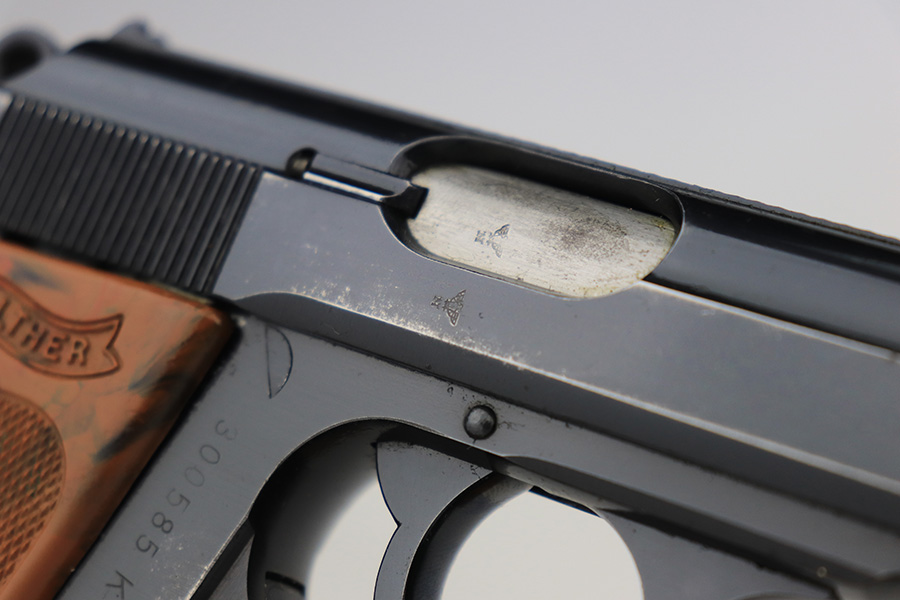 3/10/23 – This is an excellent example of a Walther PPK issued to the Luftwaffe in 1941. It is all matching, has the proper “Waffen 359” proofs on the slide frame, and is in the proper serial range for this variation. It comes with a numbered Luftwaffe magazine that is not matching to the gun. It has retained about 96% of its original high polish finish. There is muzzle wear and some very light spotty wear on the right side of the slide. Small crack in the spine in the grip. Mint bore.