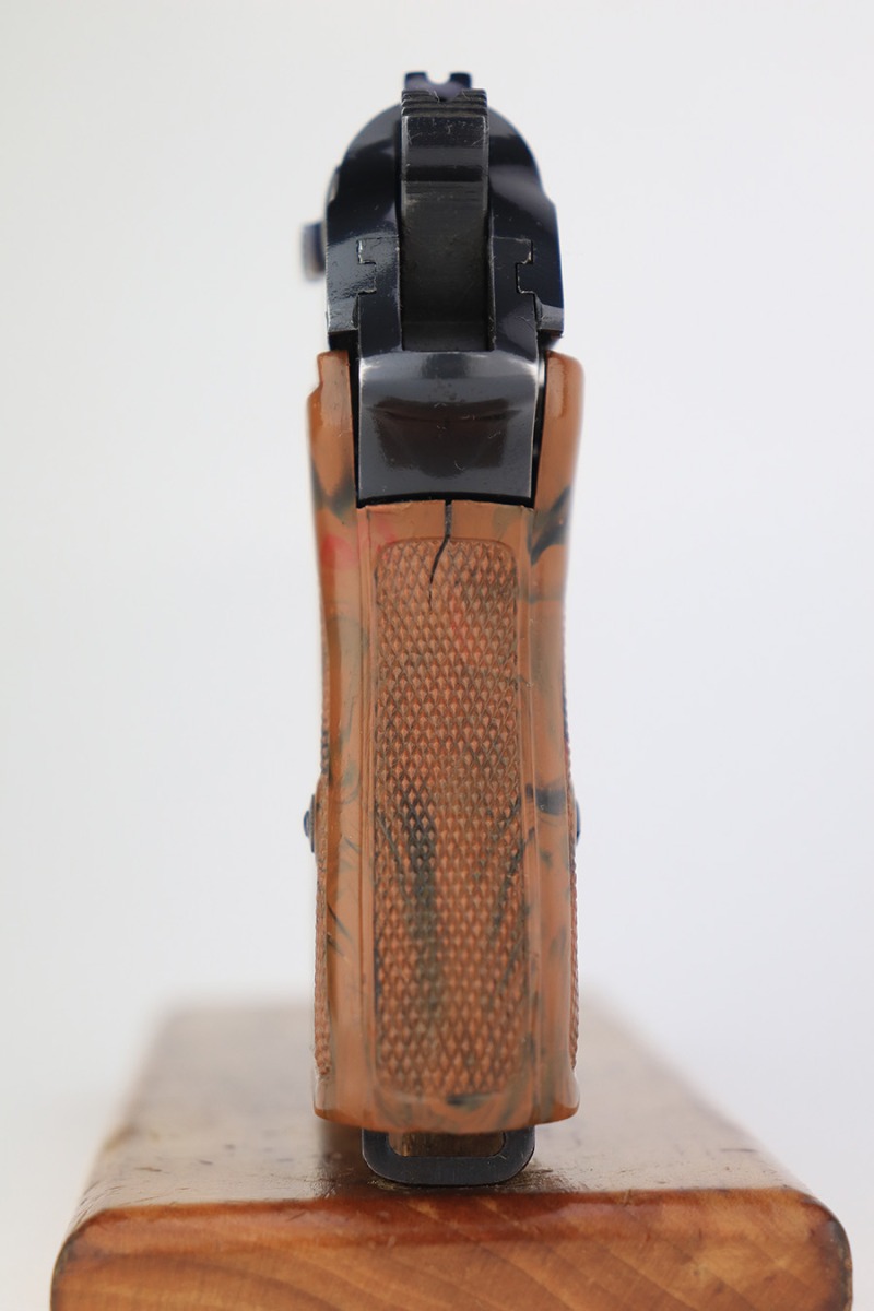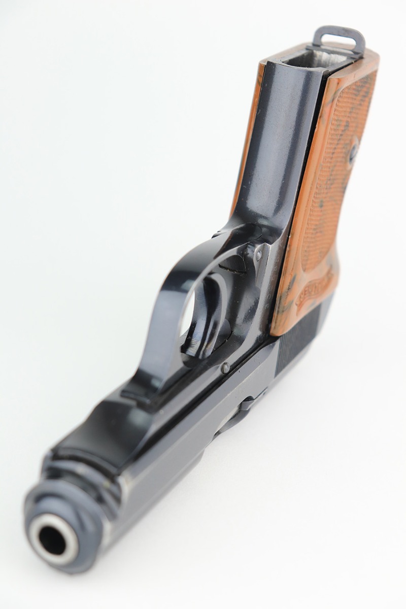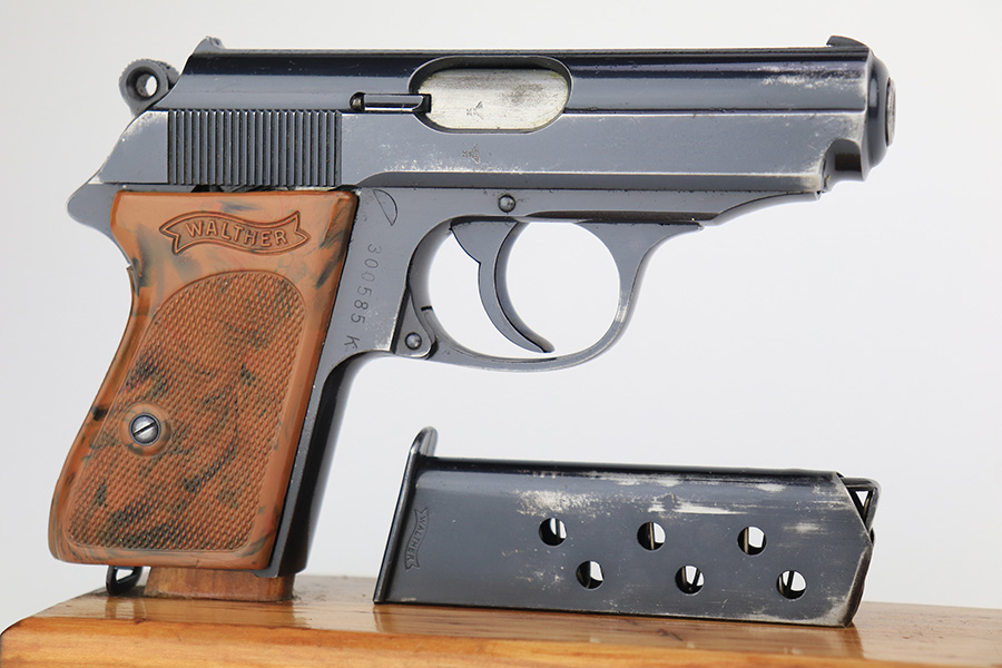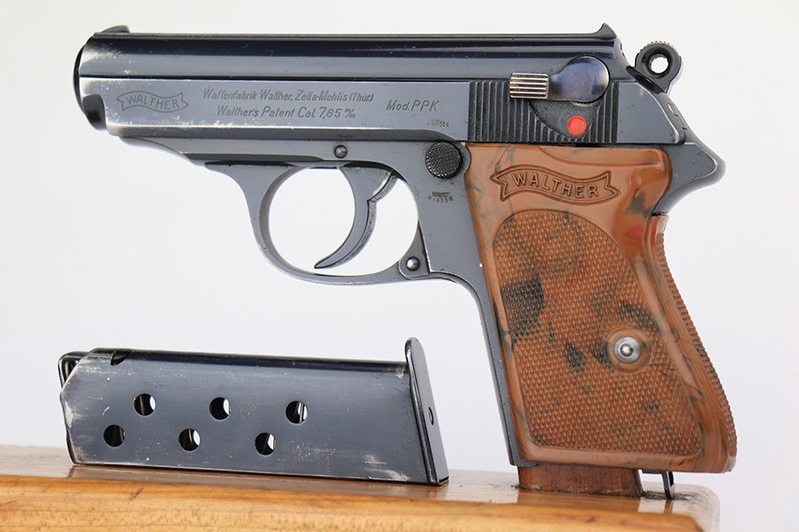 3/10/23 – This is an excellent example of a Walther PPK issued to the Luftwaffe in 1941. It is all matching, has the proper “Waffen 359” proofs on the slide frame, and is in the proper serial range for this variation. It comes with a numbered Luftwaffe magazine that is not matching to the gun. It has retained about 96% of its original high polish finish. There is muzzle wear and some very light spotty wear on the right side of the slide. Small crack in the spine in the grip. Mint bore.