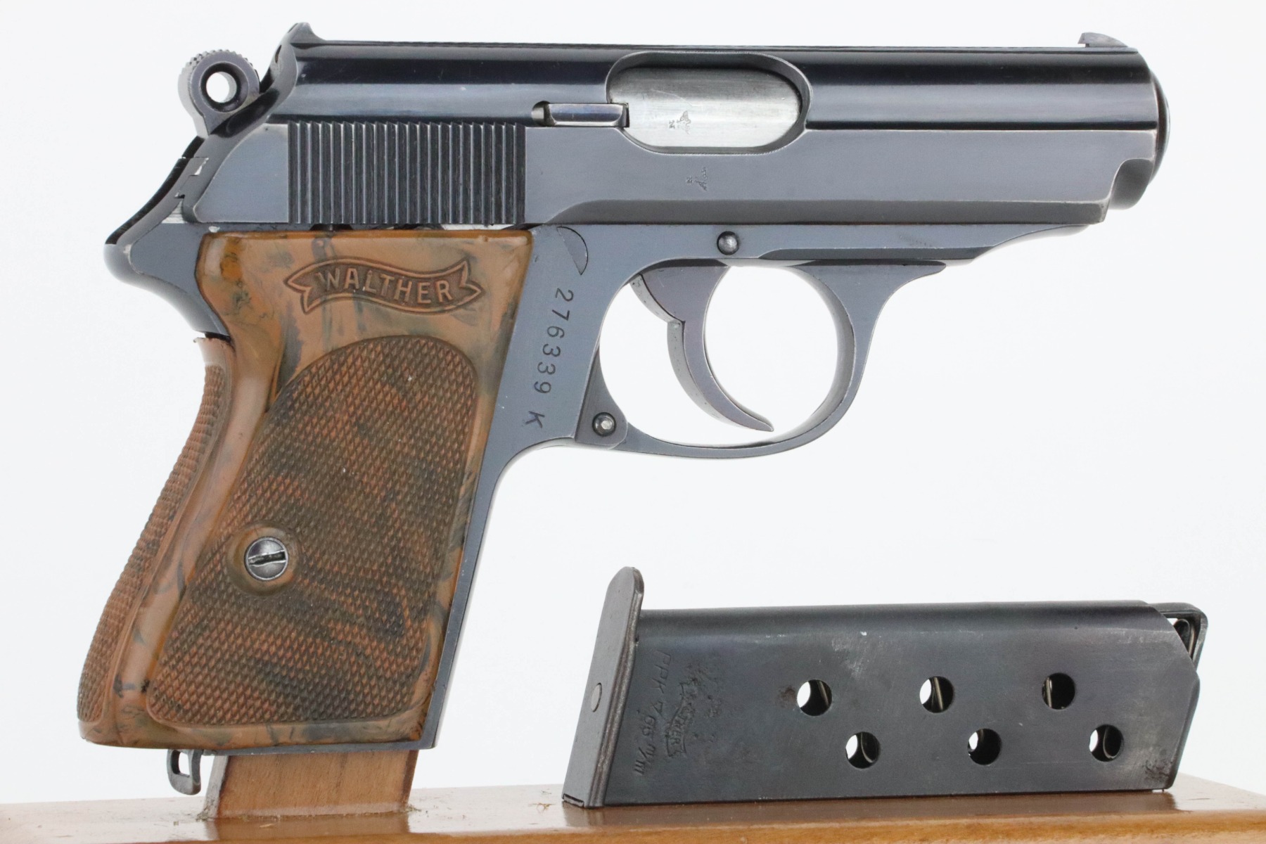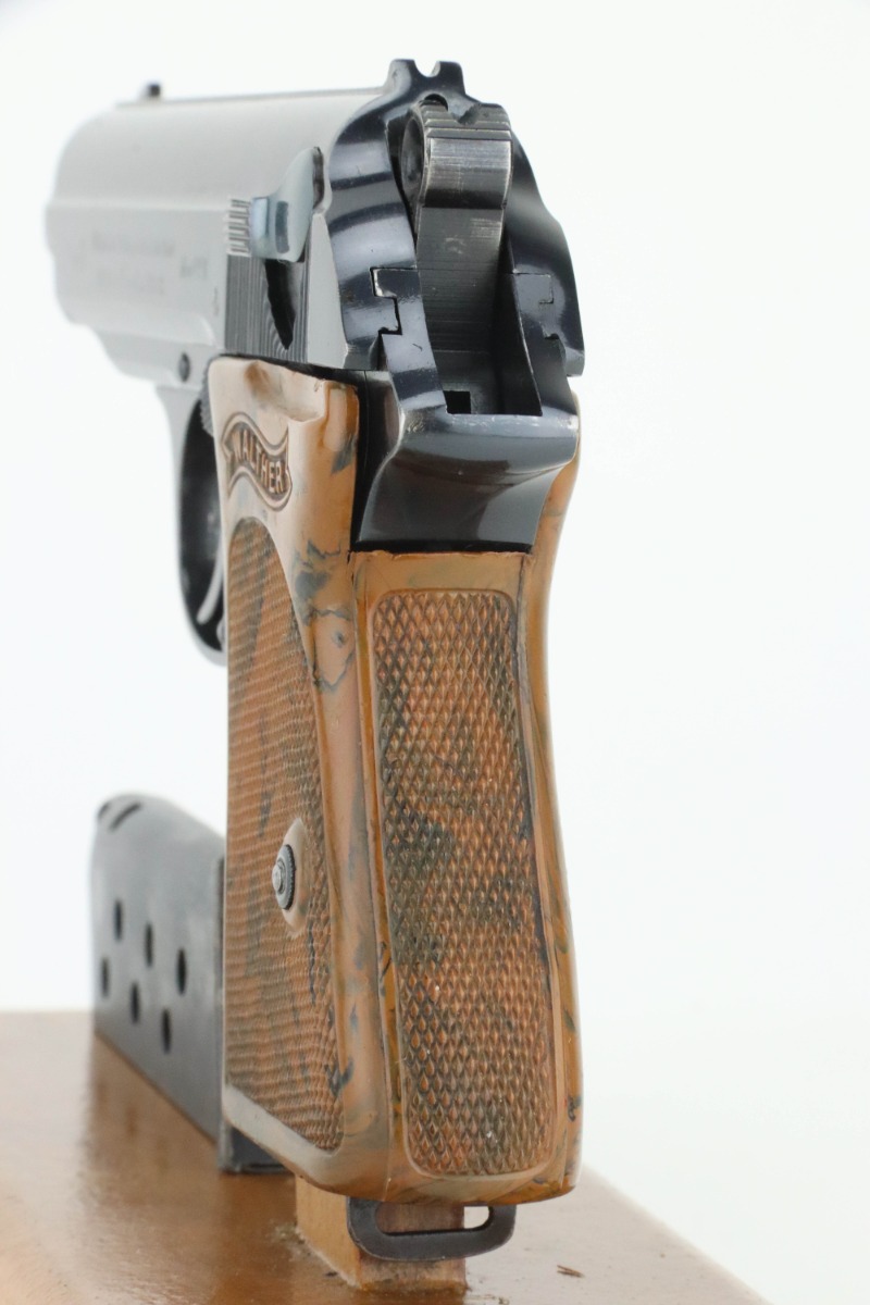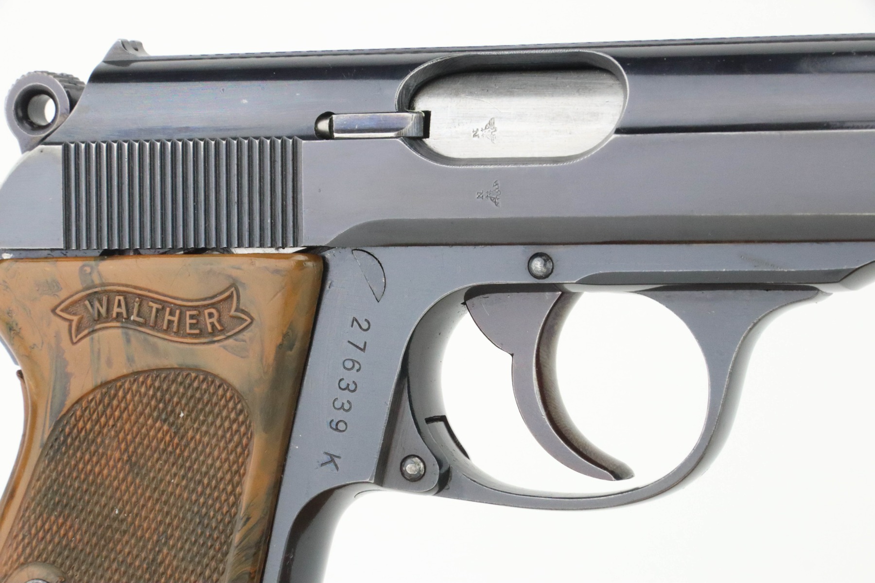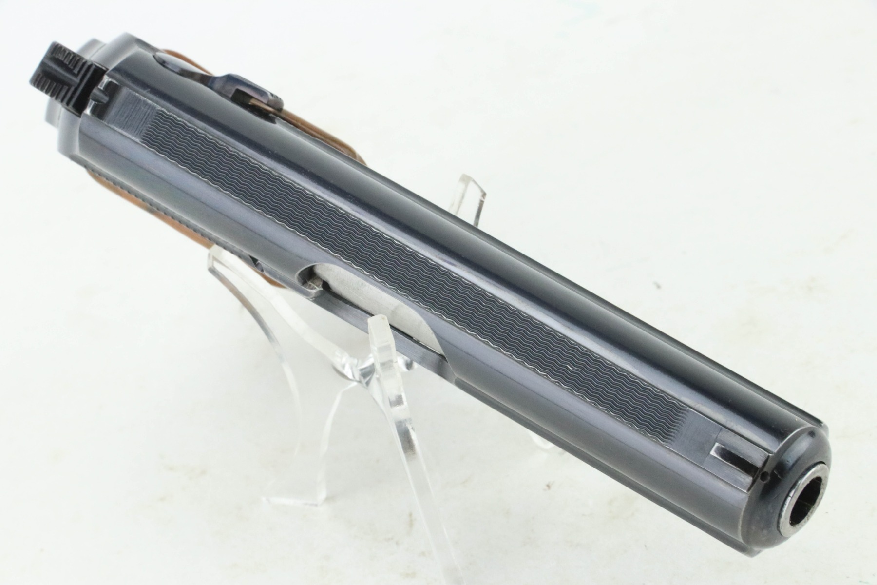 9/18/24 – This is an excellent example of a Walther PPK that was issued to the Luftwaffe in 1940. It is all matching, has the proper “Eagle 359” military proofs on the slide and frame, and is in the correct serial range for a Luftwaffe-issued gun. Comes with an un-numbered magazine. It has retained about 97% of its finish. There is just very minor high edge wear and one small streak of wear on the front strap. Fitted with an excellent period-correct brown bakelite grip. Excellent, shiny bore. Note: The slide has two sets of 3-digit serials in it, one of which matches the frame.