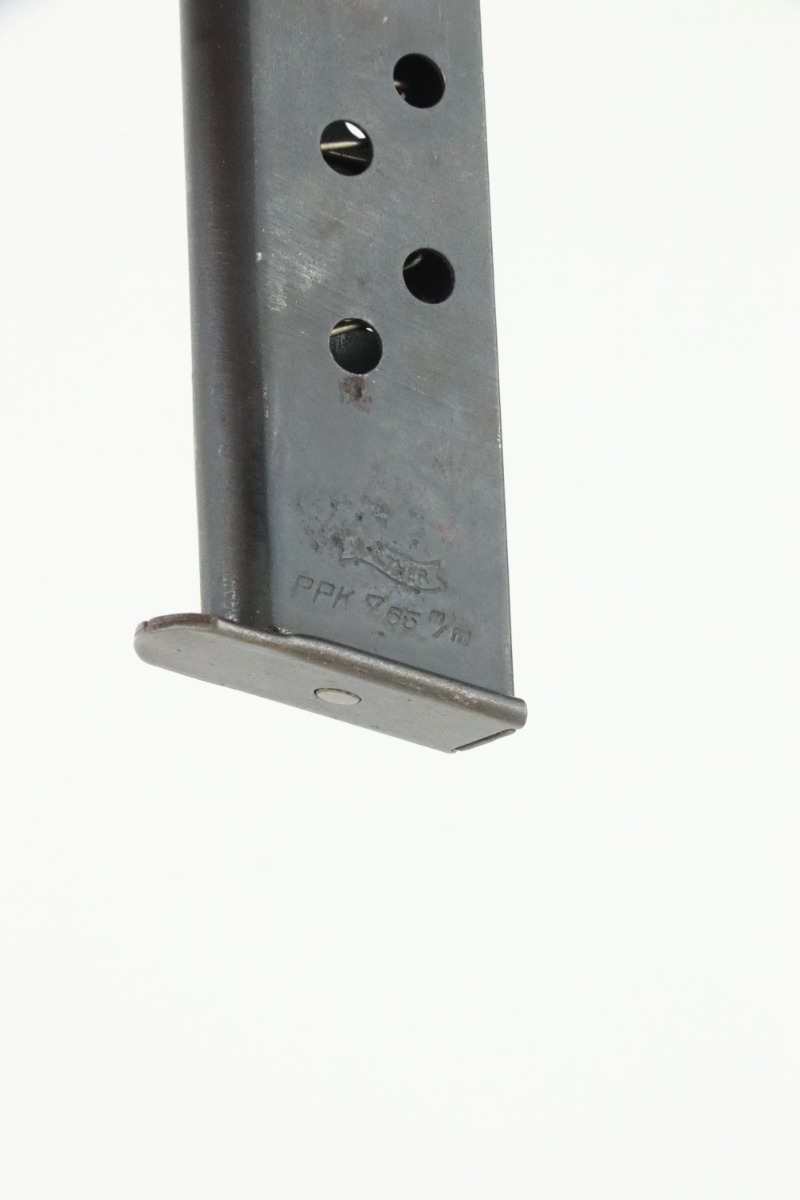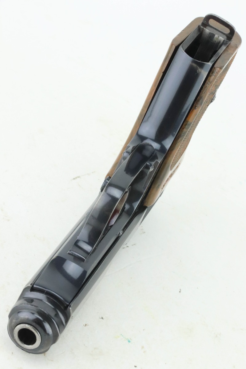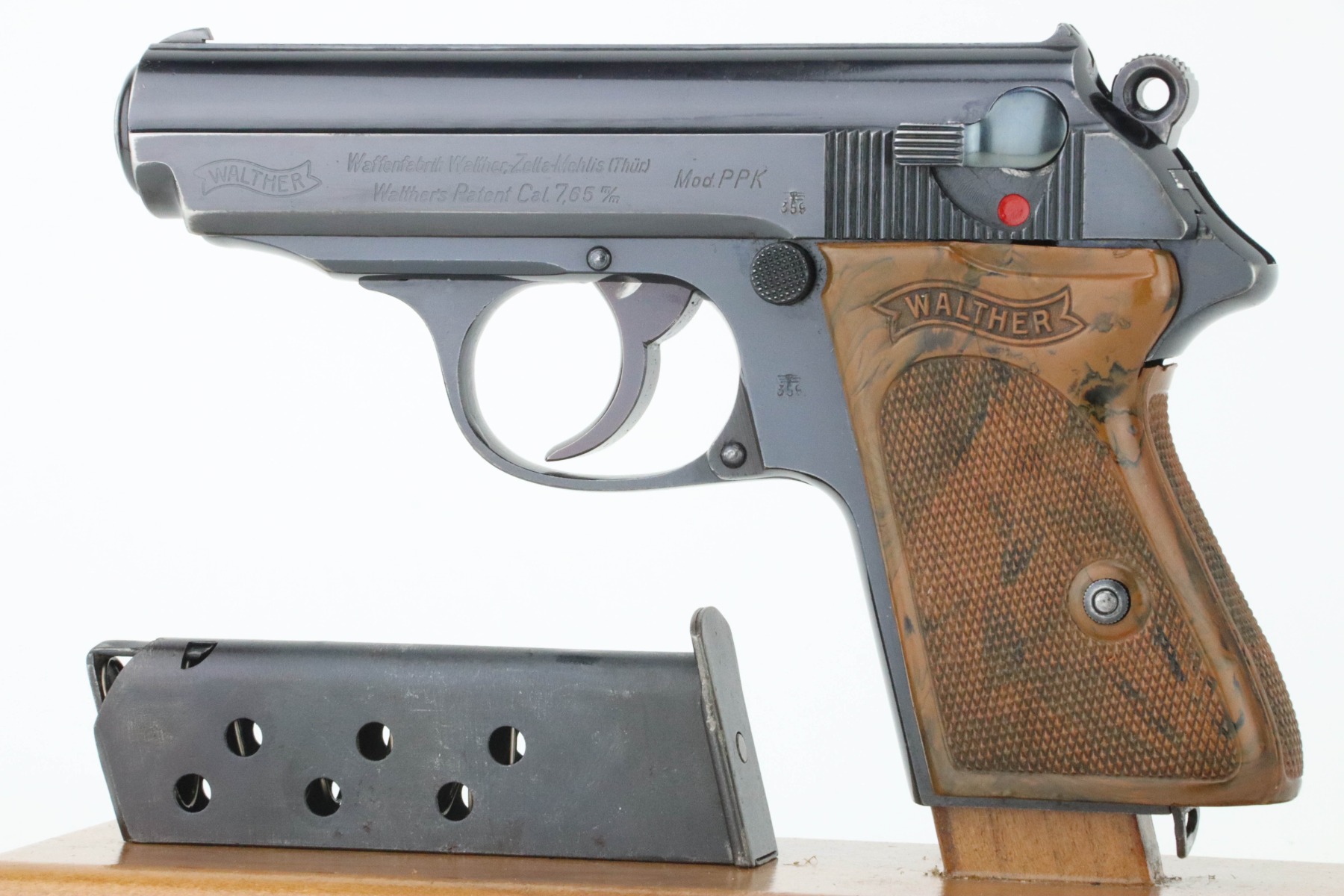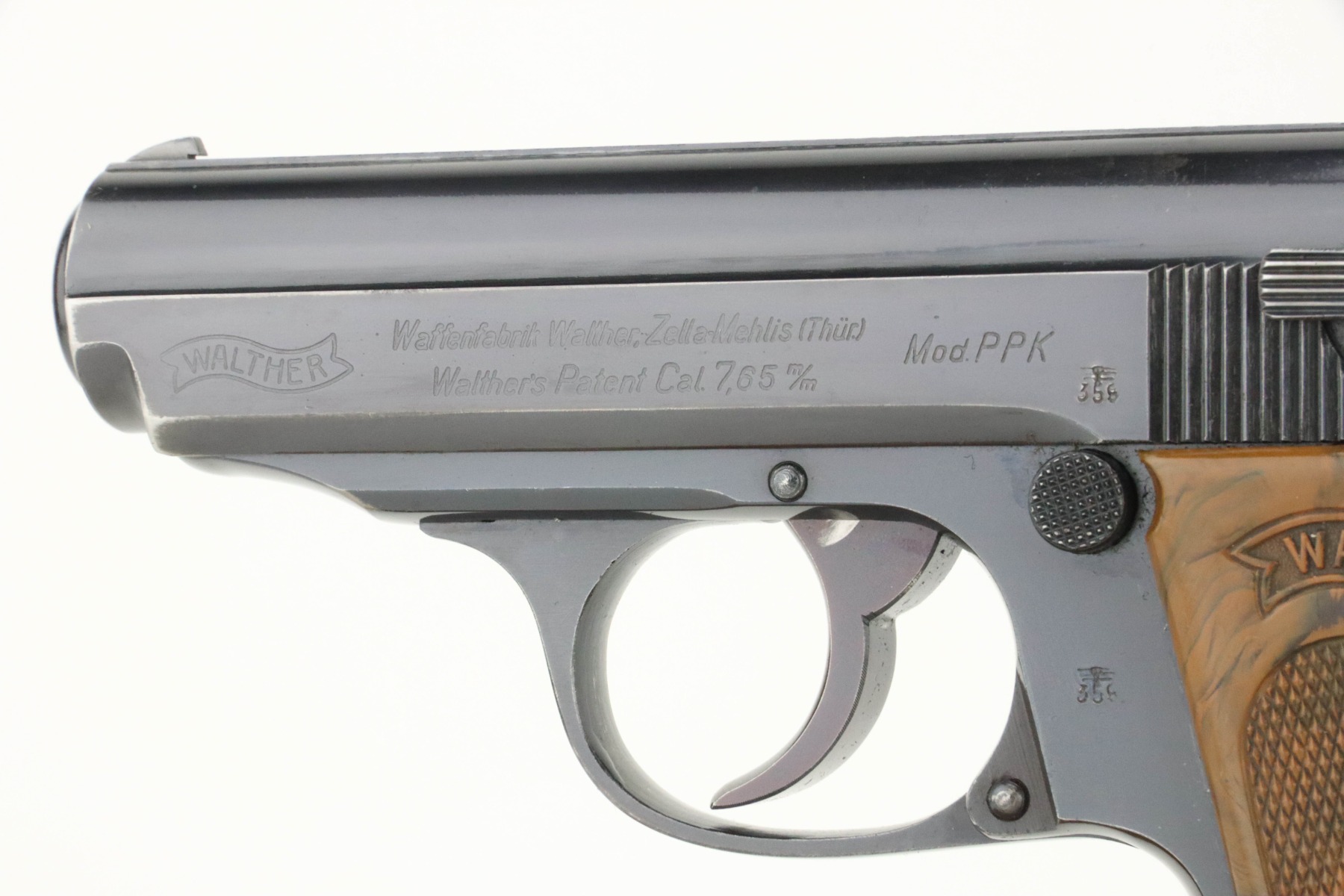 9/18/24 – This is an excellent example of a Walther PPK that was issued to the Luftwaffe in 1940. It is all matching, has the proper “Eagle 359” military proofs on the slide and frame, and is in the correct serial range for a Luftwaffe-issued gun. Comes with an un-numbered magazine. It has retained about 97% of its finish. There is just very minor high edge wear and one small streak of wear on the front strap. Fitted with an excellent period-correct brown bakelite grip. Excellent, shiny bore. Note: The slide has two sets of 3-digit serials in it, one of which matches the frame.