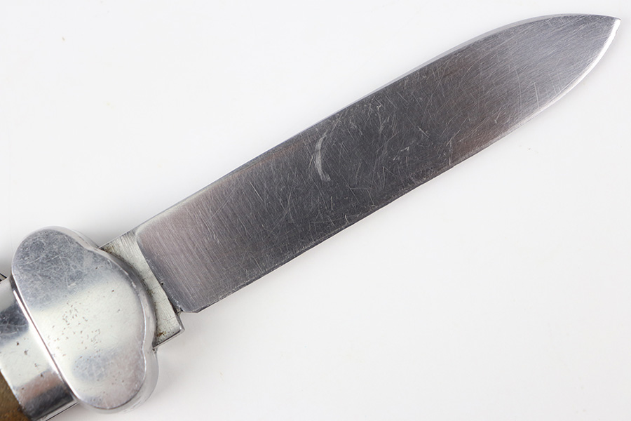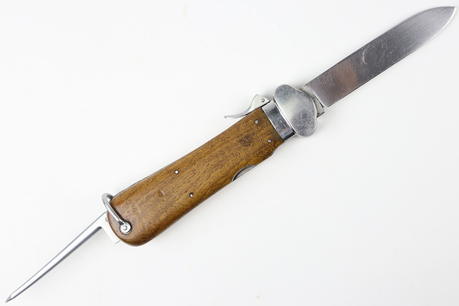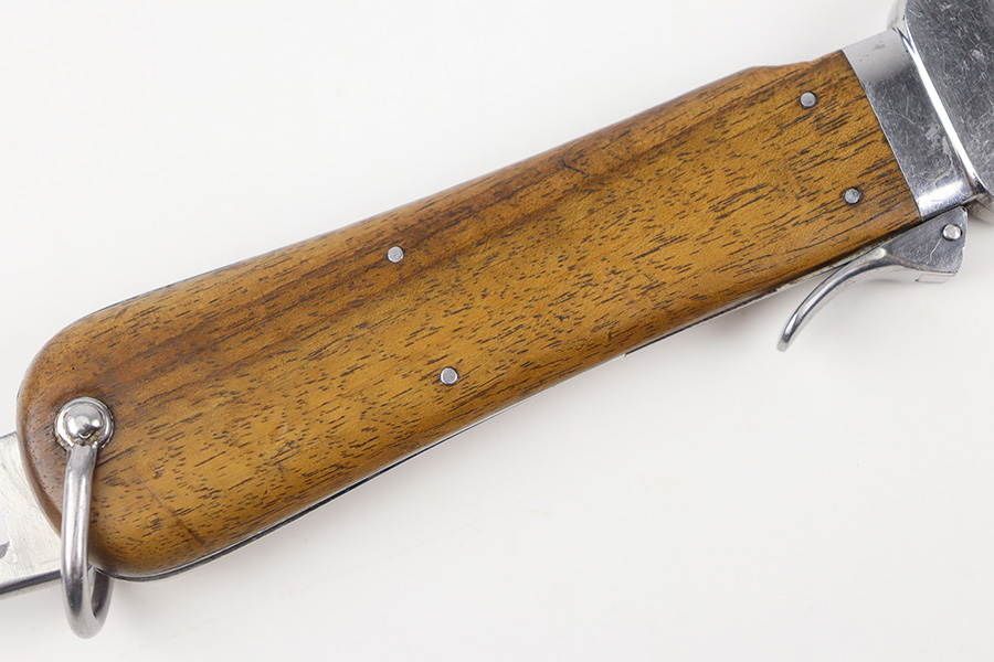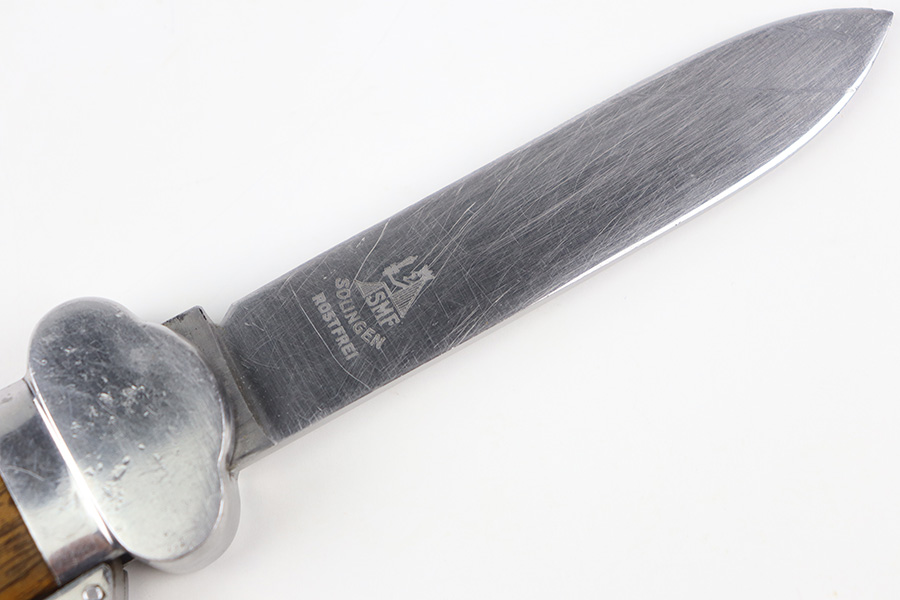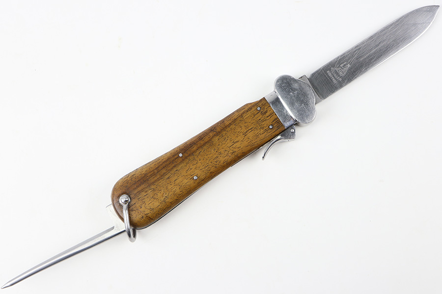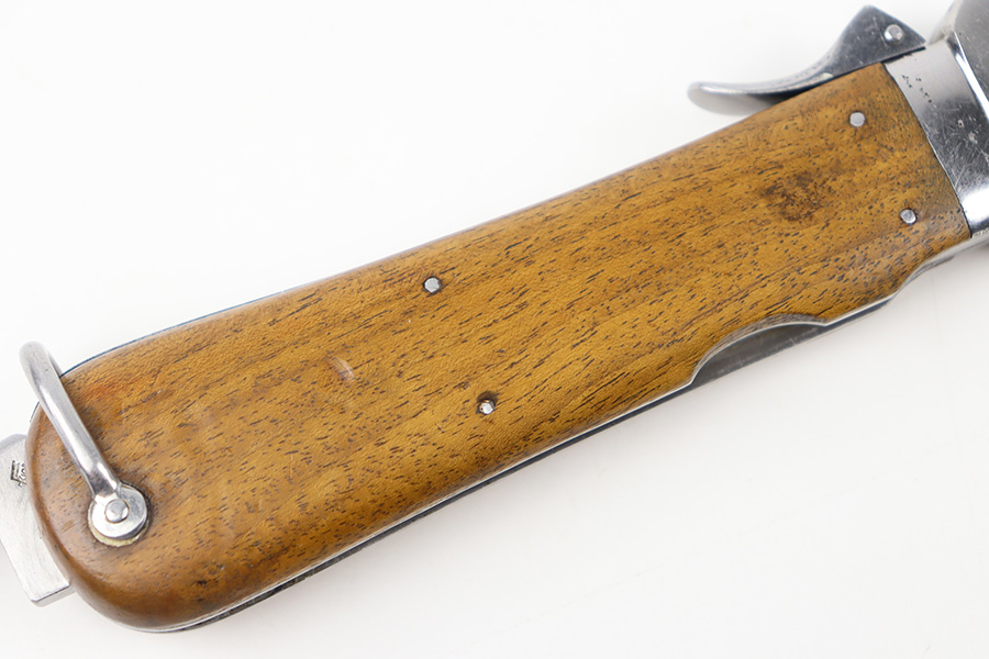 11/6/23 – This is an excellent condition Luftwaffe Gravity knife from WW2. This example has a clean blade, nice handle, and smooth lockup / functionality. The blade has some mild surface scratches and scuffs, but is clean throughout with a SMF maker stamp and visible cross-graining. The mouth of the handle has some light speckling and natural patina, but minimal discoloration. The release lever and sidebar are matching numbered, and function well. The wood handle has no cracks or chips. The foldout spike is in great condition as well with a Luftwaffe proof stamp on the base.