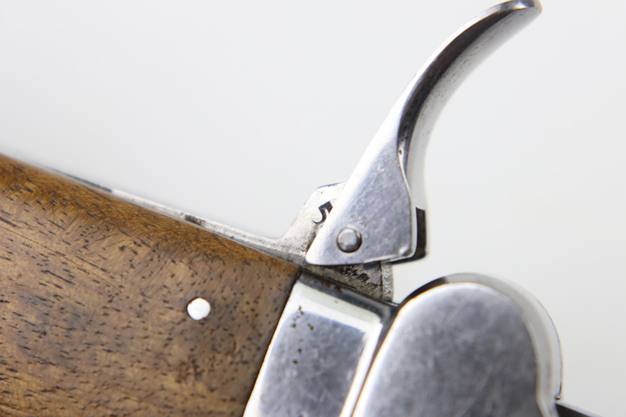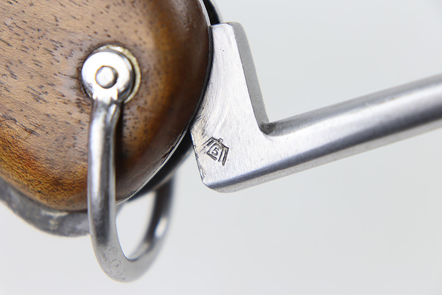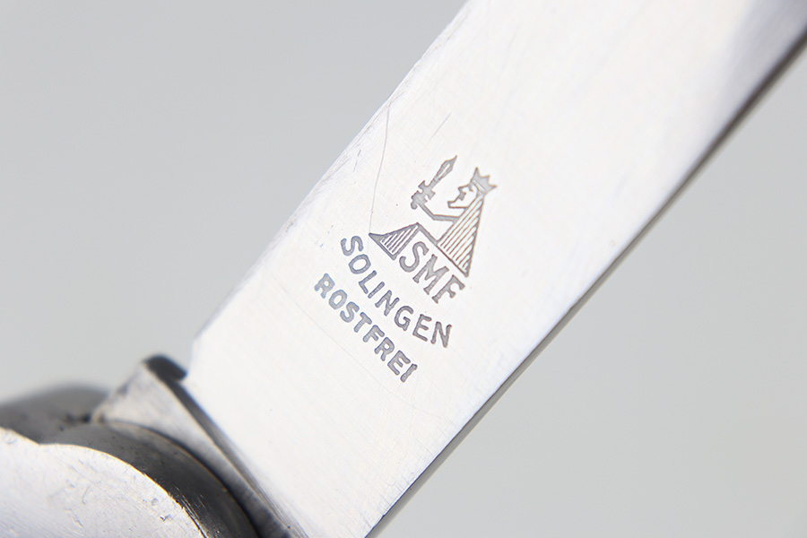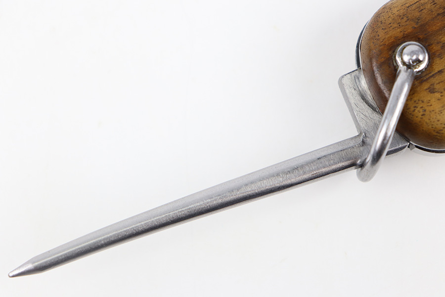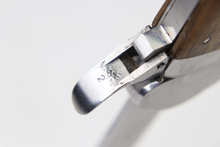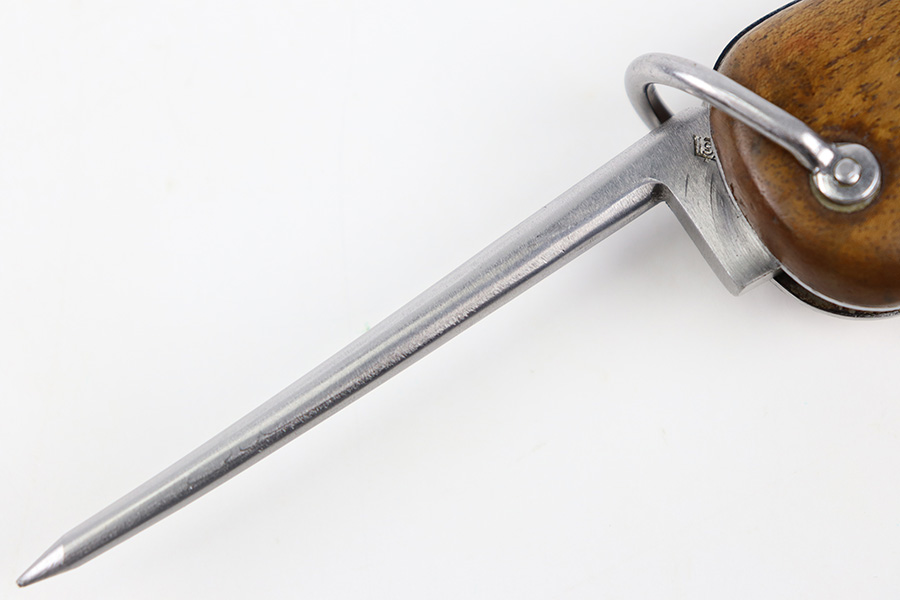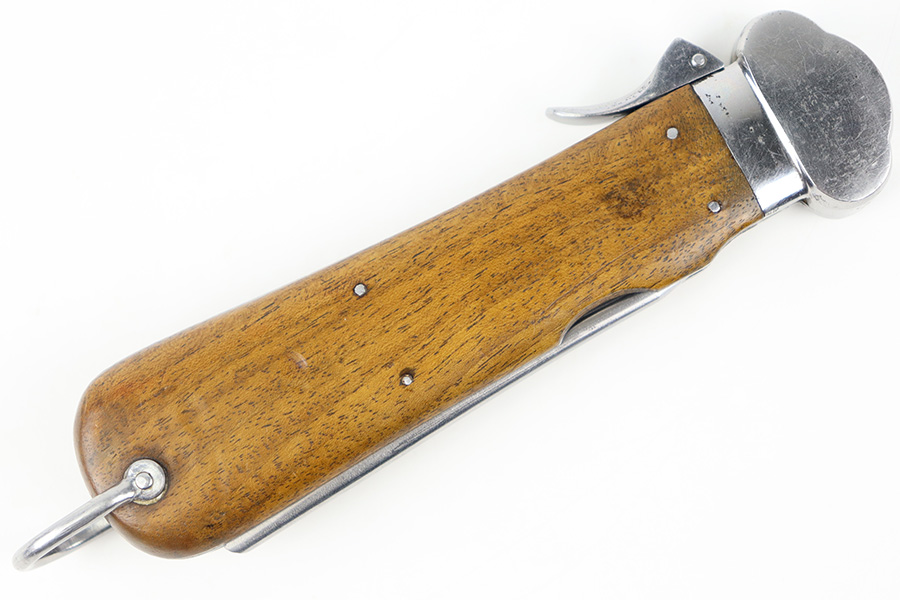 11/6/23 – This is an excellent condition Luftwaffe Gravity knife from WW2. This example has a clean blade, nice handle, and smooth lockup / functionality. The blade has some mild surface scratches and scuffs, but is clean throughout with a SMF maker stamp and visible cross-graining. The mouth of the handle has some light speckling and natural patina, but minimal discoloration. The release lever and sidebar are matching numbered, and function well. The wood handle has no cracks or chips. The foldout spike is in great condition as well with a Luftwaffe proof stamp on the base.