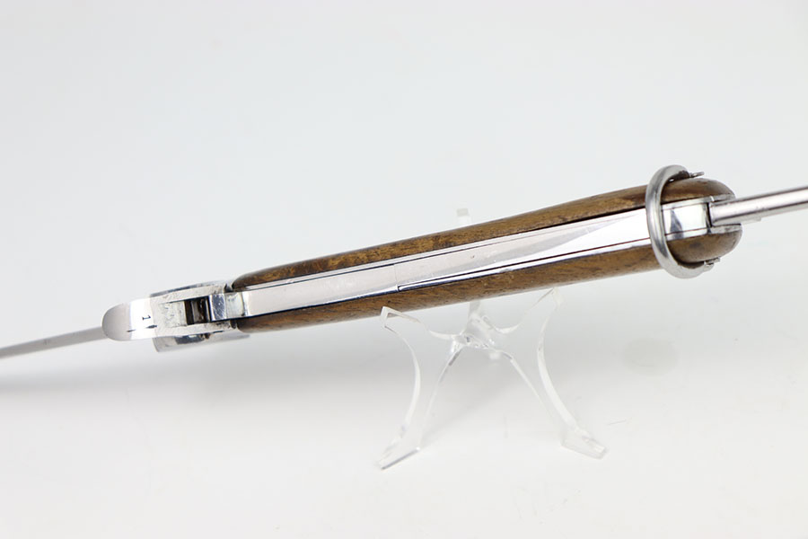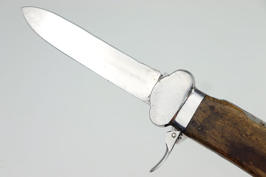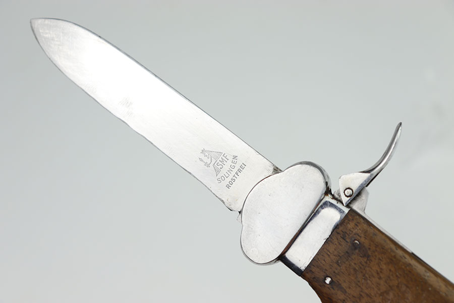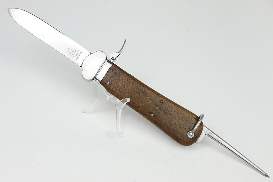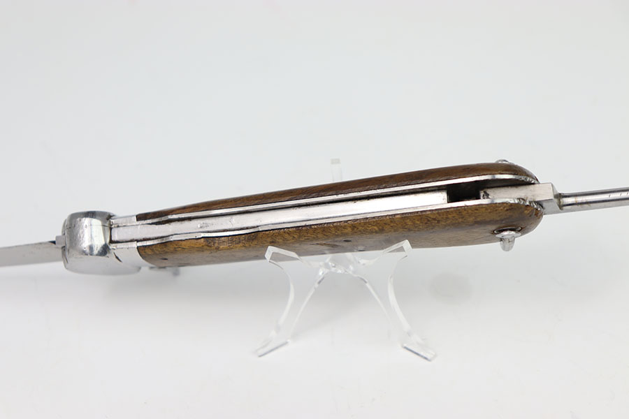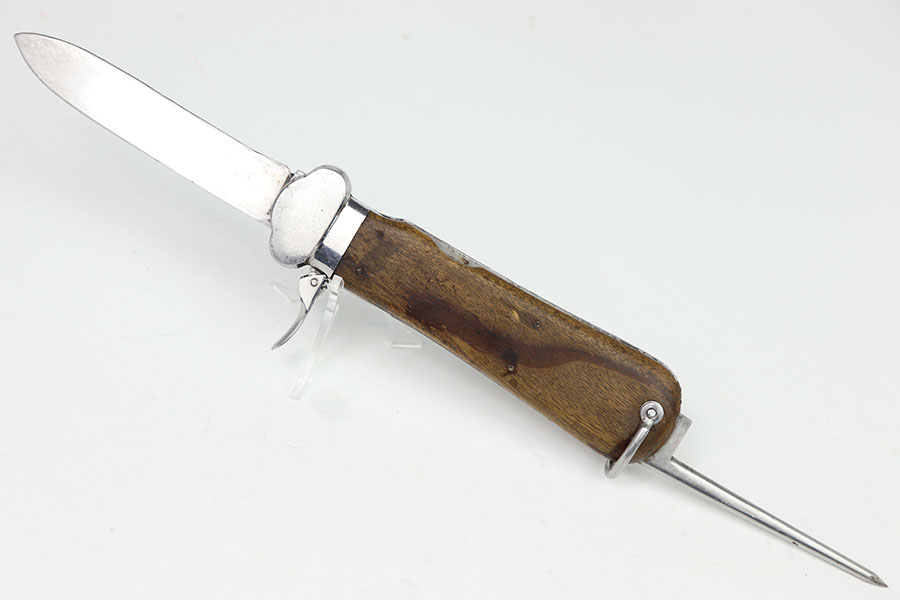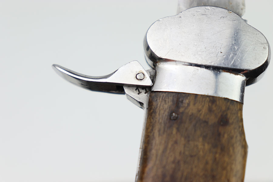 3/28/24 – This is an excellent example of a Luftwaffe Paratrooper / Fallschirmjager Gravity Knife from WW2. This example has a clean blade, nice handle, smooth action, lockup, and functionality. The blade has some mild surface scratches and scuffs, but is clean throughout with a SMF maker stamp and visible cross-graining. Sharpened edge. The release lever and sidebar are matching numbered, and function well. The wood handle has no cracks. Although it does have three minor dents, one on the right and two on the left (see photos). The wood handle and frame has some chips/dents on the bottom right where the foldout spike pivots, mainly on the right side. The foldout spike is in excellent condition as well with a Luftwaffe proof stamp on the base.