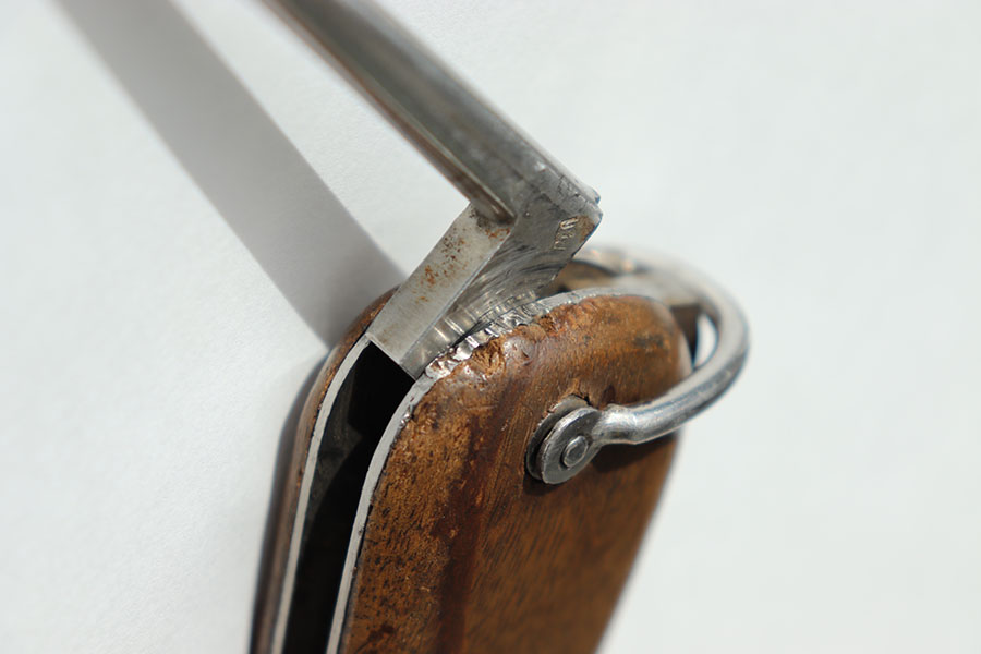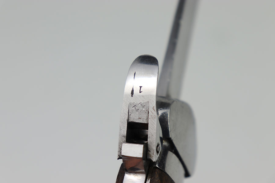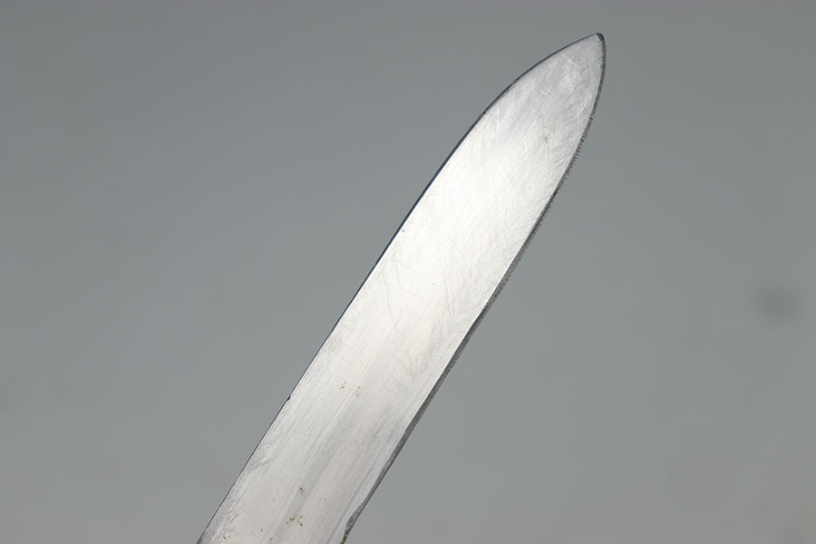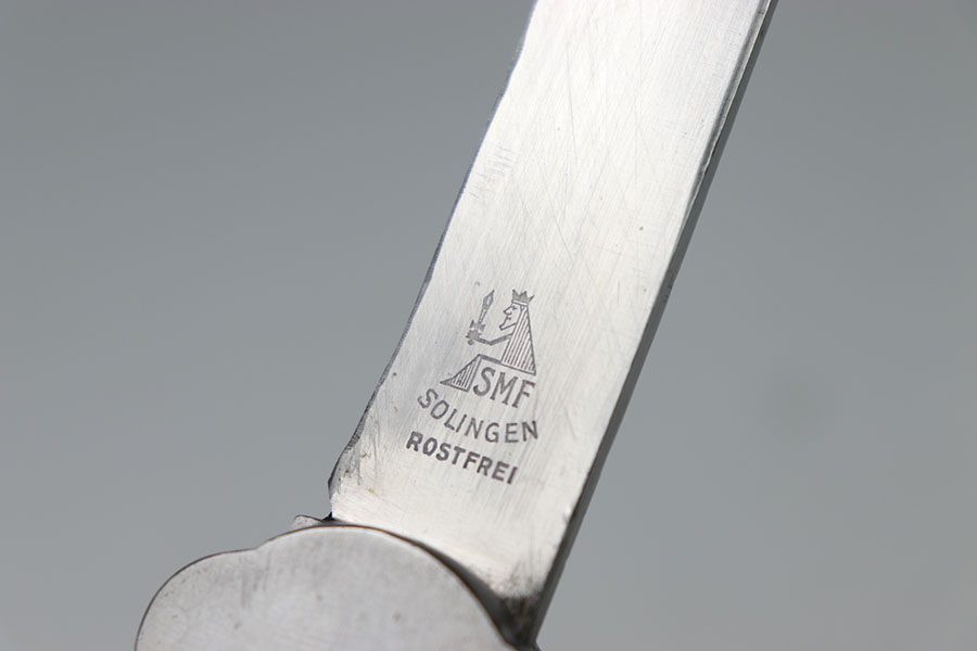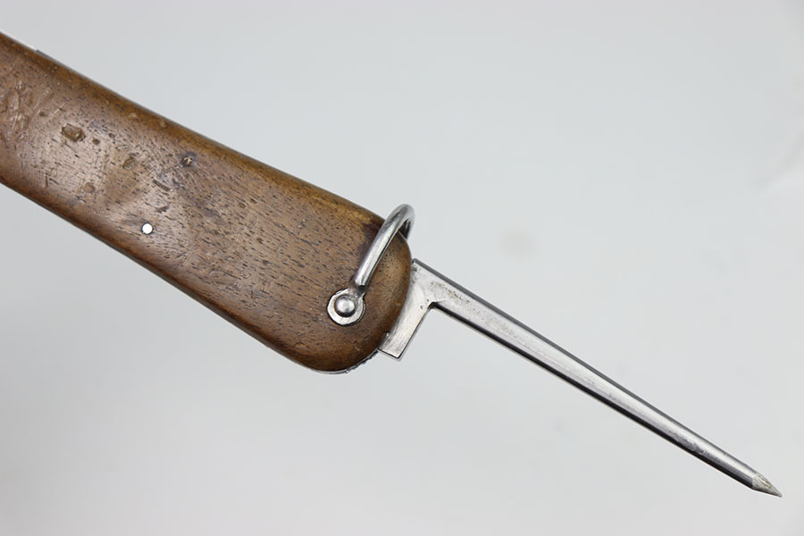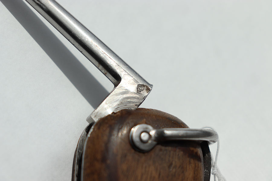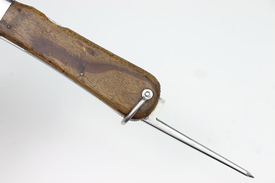3/28/24 – This is an excellent example of a Luftwaffe Paratrooper / Fallschirmjager Gravity Knife from WW2. This example has a clean blade, nice handle, smooth action, lockup, and functionality. The blade has some mild surface scratches and scuffs, but is clean throughout with a SMF maker stamp and visible cross-graining. Sharpened edge. The release lever and sidebar are matching numbered, and function well. The wood handle has no cracks. Although it does have three minor dents, one on the right and two on the left (see photos). The wood handle and frame has some chips/dents on the bottom right where the foldout spike pivots, mainly on the right side. The foldout spike is in excellent condition as well with a Luftwaffe proof stamp on the base.