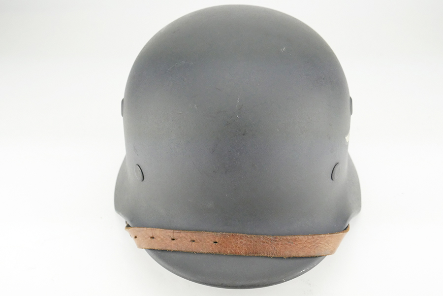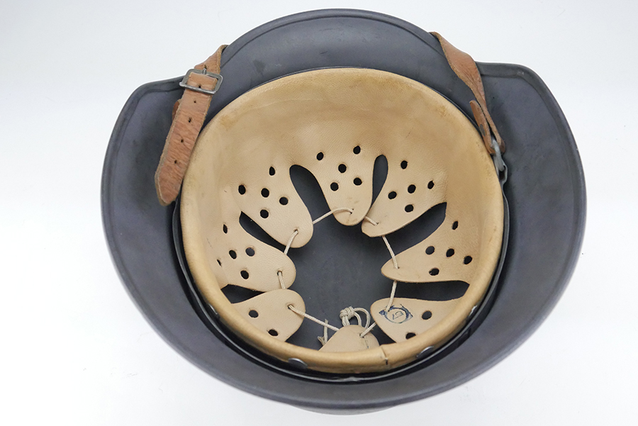 9/4/24 – This is an excellent example of a M40 Luftwaffe helmet. The helmet is in excellent condition and maintains 99% of its original finish, and has no dents. The Luftwaffe Eagle decal in in excellent condition. The original chinstrap is also still present on this helmet and also in excellent condition. The helmet has the standard M31 8 finger liner with it’s original drawstring. The left rim of the helmet is marked Q64, and the back neck guard is marked DN212.