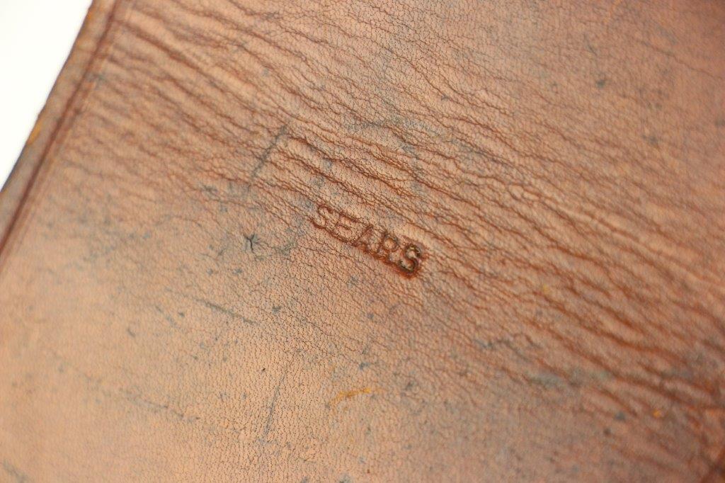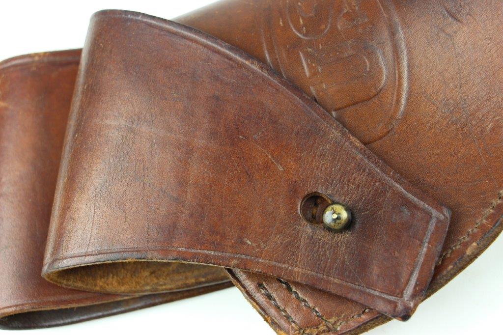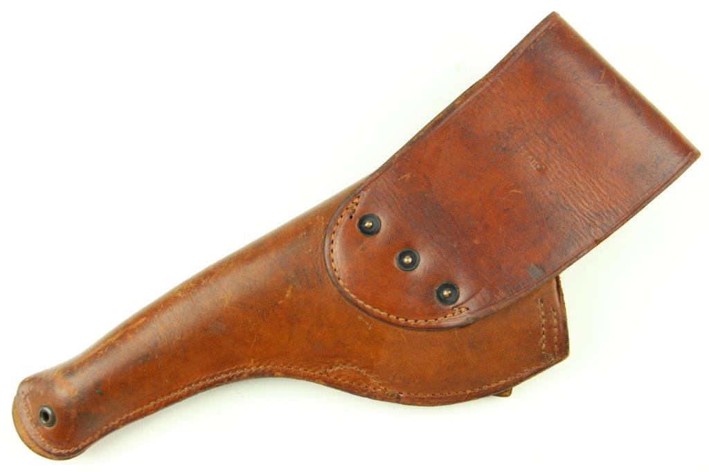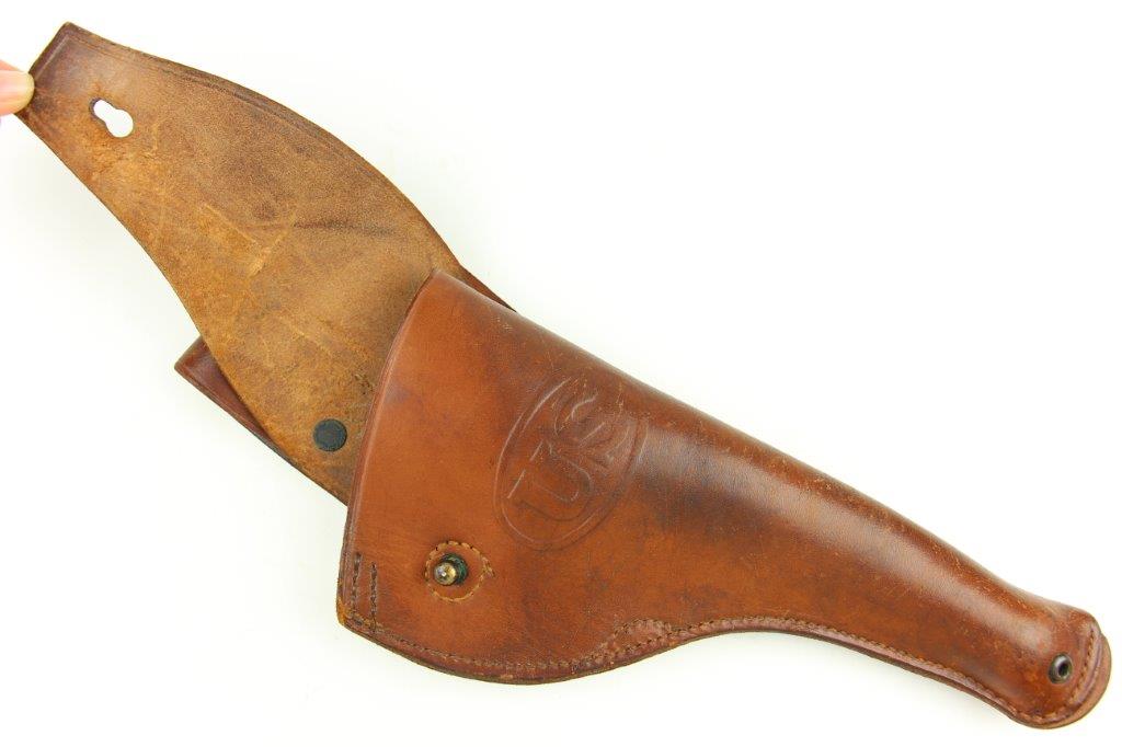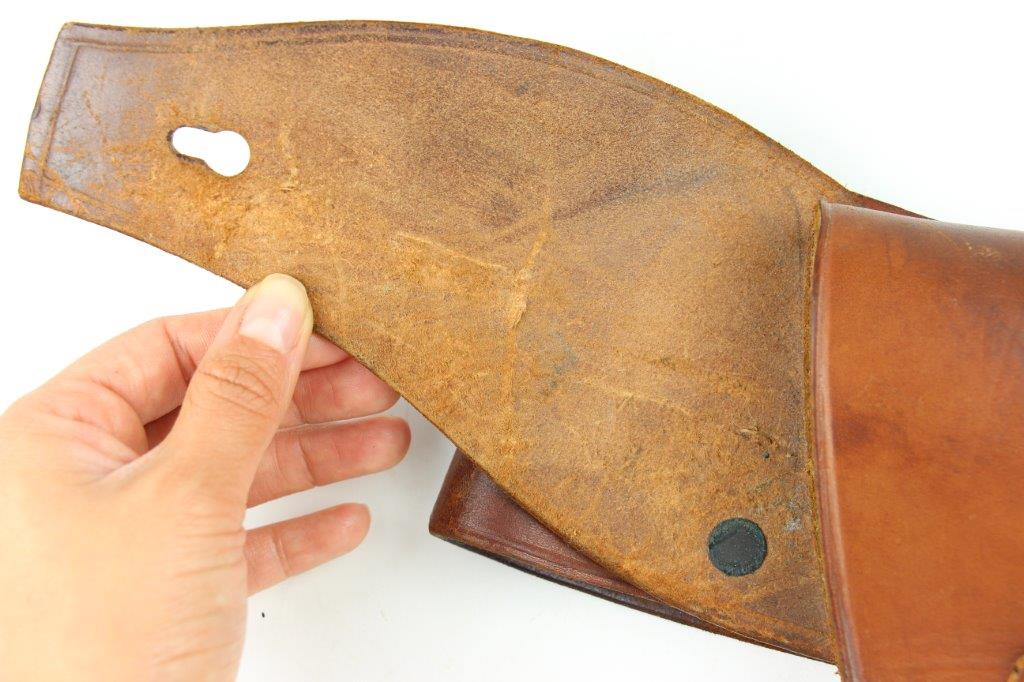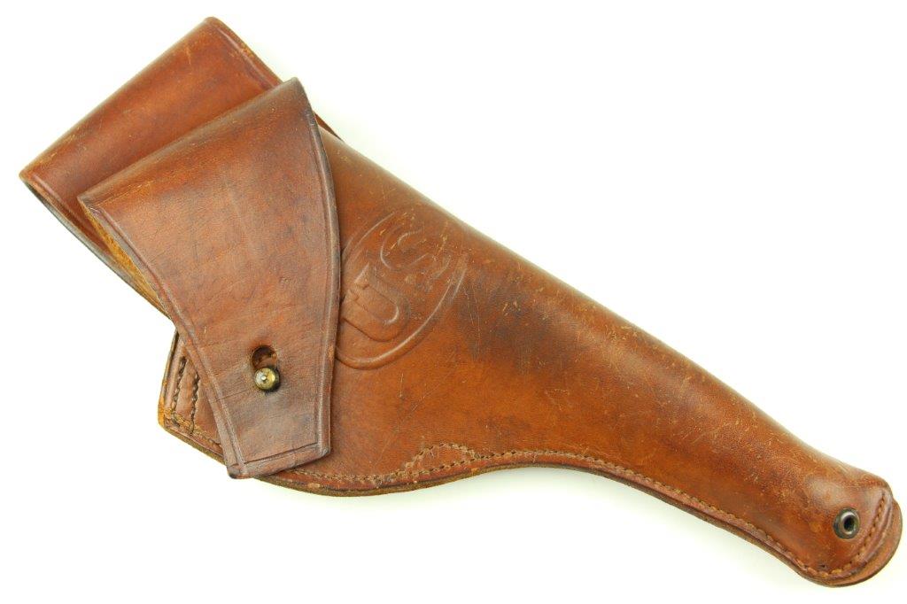 5/25/24 – This is an excellent condition, US M1917 Revolver holster from WW2. The holster is in excellent condition with nice brown leather with normal pliability and some light surface scuffs and scratches from previous use and handling. Excellent, all original stitching intact throughout with no stitching issues. The back leather is maker stamped by “SEARS”. The front leather is “US” stamped. Original brass closure knob and brass lanyard hole in the toe.