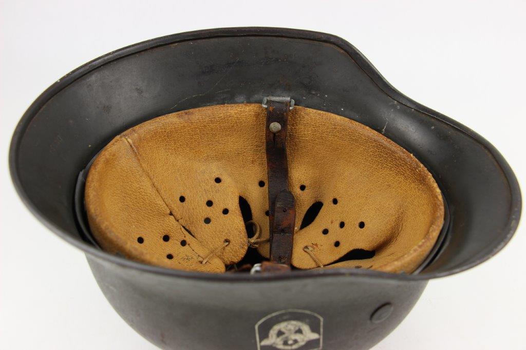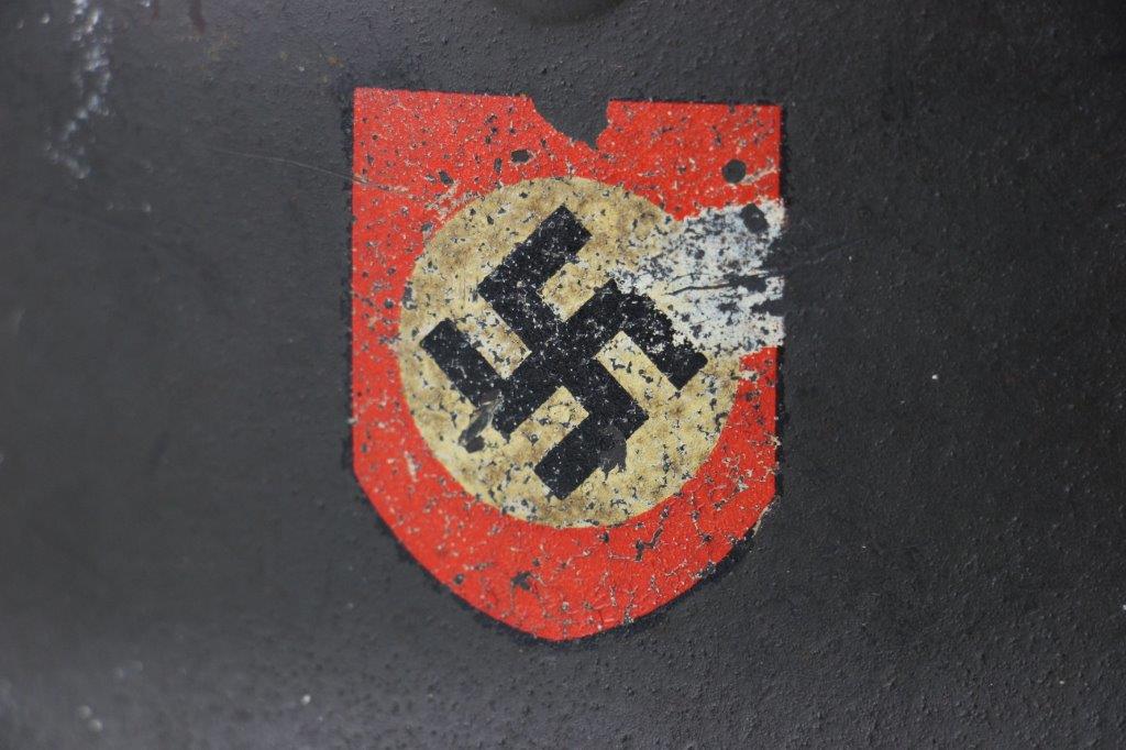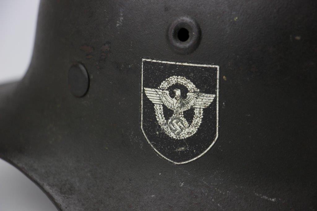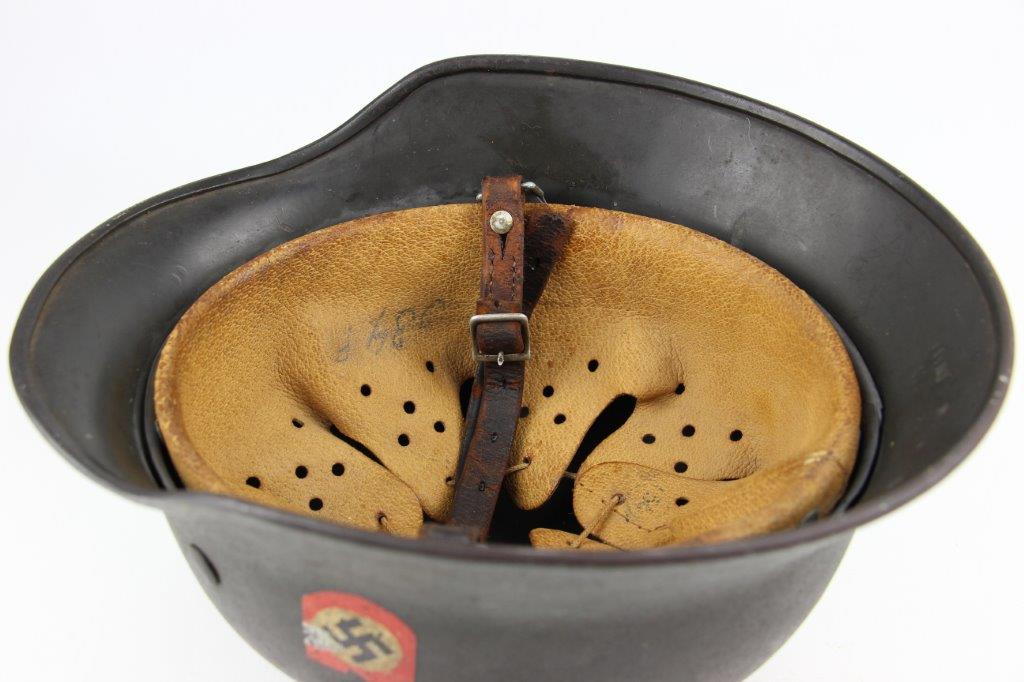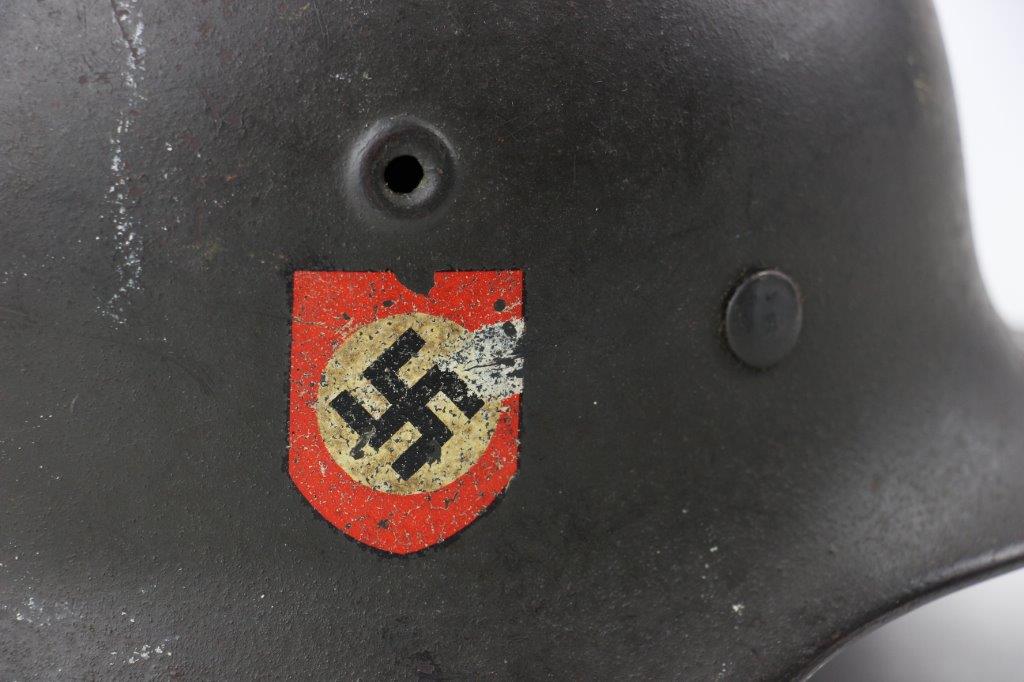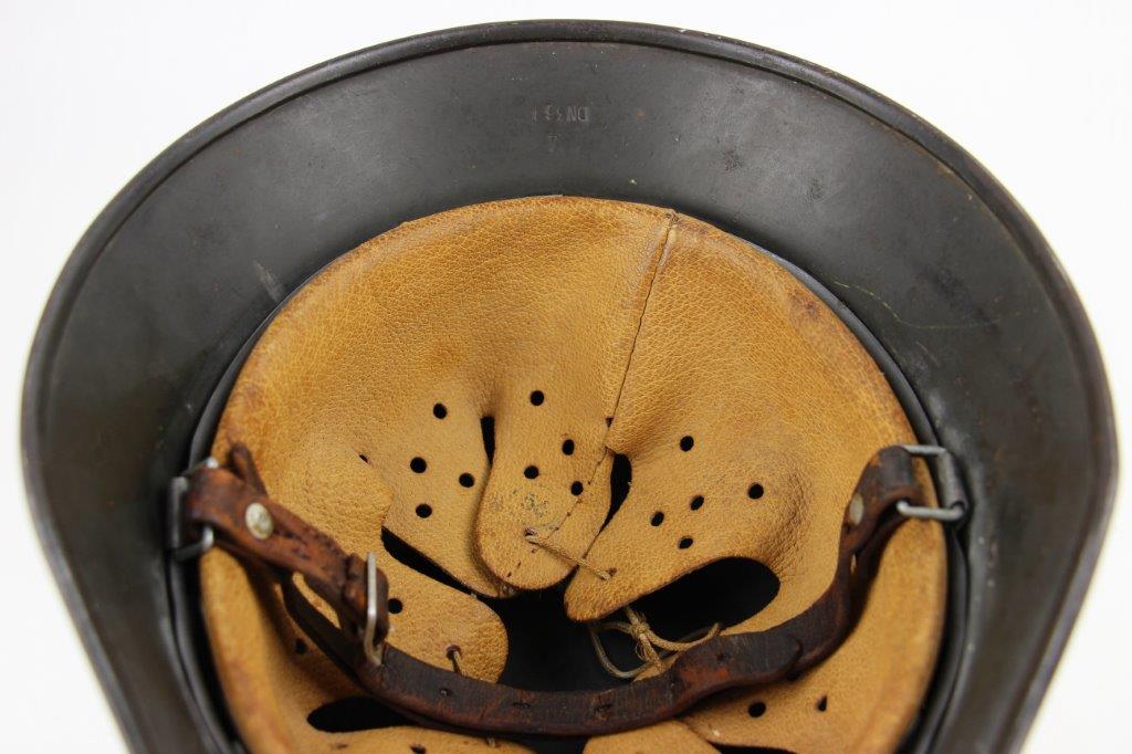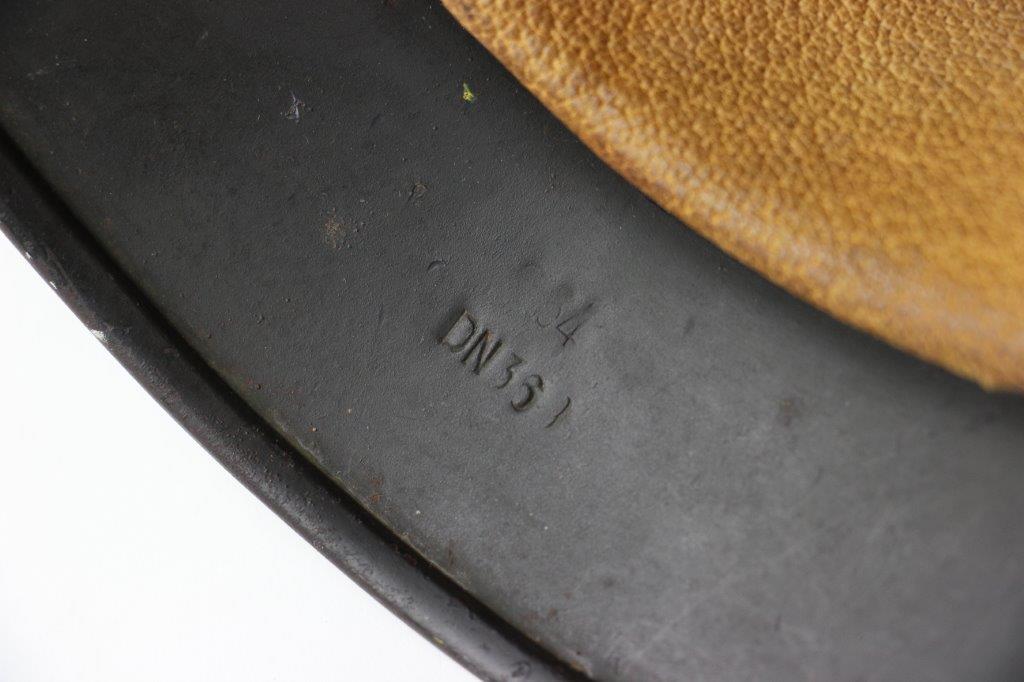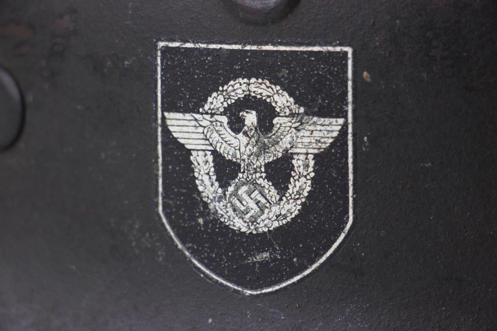 10/1/24 – This is a rare variation M40 Double Decal Combat Police Helmet from WW2. This example is in top-tier condition with excellent original exterior paint, crisp and clean exterior decals, and a minty interior leather liner. The exterior shell has light patina and spotty paint loss mostly around the rim and top crown. The decals are vibrant with the Nazi party shield rating around 80%, and the Police Eagle rating 95%+. Nice detail visible on each decal. The shell interior features an original liner band with a leather chin strap attached to each bale. The chin strap is broken at one end, but still in great overall condition. The back visor of the interior shell is stamped with a faint, “Q 64” (the Q is barely visible, yet original). Underneath the maker stamp is a batch/lot number “DN369” (the 9 is barely visible, but we’ve seen other examples with similar lot numbering and style). The leather liner is soft and pliable, yet in excellent overall condition and strong throughout. Ink stamped size “56” on the liner as shown. A scarce variation combat police helmet in hard-to-upgrade condition.