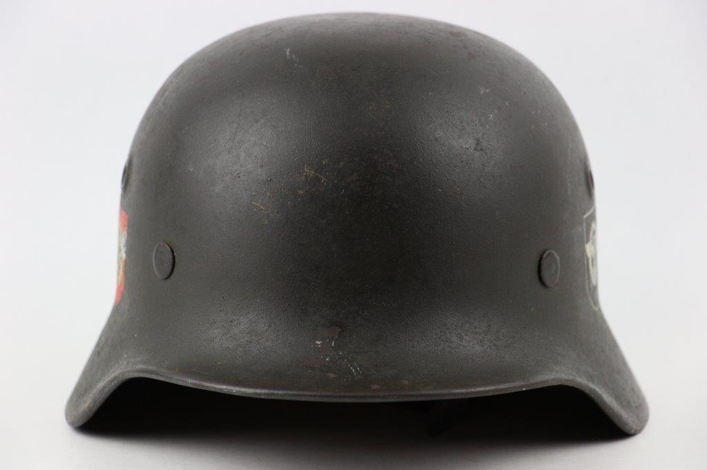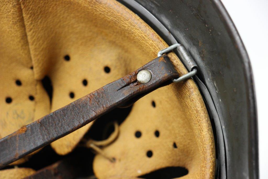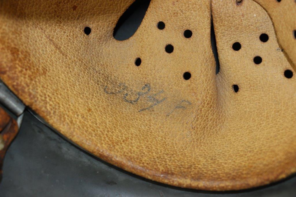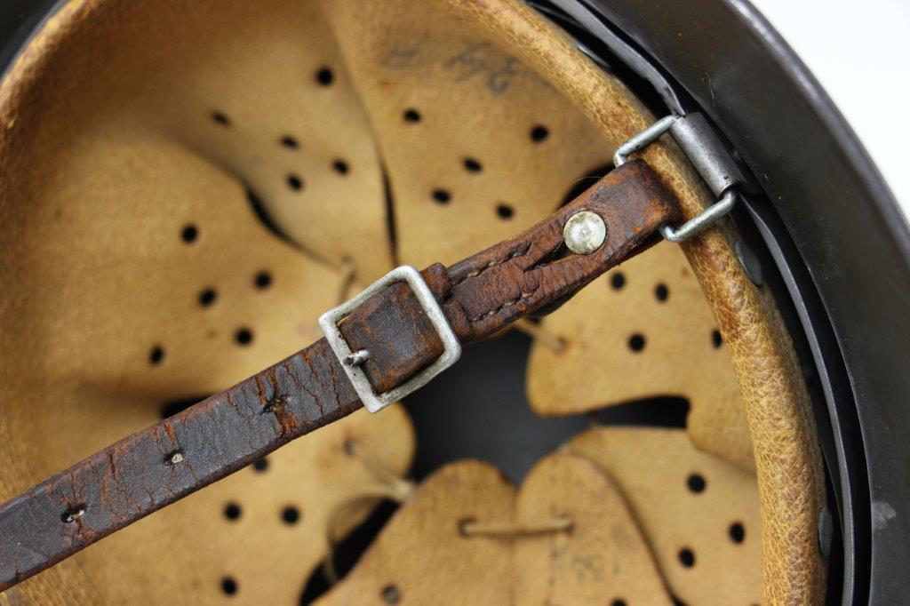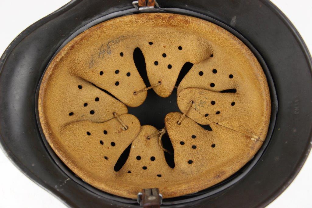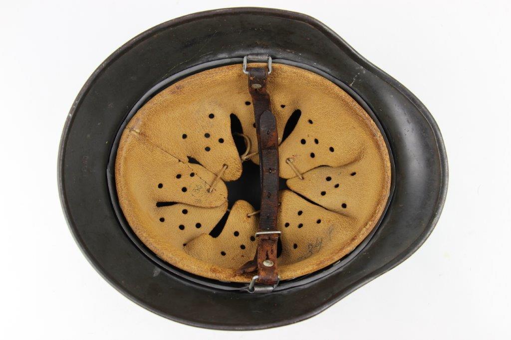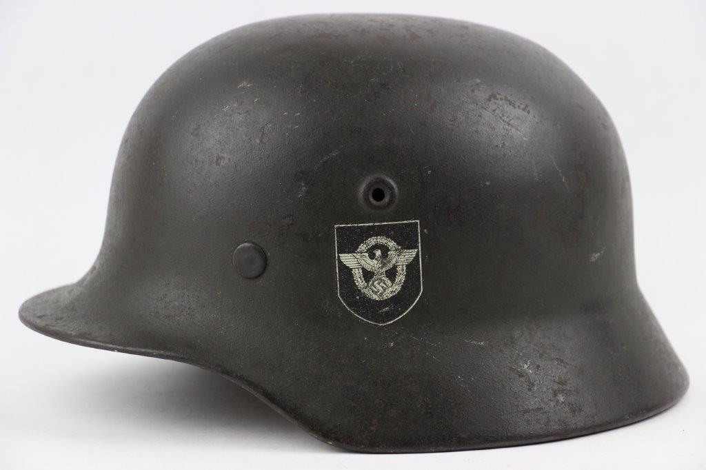 10/1/24 – This is a rare variation M40 Double Decal Combat Police Helmet from WW2. This example is in top-tier condition with excellent original exterior paint, crisp and clean exterior decals, and a minty interior leather liner. The exterior shell has light patina and spotty paint loss mostly around the rim and top crown. The decals are vibrant with the Nazi party shield rating around 80%, and the Police Eagle rating 95%+. Nice detail visible on each decal. The shell interior features an original liner band with a leather chin strap attached to each bale. The chin strap is broken at one end, but still in great overall condition. The back visor of the interior shell is stamped with a faint, “Q 64” (the Q is barely visible, yet original). Underneath the maker stamp is a batch/lot number “DN369” (the 9 is barely visible, but we’ve seen other examples with similar lot numbering and style). The leather liner is soft and pliable, yet in excellent overall condition and strong throughout. Ink stamped size “56” on the liner as shown. A scarce variation combat police helmet in hard-to-upgrade condition.