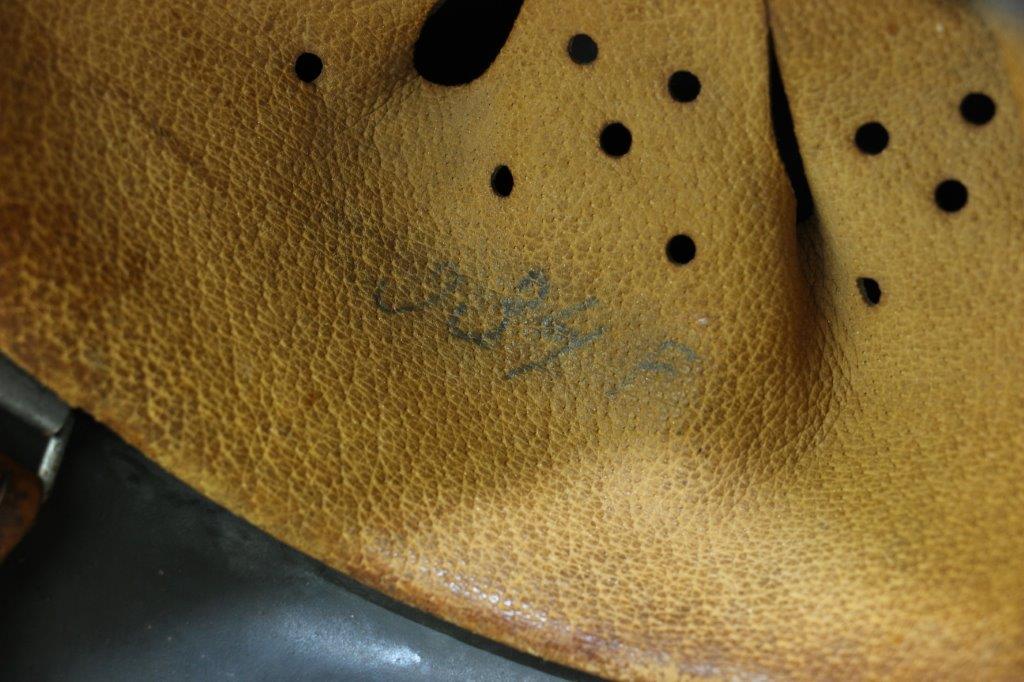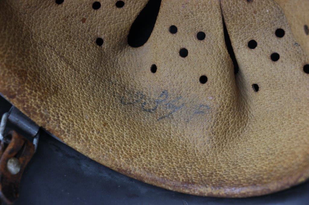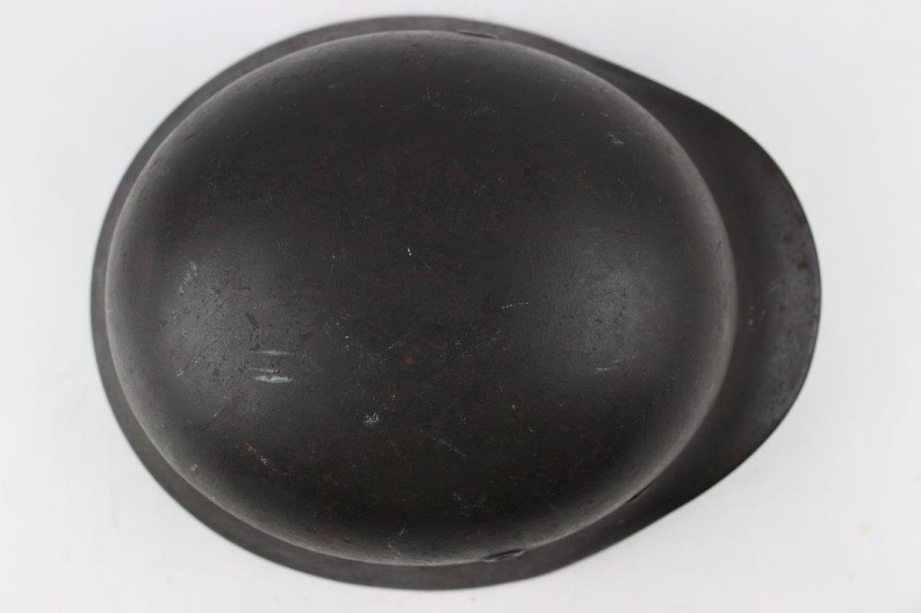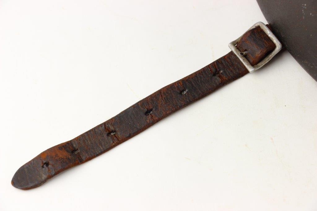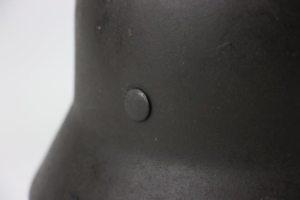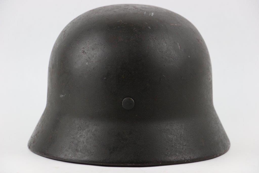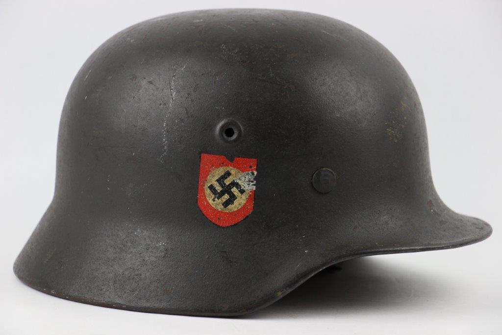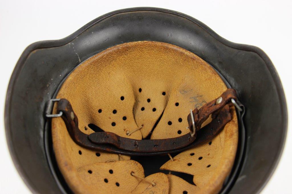 10/1/24 – This is a rare variation M40 Double Decal Combat Police Helmet from WW2. This example is in top-tier condition with excellent original exterior paint, crisp and clean exterior decals, and a minty interior leather liner. The exterior shell has light patina and spotty paint loss mostly around the rim and top crown. The decals are vibrant with the Nazi party shield rating around 80%, and the Police Eagle rating 95%+. Nice detail visible on each decal. The shell interior features an original liner band with a leather chin strap attached to each bale. The chin strap is broken at one end, but still in great overall condition. The back visor of the interior shell is stamped with a faint, “Q 64” (the Q is barely visible, yet original). Underneath the maker stamp is a batch/lot number “DN369” (the 9 is barely visible, but we’ve seen other examples with similar lot numbering and style). The leather liner is soft and pliable, yet in excellent overall condition and strong throughout. Ink stamped size “56” on the liner as shown. A scarce variation combat police helmet in hard-to-upgrade condition.