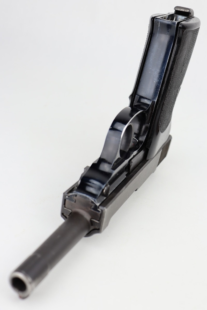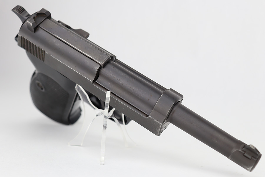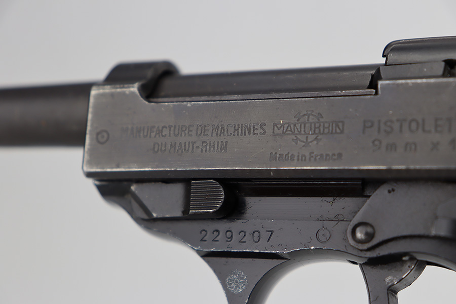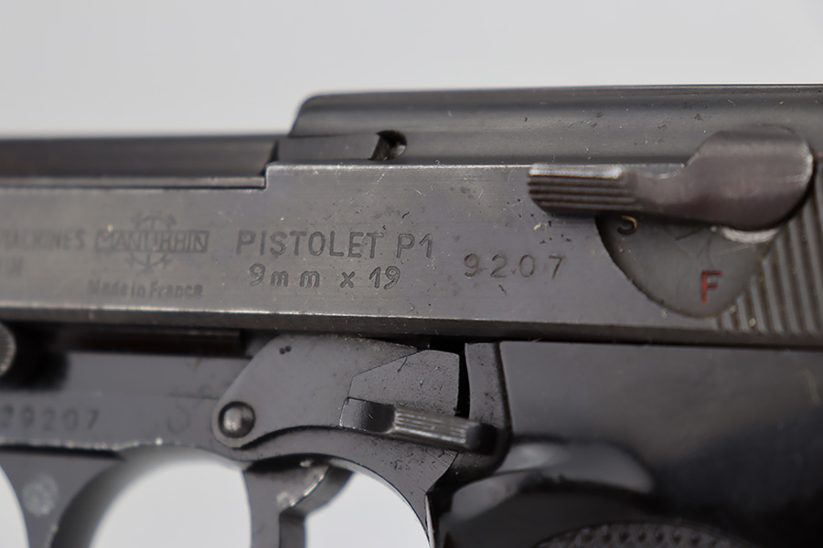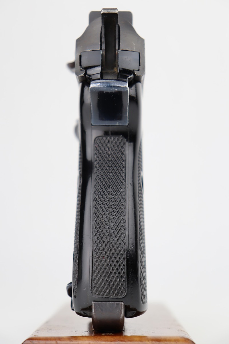 6/12/23 – This is an excellent example of a Manurhin P1 issued to the West Berlin police in the 1960’s. The gun is all matching and has a flower proof on the left side of the frame, indicating West Berlin police. No import marks. It has retained about 96% of its original finish with very minor wear around the muzzle and on the front edges of the slide. Some handling marks on the front strap. Fitted with very nice black plastic grips and comes with one proper P1 magazine. Minty bore. De-cocker is functional.