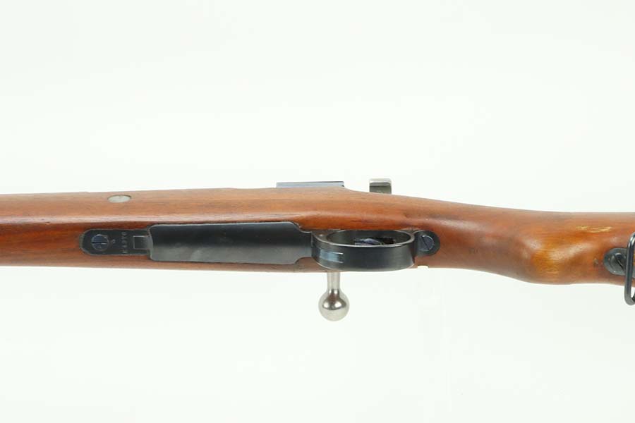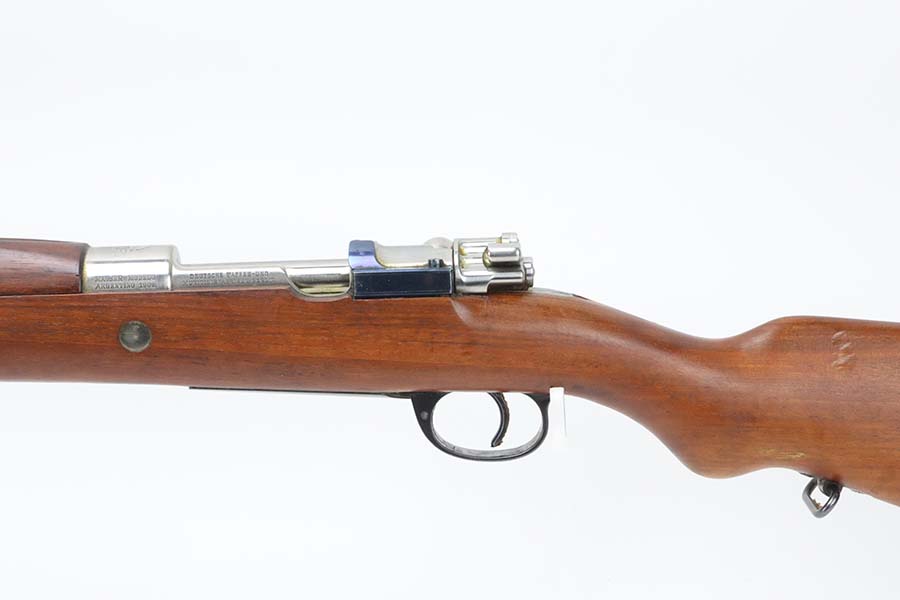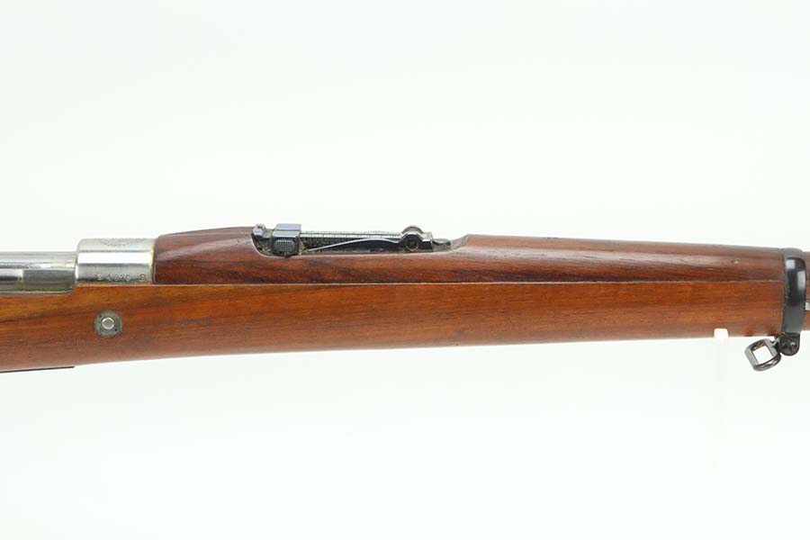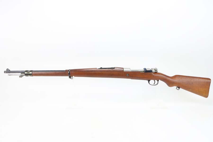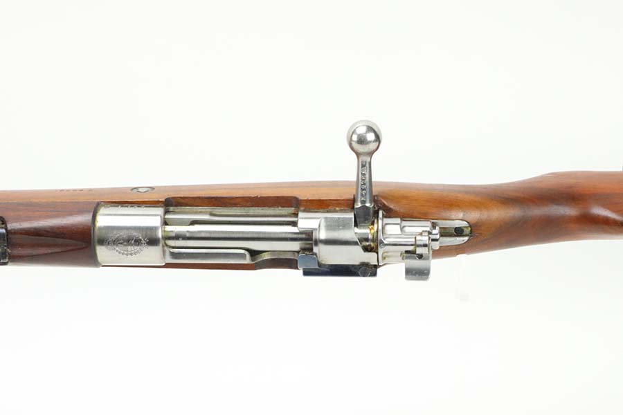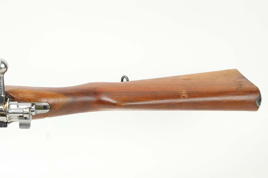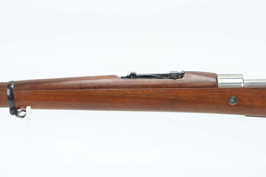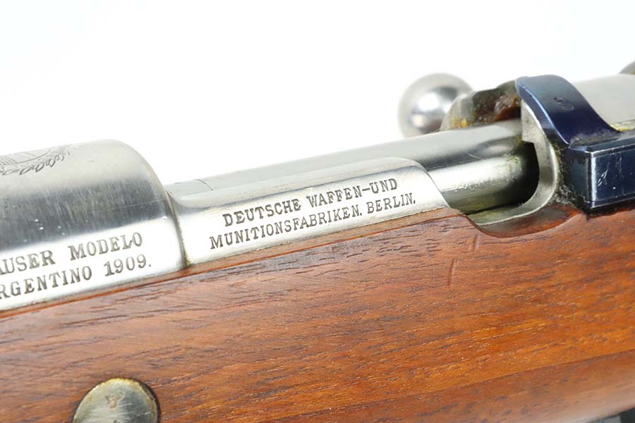 04/02/2024 – For sale is an excellent Argentine Model 1909 Mauser made by DWM around 1910. These rifles are large ring Mauser 98 action rifles made in contract to Argentina as an upgrade to their Model 1891 Mauser rifles. This rifle looks fresh from the arsenal with pockets of cosmoline throughout. The “In the white” finish is excellent and the bolt release has a gorgeous fireblue finish. The wood stock is in excellent condition but there ar some chatter marks on the rear of the stock. The bore looks to be excellent and shines light through with great rifling, but there are still pockets of cosmoline inside. The rifle matches on the bolt, receiver, cleaning rod, and stock. The receiver is stamped with the clean Argentine Crest.