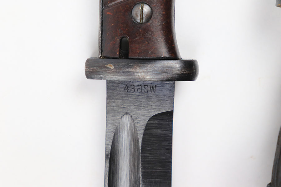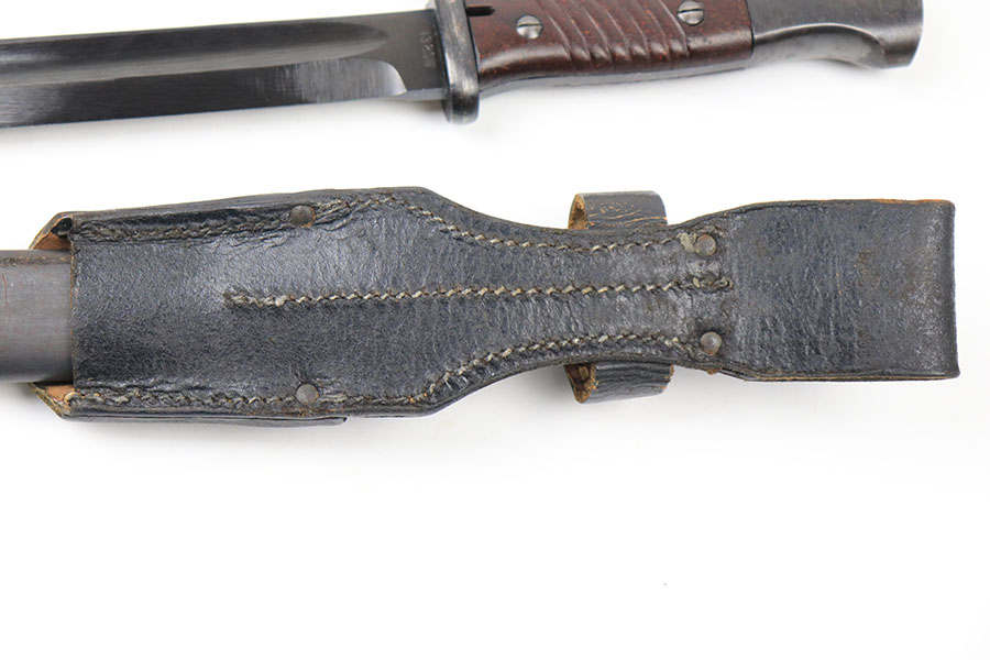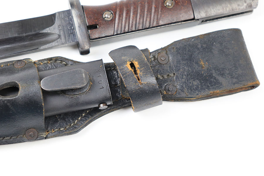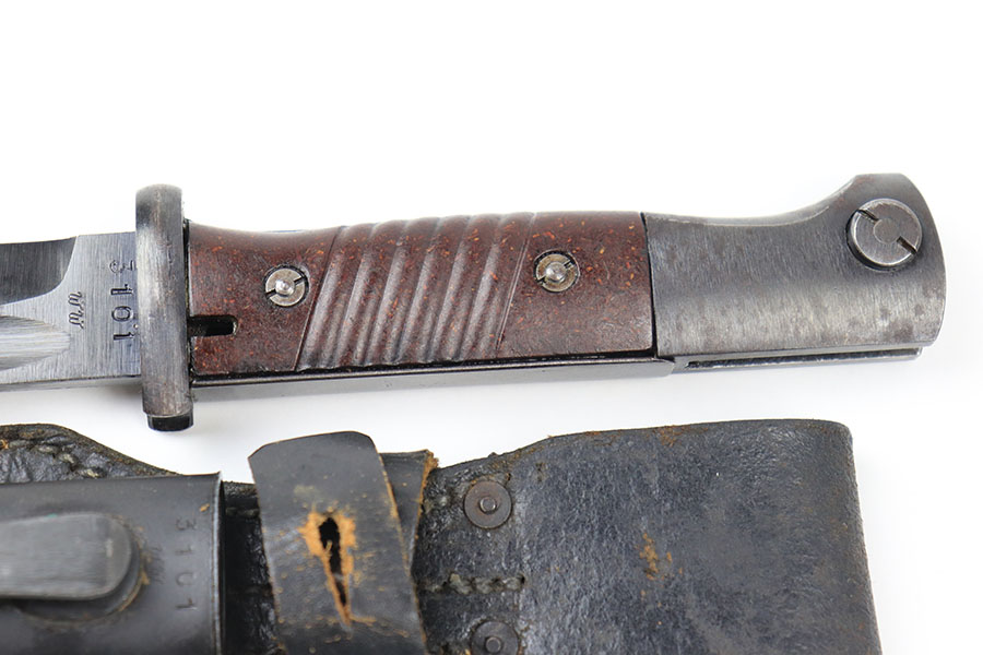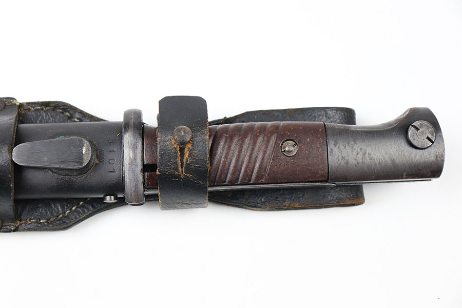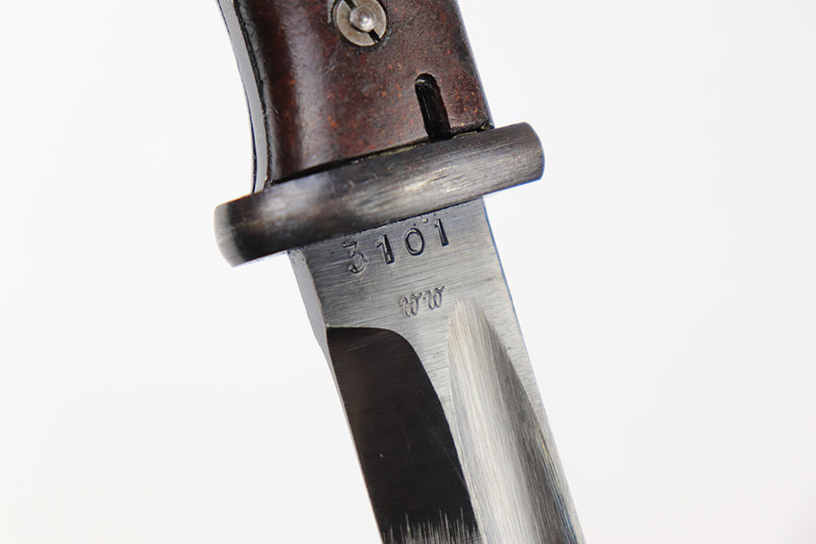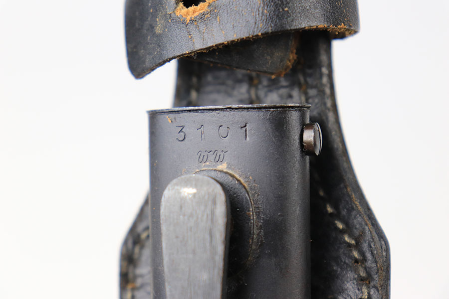 8/16/21 – This is an excellent condition 1943 K98 bayonet with a matching numbered scabbard and leather frog. The scabbard and blade are both serial numbered 3101ww. The leather frog has a faint unit stamp on the back leather that’s hard to decipher. The bluing on the blade and scabbard is excellent on both pieces. The scabbard has some light patina throughout the finish but this is mild. There’s also some mild wear on the metal portion of the handle, but this is relatively mild.