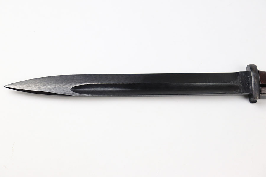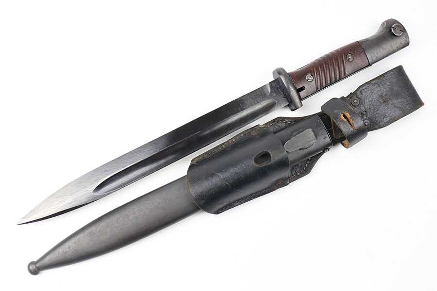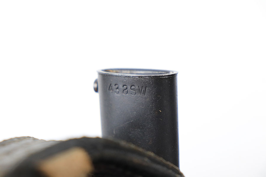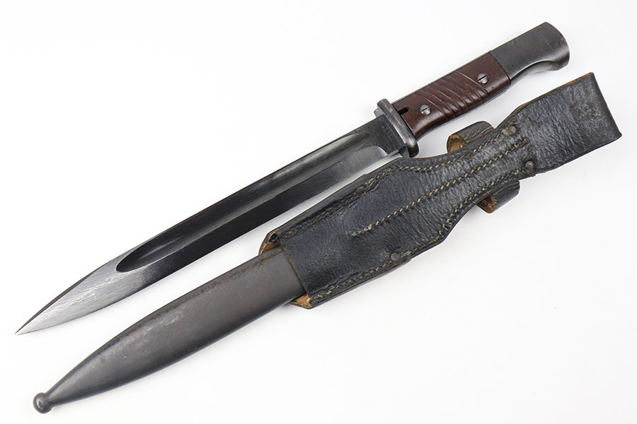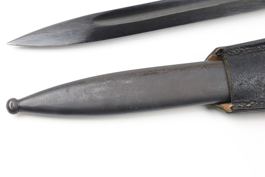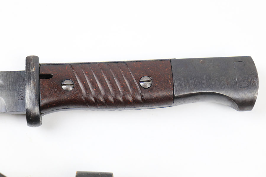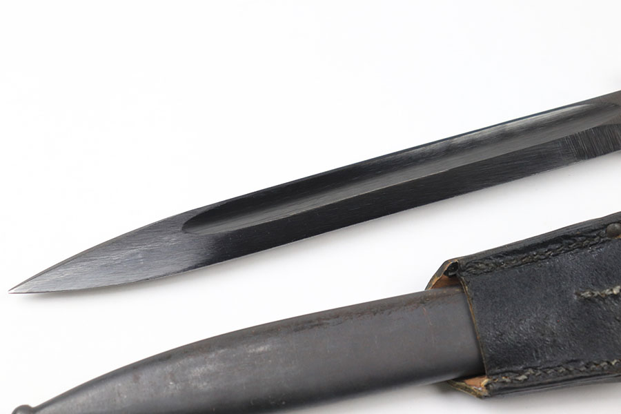 8/16/21 – This is an excellent condition 1943 K98 bayonet with a matching numbered scabbard and leather frog. The scabbard and blade are both serial numbered 3101ww. The leather frog has a faint unit stamp on the back leather that’s hard to decipher. The bluing on the blade and scabbard is excellent on both pieces. The scabbard has some light patina throughout the finish but this is mild. There’s also some mild wear on the metal portion of the handle, but this is relatively mild.