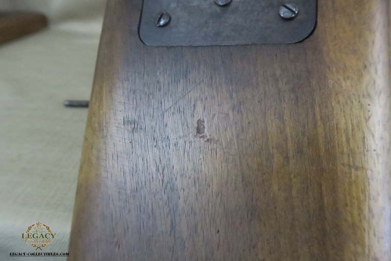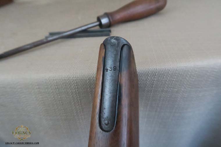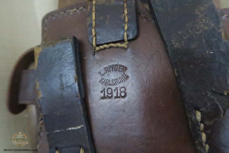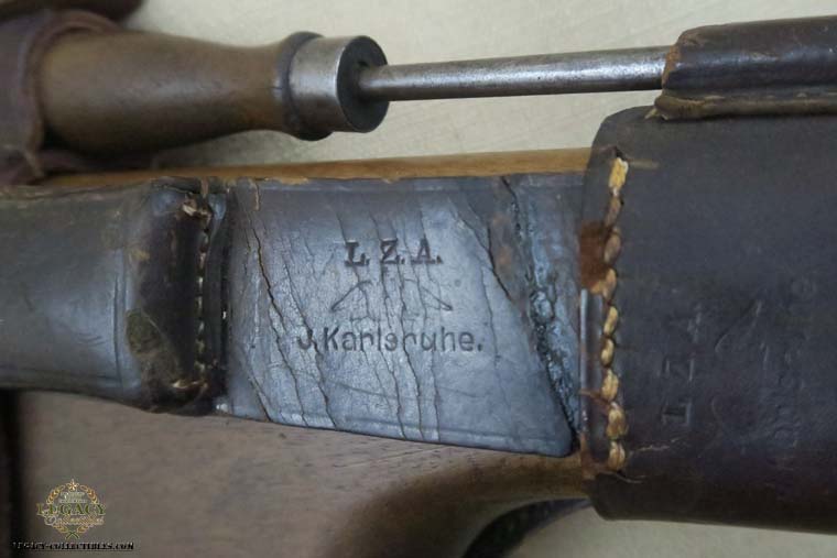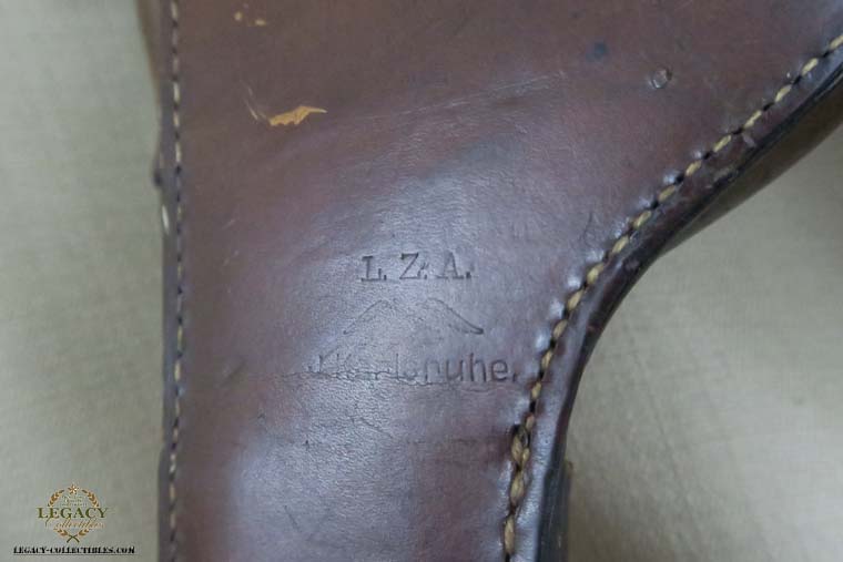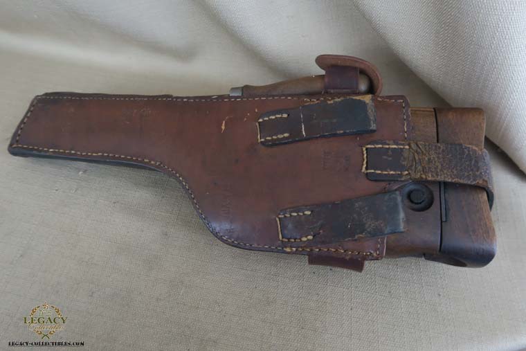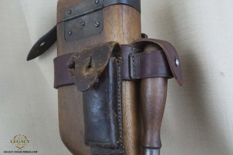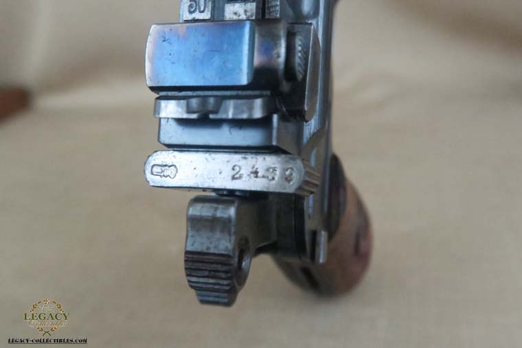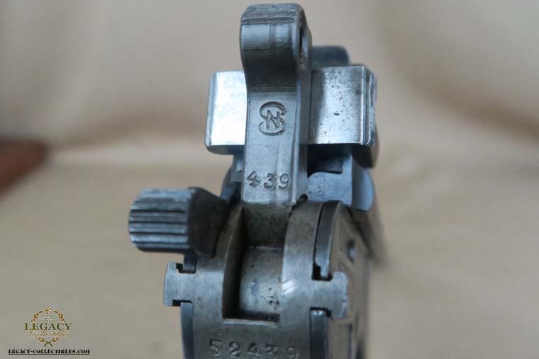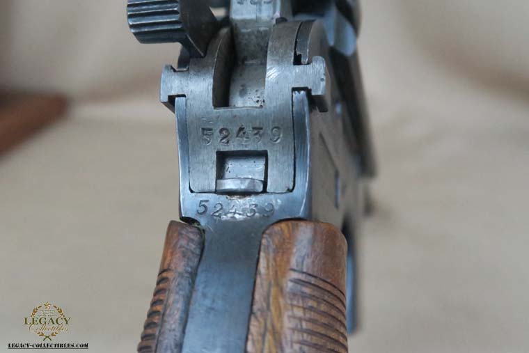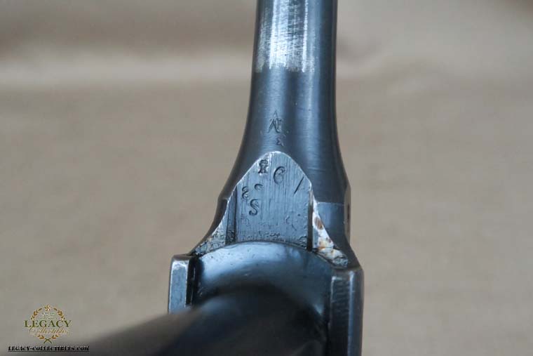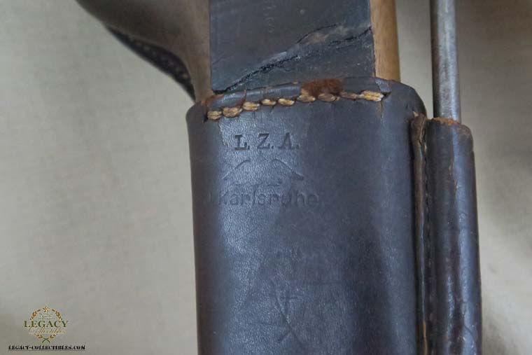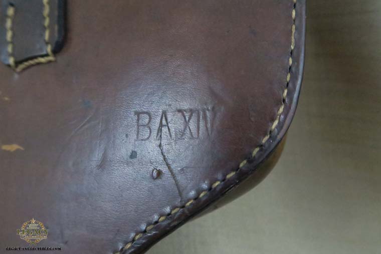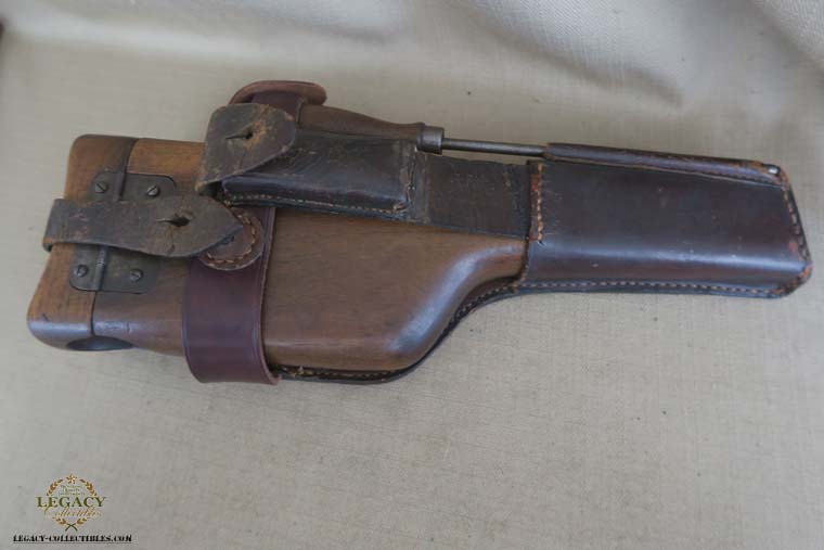 4/26/16 – This is an excellent Mauser Red 9 Broomhandle with a matching stock. It has all original and matching parts. The rig also comes with the leather carrying case around the wood stock. This is a super rare rig! The original finish is about 97% with some wear on the muzzle. It has crown/U proofs and the red 9 on the grips. “SN” marked on the back of the hammer. The bore is very nice with strong rifling. The leather is dated 1918 and marker marked. It also has “L.Z.A.” and BAXIV on the back. It also has a cleaning rod and pouch. Comes with stripper click and spring. Very cool and rare rig!