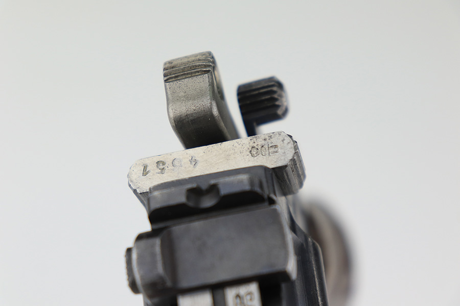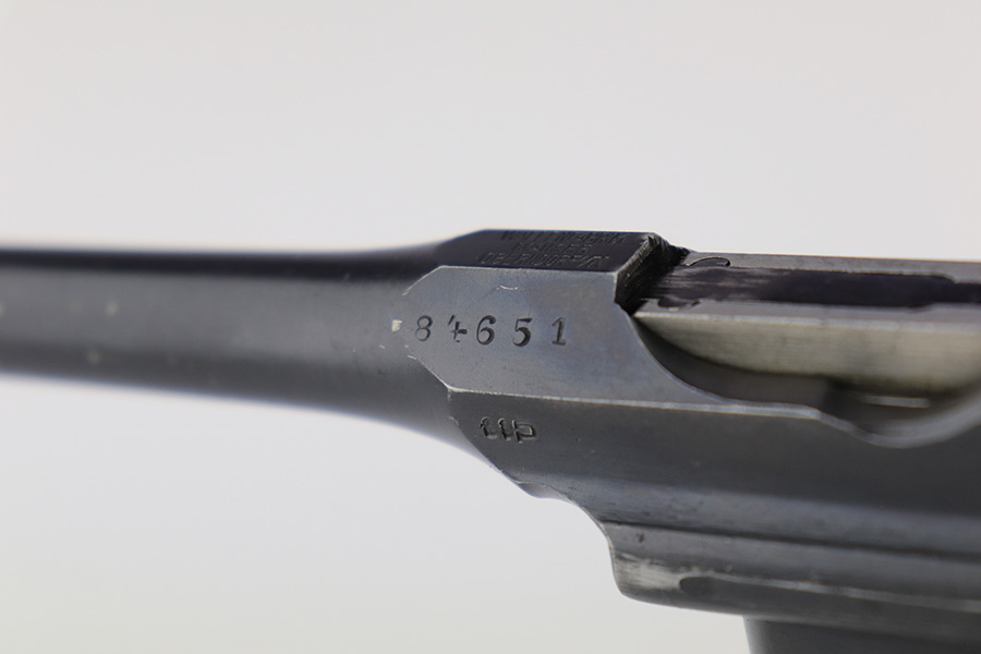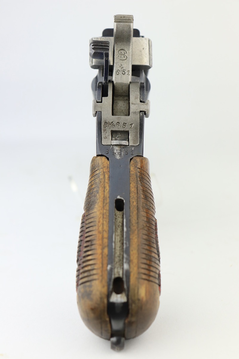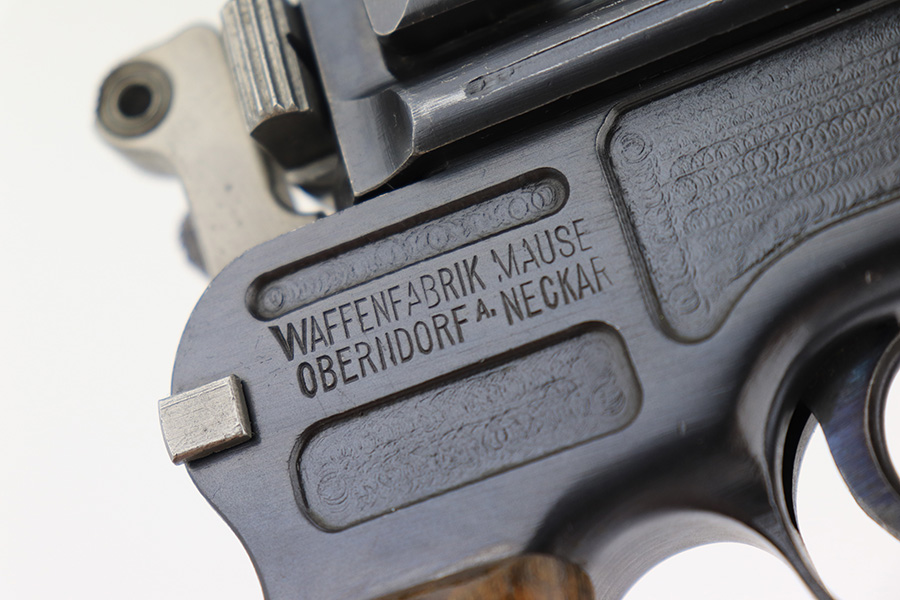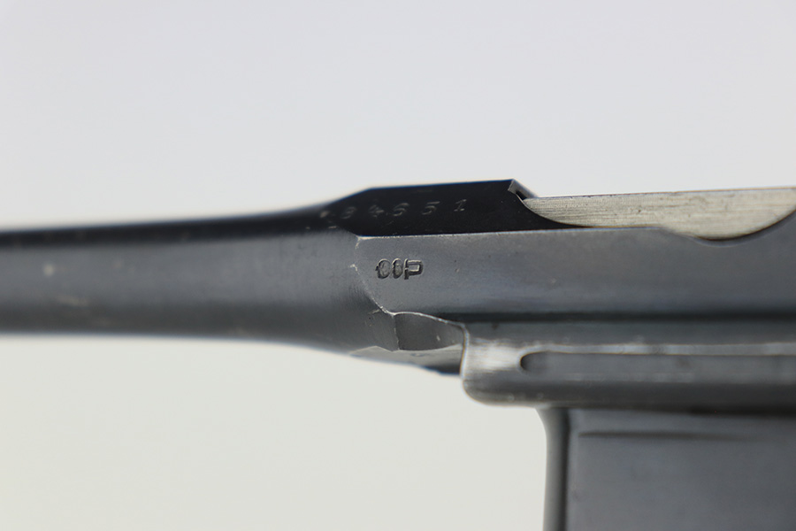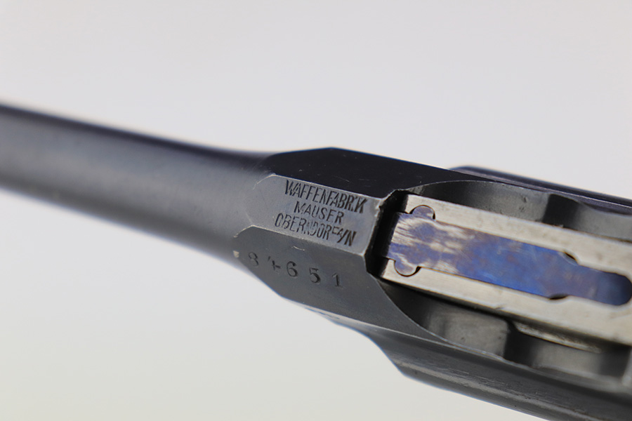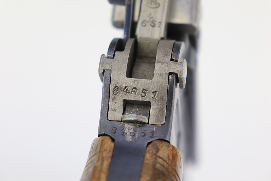 3/15/23 – This is an example of an original “Red 9” Mauser C96 Broomhandle rig with Prussian Eagle marking on front of mag well. Unlike its commercial counterparts, “Red 9” Broomhandles were chambered in the more common 9mm Para caliber, which was used by the German Army and were marked with a large 9 on the grips which was then filled with red or orange paint to help German soldiers differentiate its caliber from the standard .30 mauser cartridge. Only about 130,000 of these very collectible guns were made, with only about 100,000 being accepted by the army and issued to the troops. Considered to be a substitute for a light carbine, they became very popular in trench warfare and were used by some of the Germany’s elite crack troops. This on is all matching and has retained about 97% of its original finish. Very minor wear around the high edges, a few tiny handling marks here and there, and some light spotty wear along the barrel. Comes with very nice period-correct grips that are numbered but not matching. They’re very close though, numbered “84660”. Mint bore.