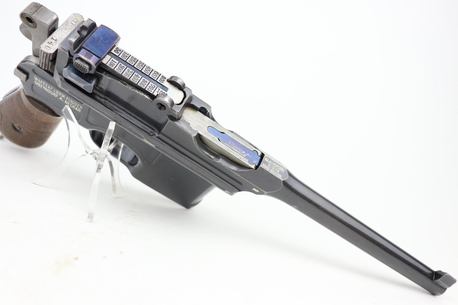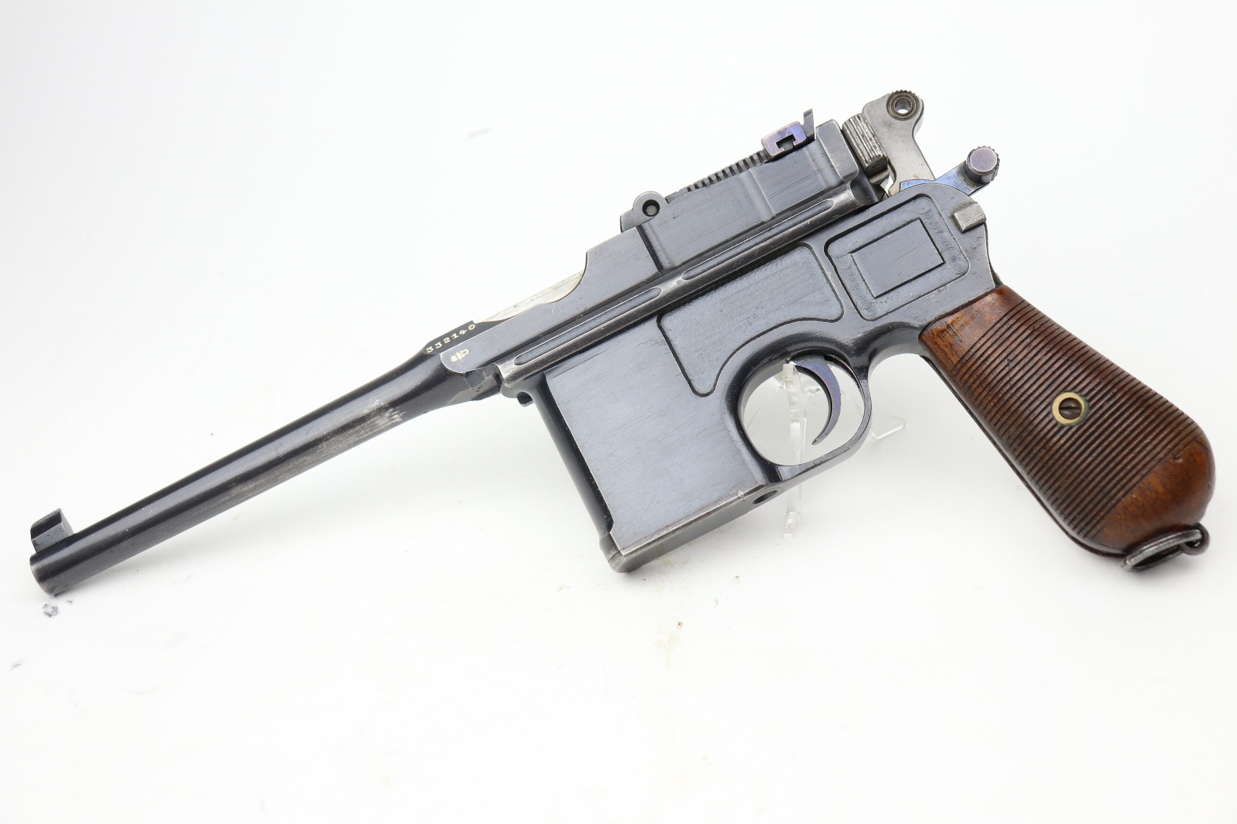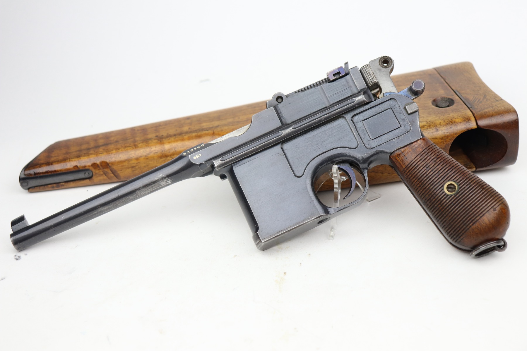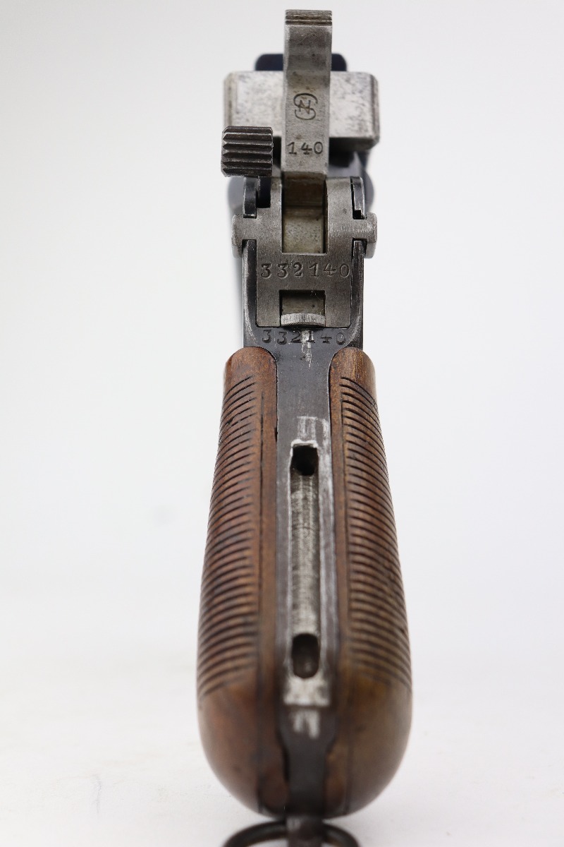 3/24/21 – This is an excellent example of a Mauser C96 rig issued to the Imperial German military in 1916. The gun is all matching and has an imperial proof on the right side of the slide. The gun comes with a very nice Imperial proofed stock, but it is not numbered. The gun has retained about 95% of its original bluing. There are a few streaks of wear on the underside of the barrel and minor wear around the muzzle and high edges of the frame and slide. Excellent matching grips. Very nice bore – strong rifling with very minor pin-pricking throughout.