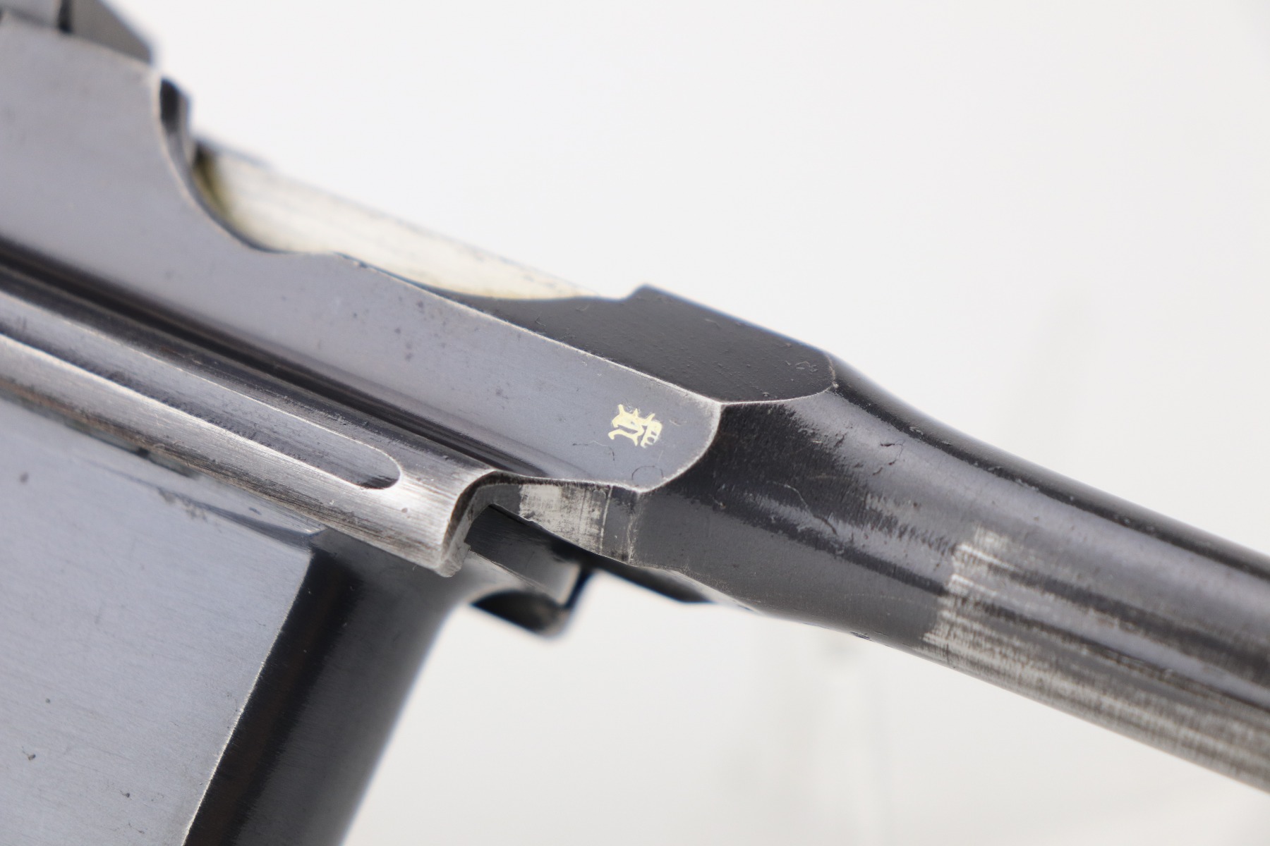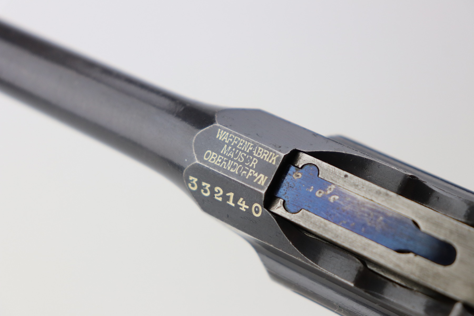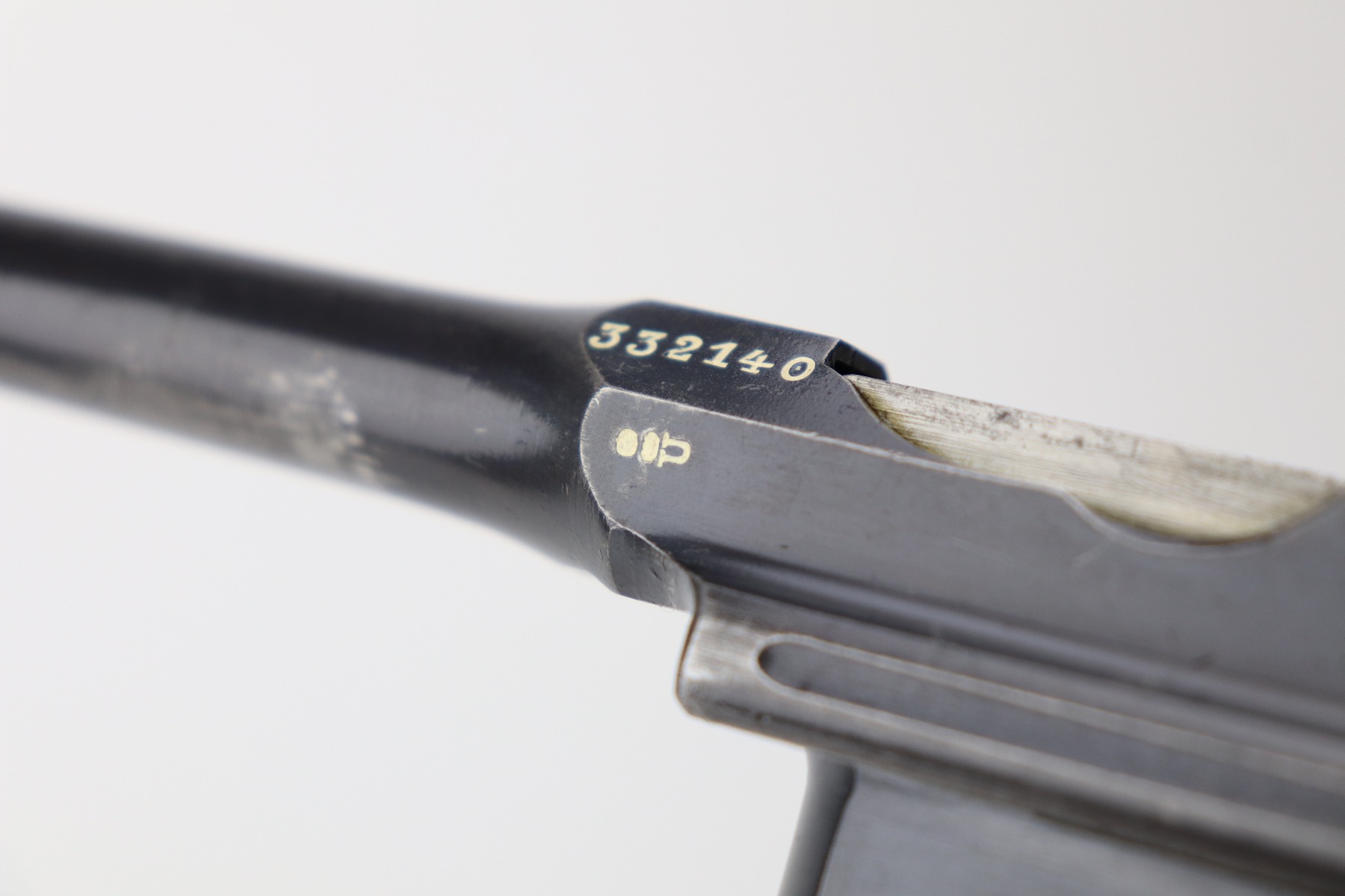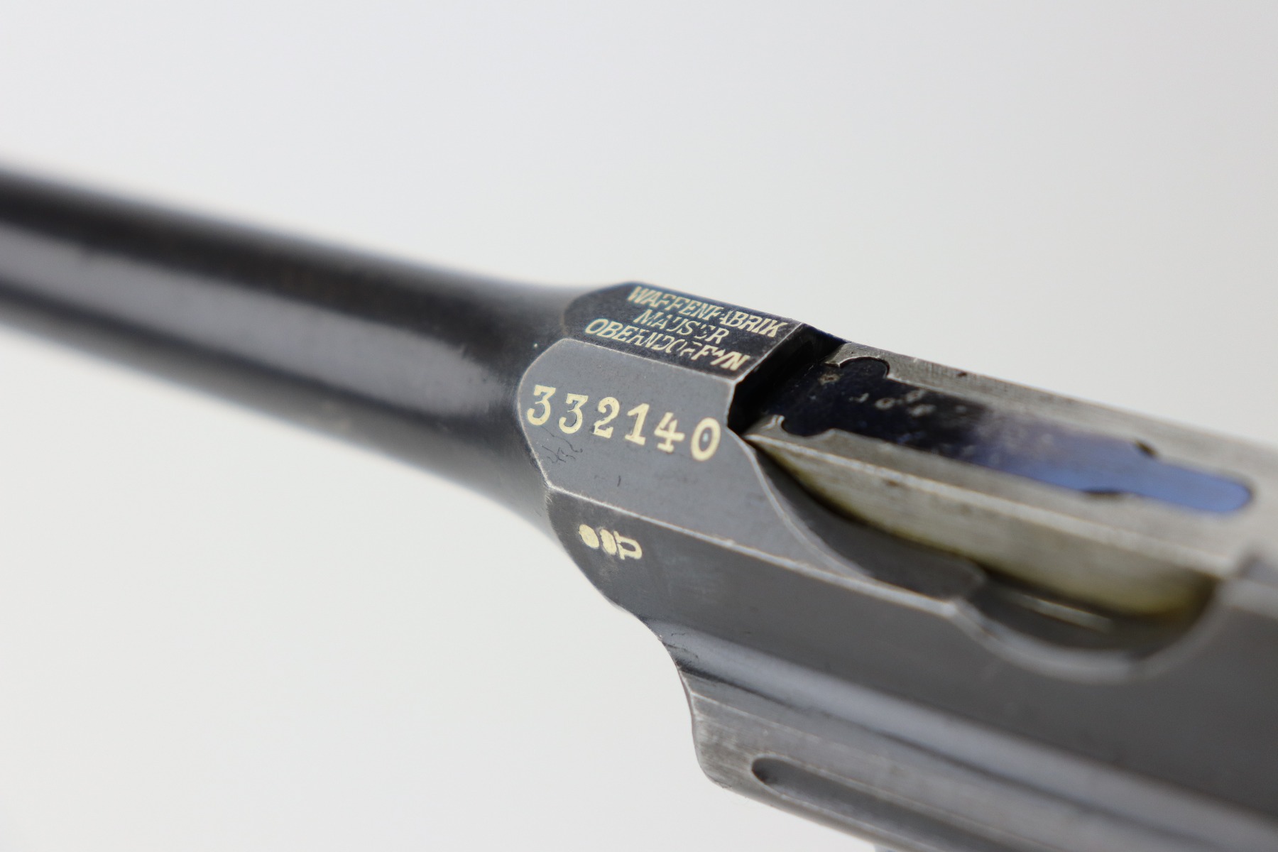 3/24/21 – This is an excellent example of a Mauser C96 rig issued to the Imperial German military in 1916. The gun is all matching and has an imperial proof on the right side of the slide. The gun comes with a very nice Imperial proofed stock, but it is not numbered. The gun has retained about 95% of its original bluing. There are a few streaks of wear on the underside of the barrel and minor wear around the muzzle and high edges of the frame and slide. Excellent matching grips. Very nice bore – strong rifling with very minor pin-pricking throughout.