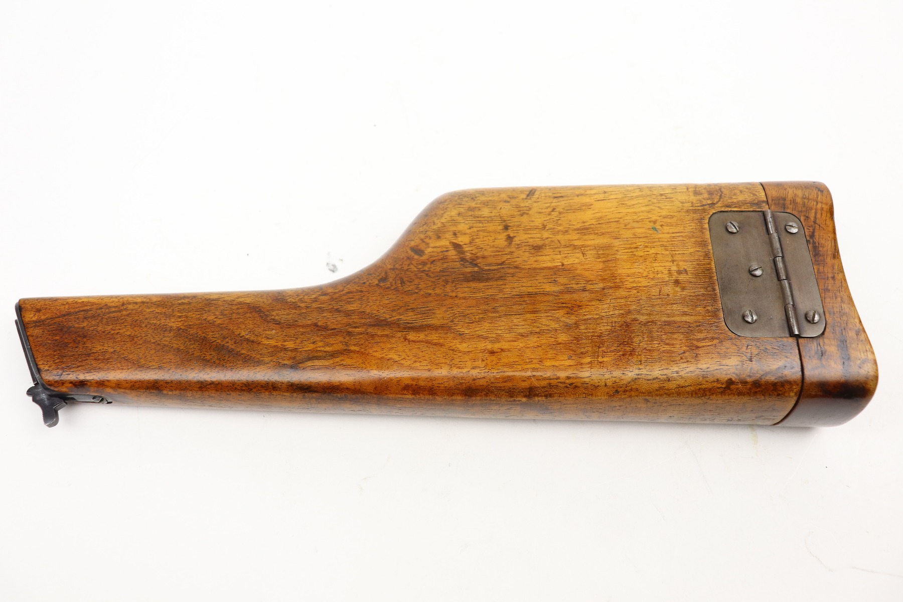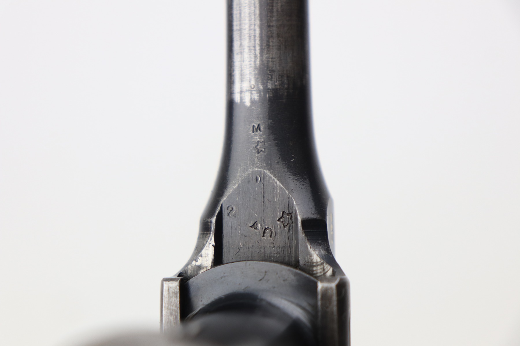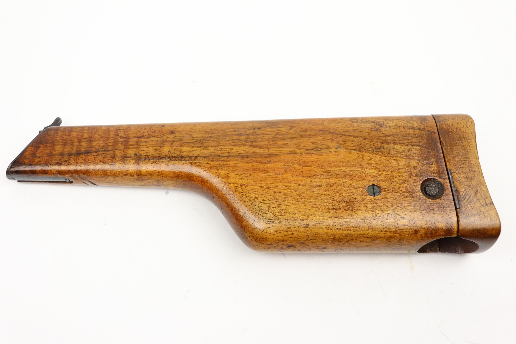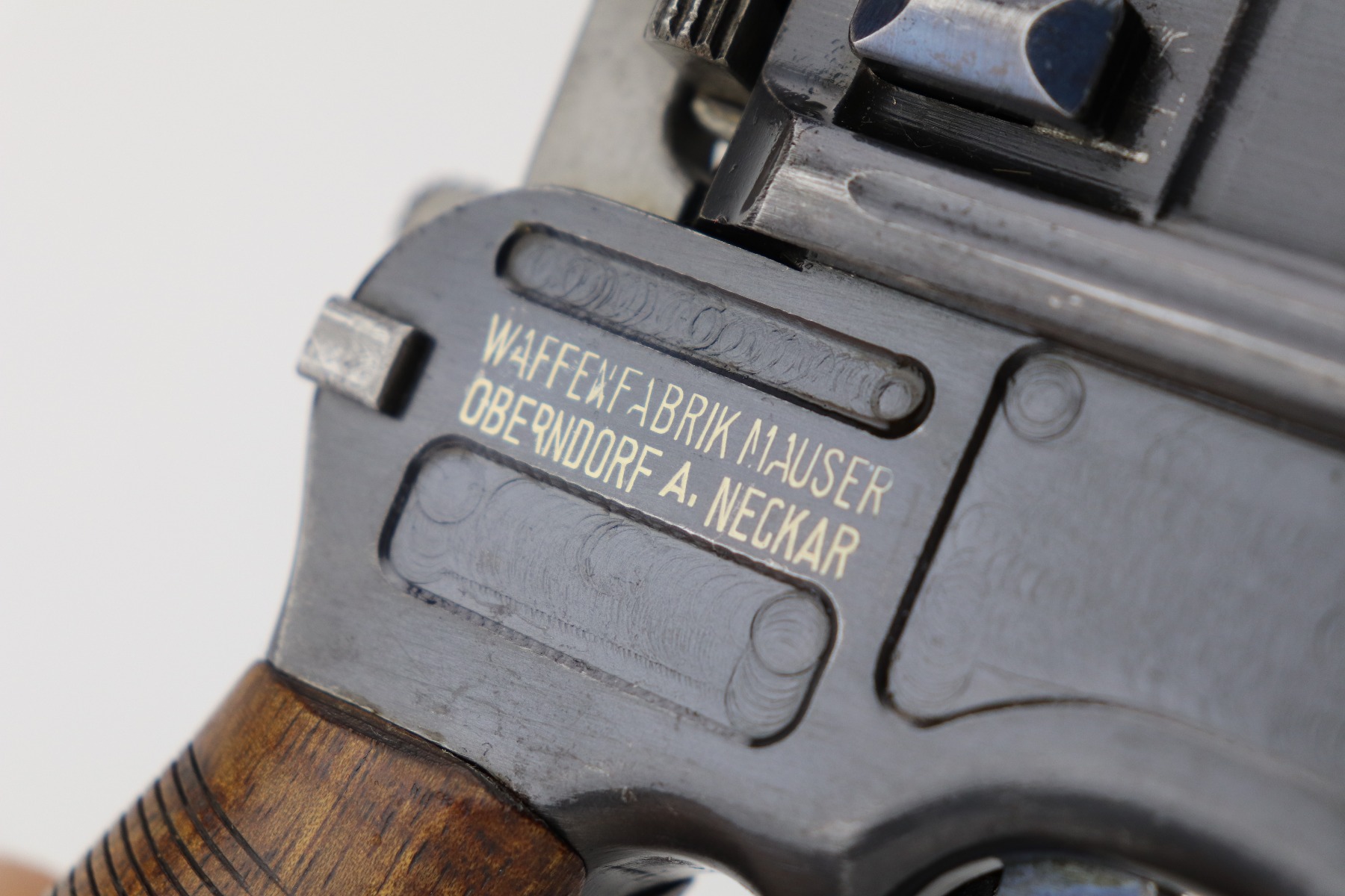 3/24/21 – This is an excellent example of a Mauser C96 rig issued to the Imperial German military in 1916. The gun is all matching and has an imperial proof on the right side of the slide. The gun comes with a very nice Imperial proofed stock, but it is not numbered. The gun has retained about 95% of its original bluing. There are a few streaks of wear on the underside of the barrel and minor wear around the muzzle and high edges of the frame and slide. Excellent matching grips. Very nice bore – strong rifling with very minor pin-pricking throughout.