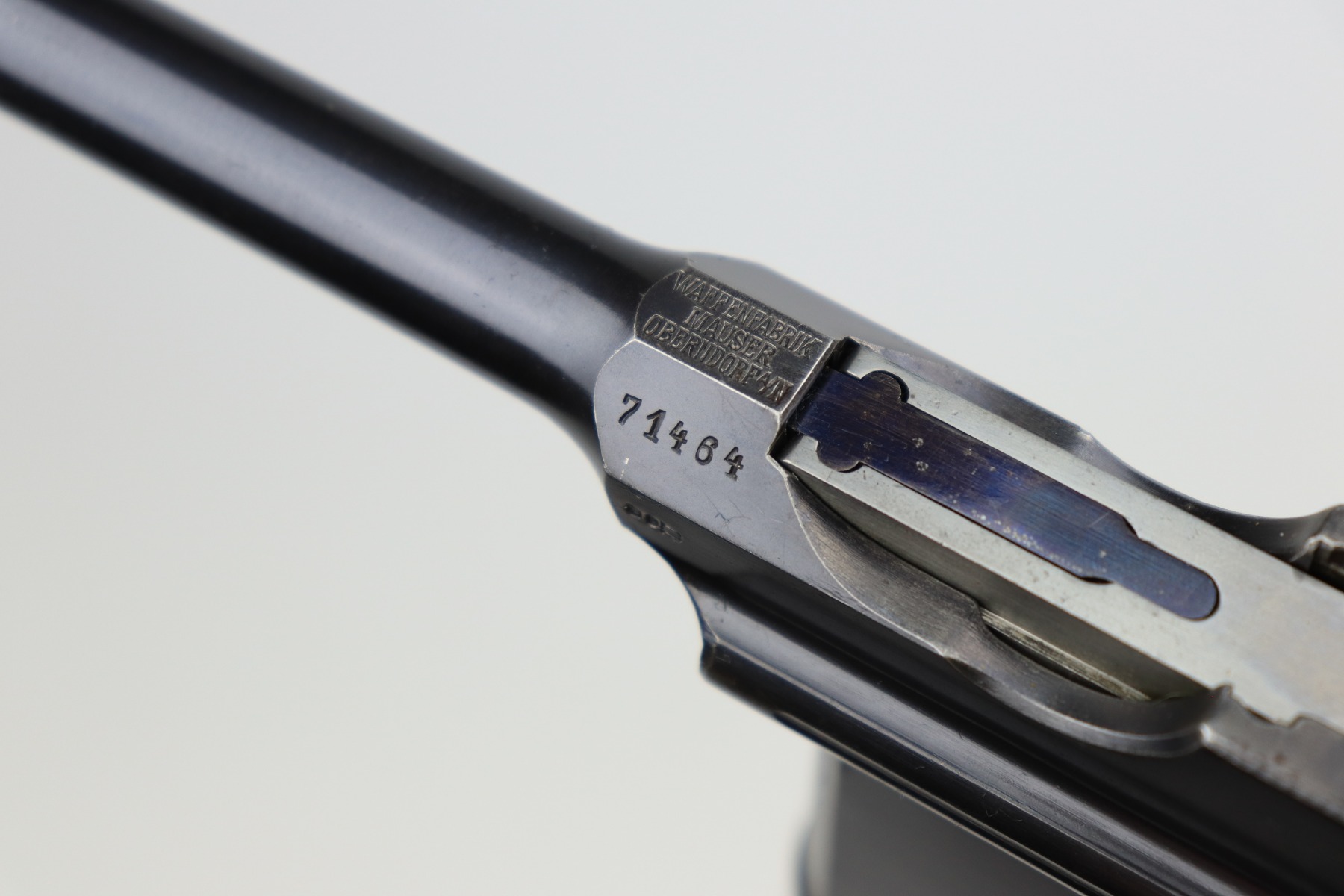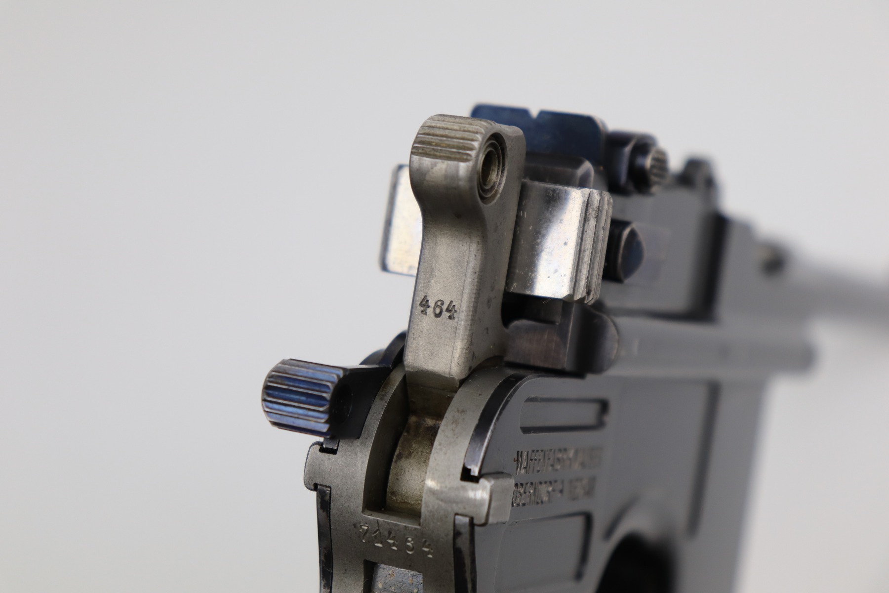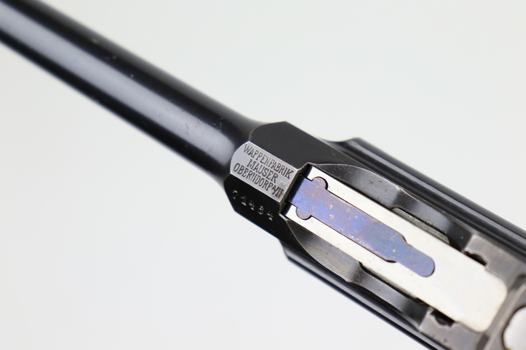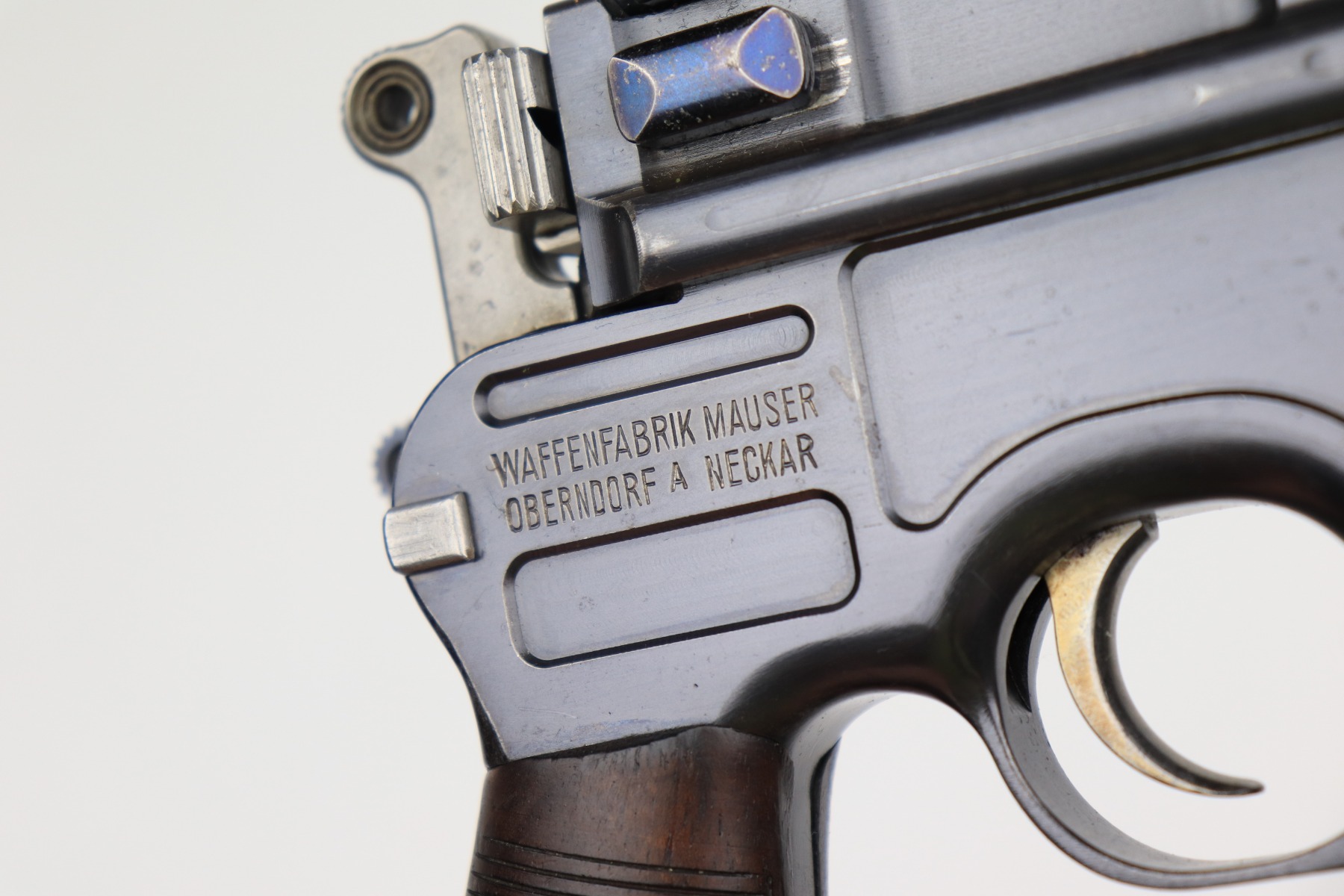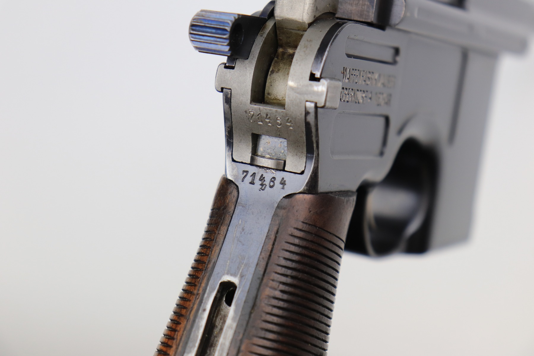 2/10/21 – This is an excellent, beautiful example of a Mauser C96 Broomhandle Rig, made in about 1909-11. The gun is all matching and comes with an un-marked period-correct holster. The gun has retained about 97% of its bluing. There is very minor wear around the muzzle and some light scratches/handling marks on the barrel and front edge of the frame. Wear around the stock lug. The holster is excellent. The bore is near-mint. It has original, matching-numbered grips.