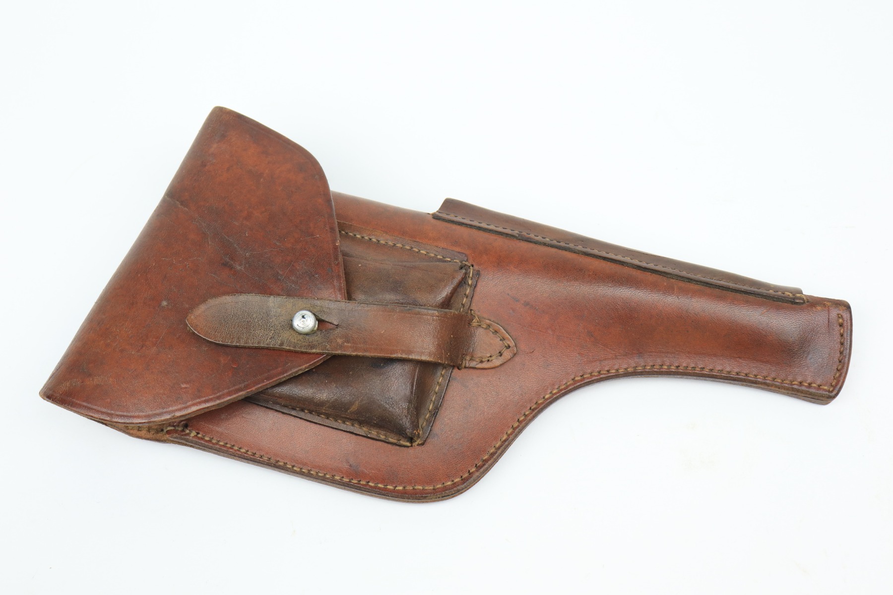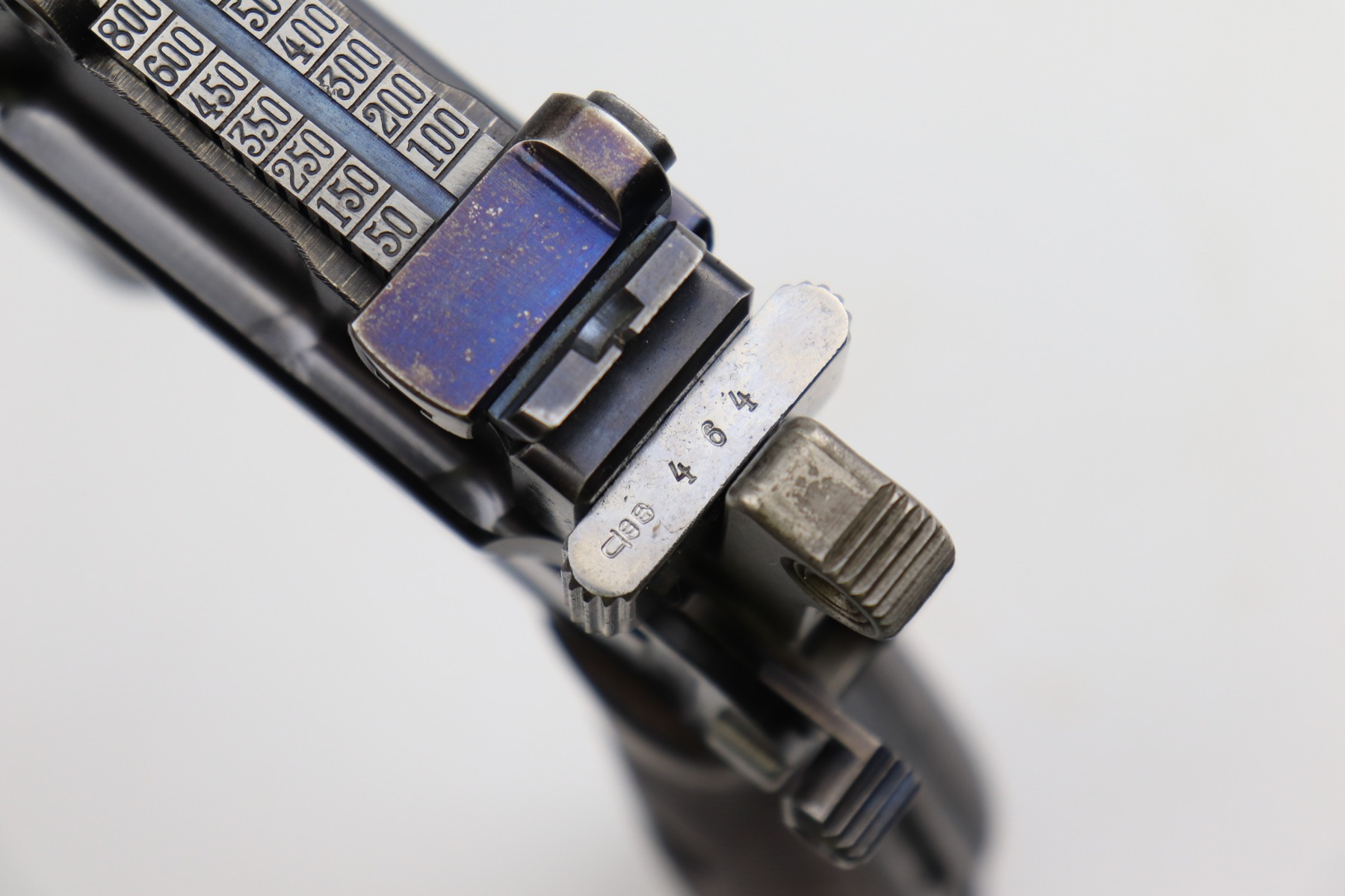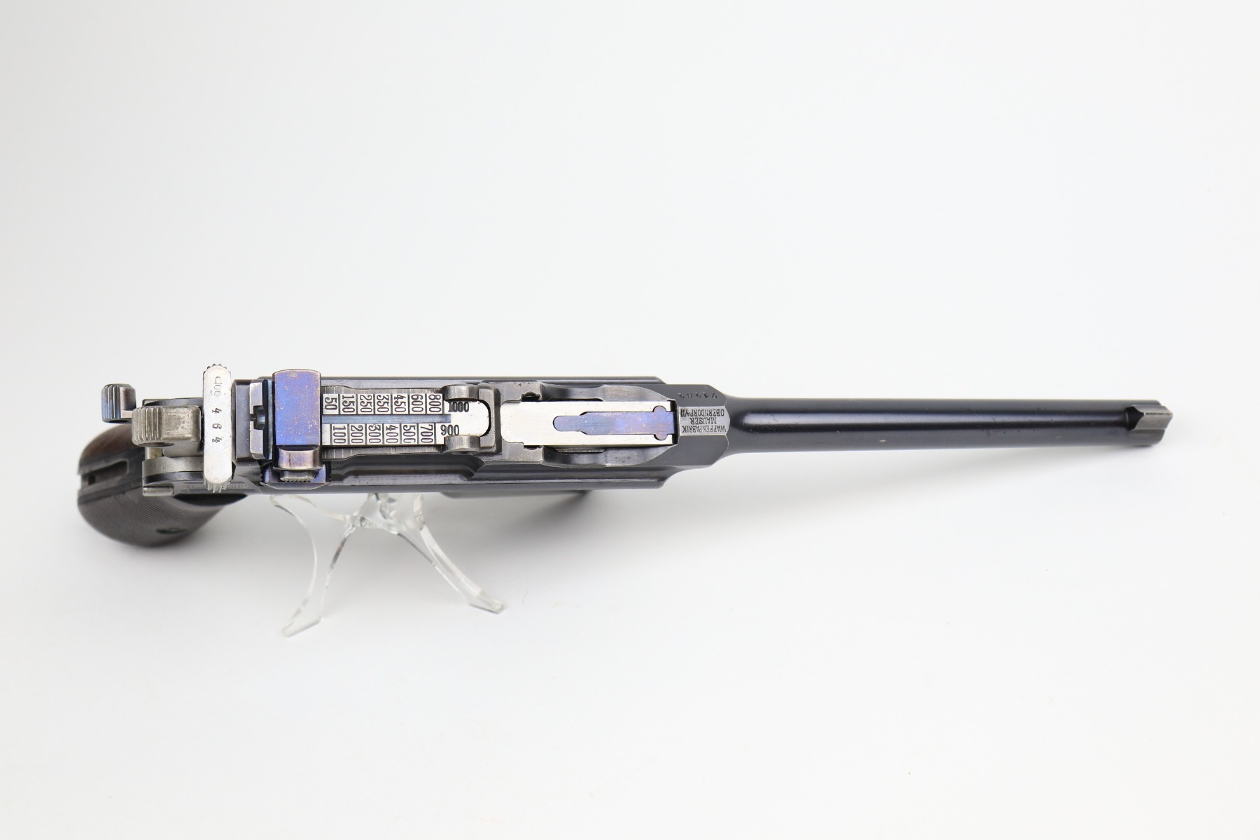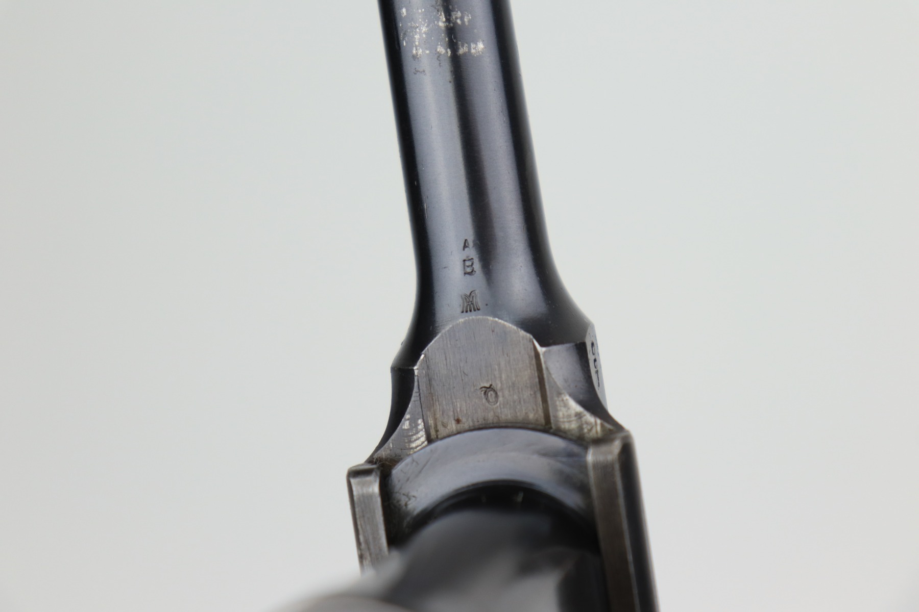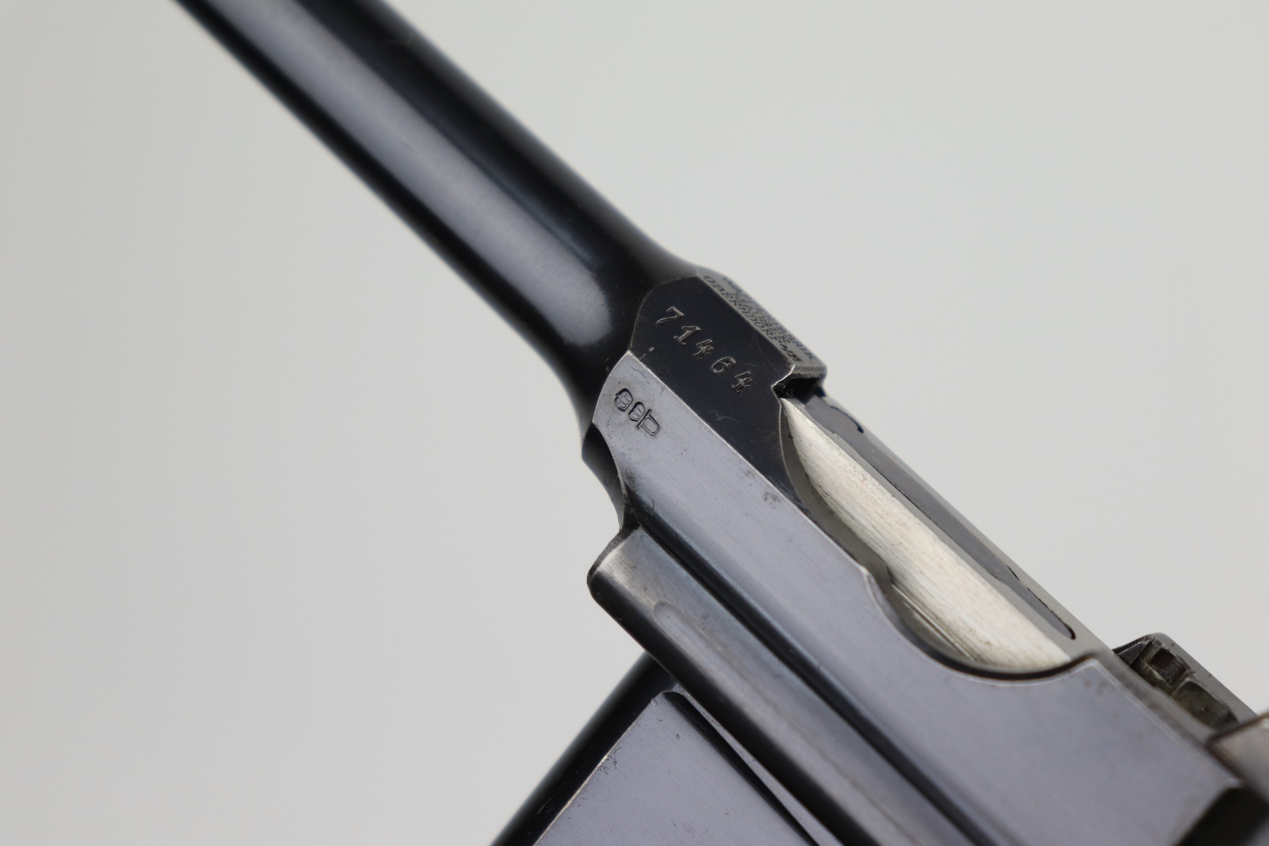 2/10/21 – This is an excellent, beautiful example of a Mauser C96 Broomhandle Rig, made in about 1909-11. The gun is all matching and comes with an un-marked period-correct holster. The gun has retained about 97% of its bluing. There is very minor wear around the muzzle and some light scratches/handling marks on the barrel and front edge of the frame. Wear around the stock lug. The holster is excellent. The bore is near-mint. It has original, matching-numbered grips.