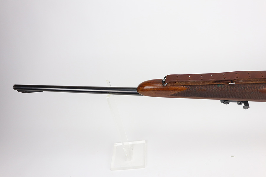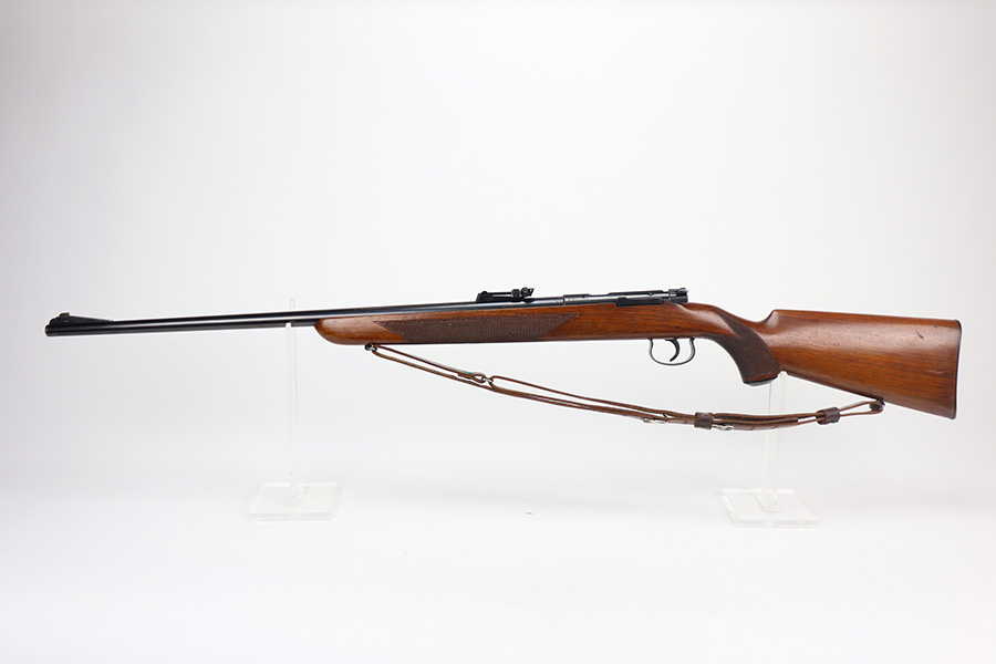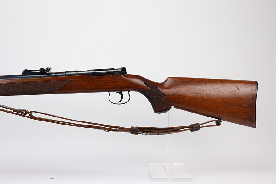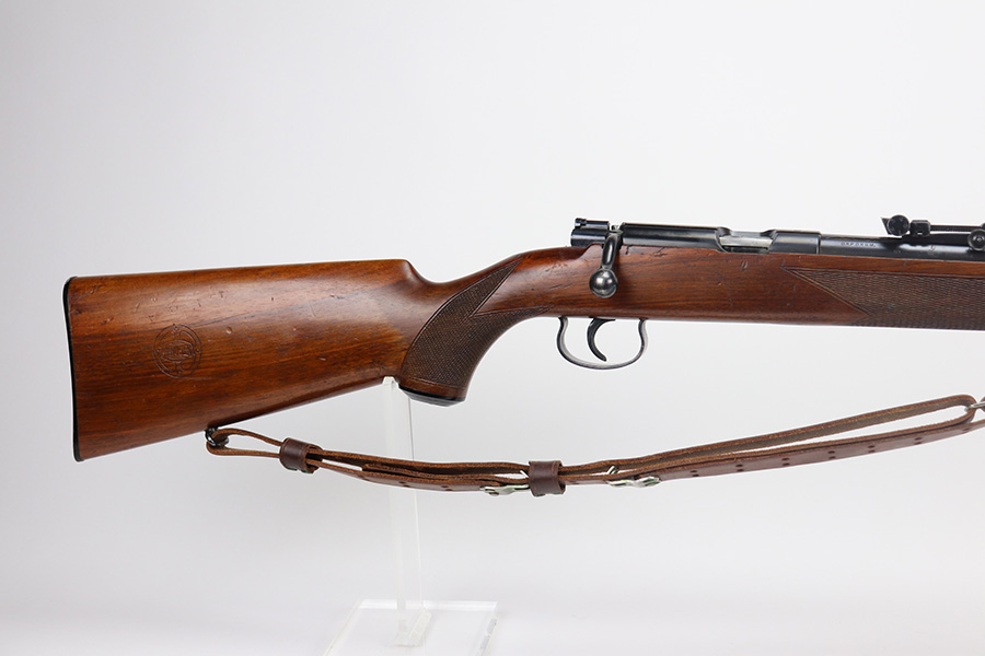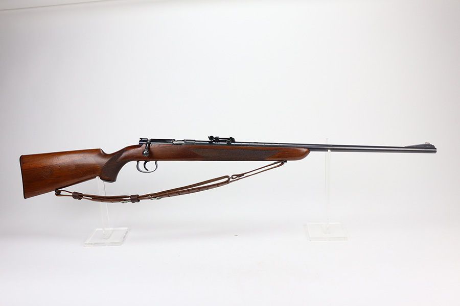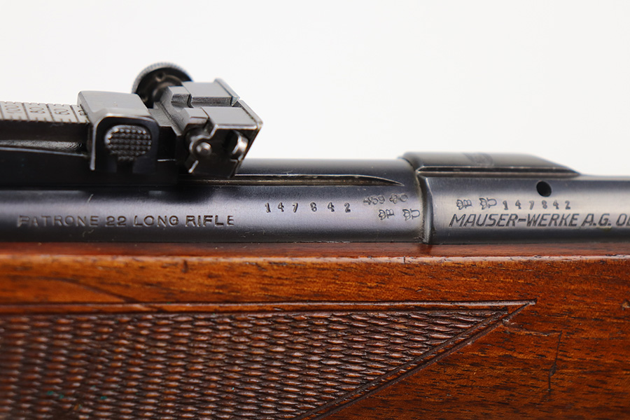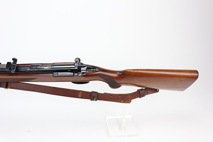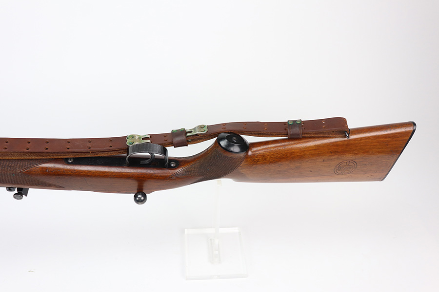 5/10/21 – This is an excellent example of a Mauser ES 350 B Target Rifle, chambered in .22LR. The gun is all matching and has “Crown BUG” proofs throughout. It has an adjustable rear sight that slides on a dovetail rail. The gun has retained most of its bluing with minor handling marks along the barrel. Very nice stock with minor bruising and surface scratches here and there. Comes with a leather sling. Mint bore.