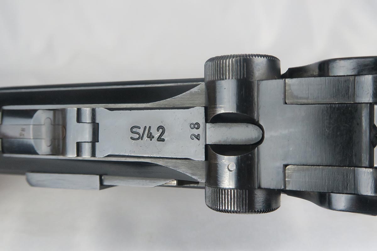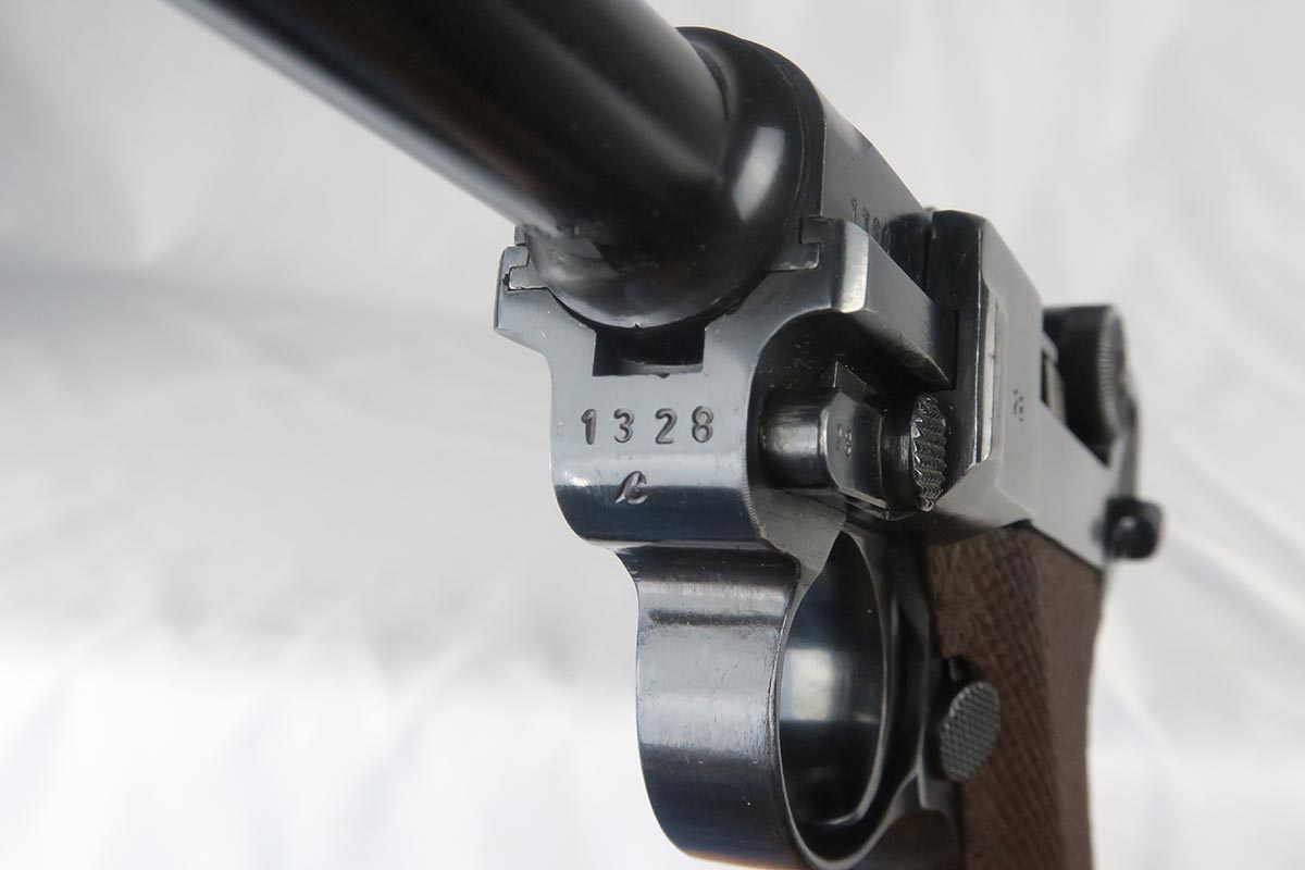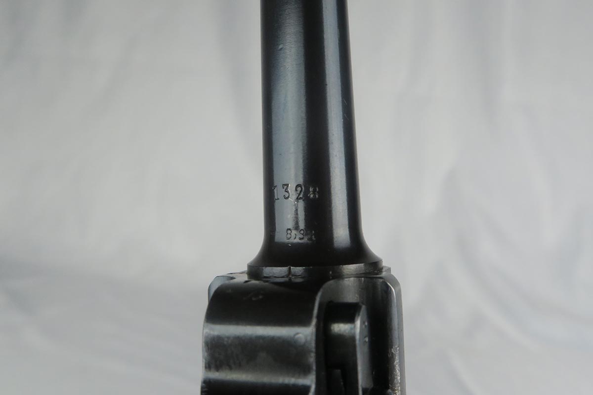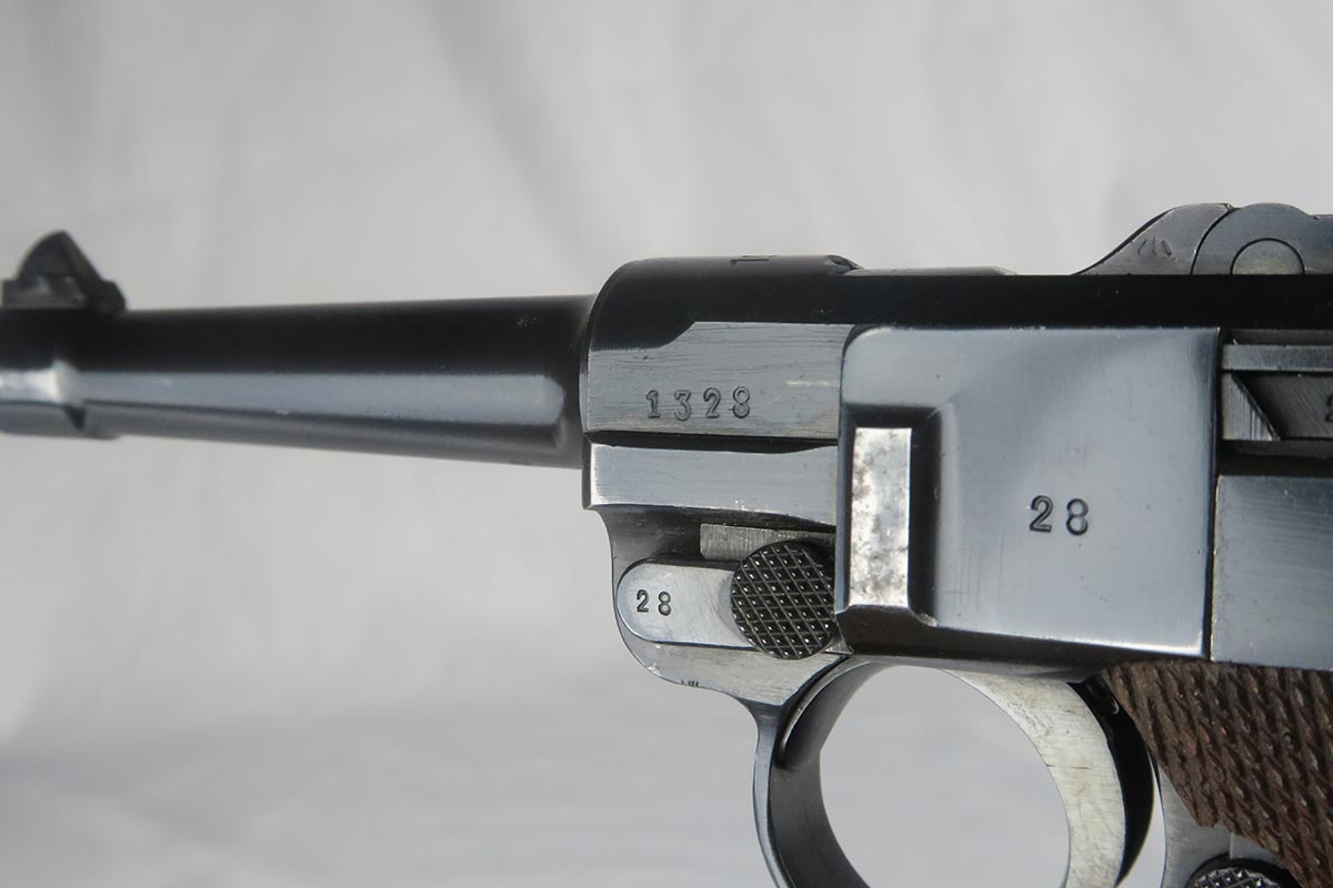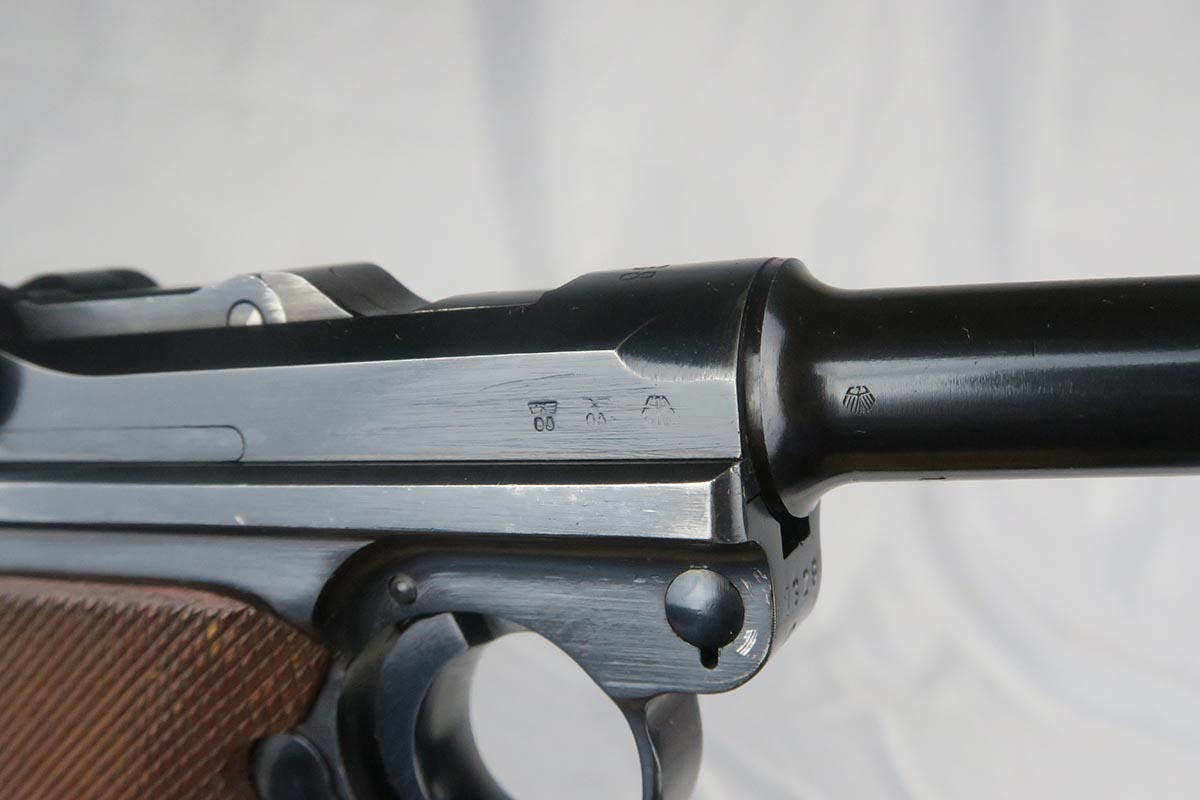 10/27/17 – This is an excellent Mauser luger from 1938, with all matching small parts. The original blue rates at 97-98% with wear on the sideplate and left side of barrel. Excellent grips that are marked Eagle/63. Period correct magazine that is numbered to a different pistol. Minty bore.