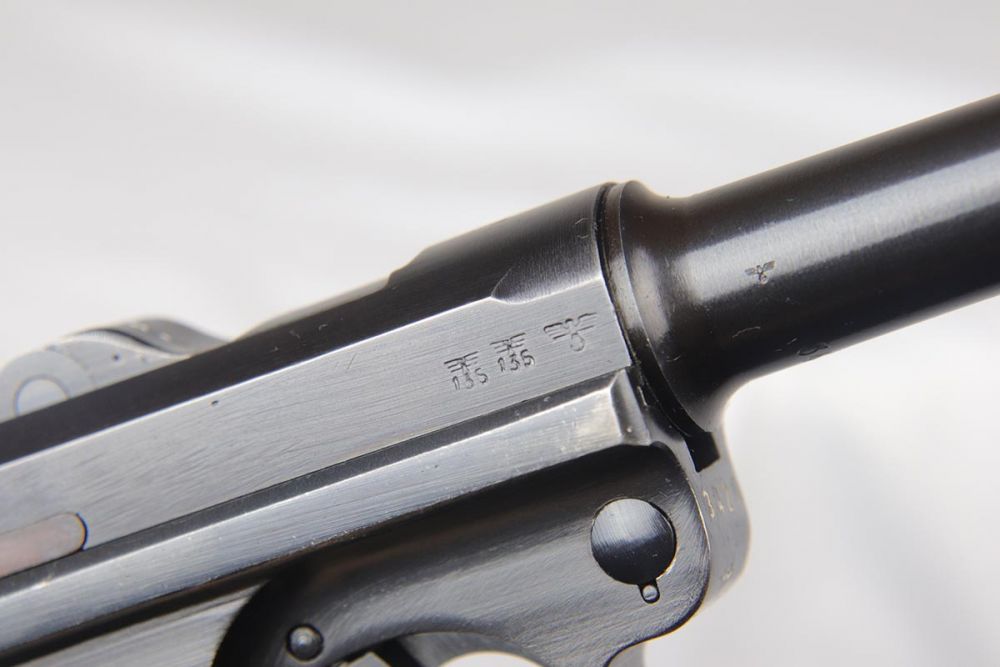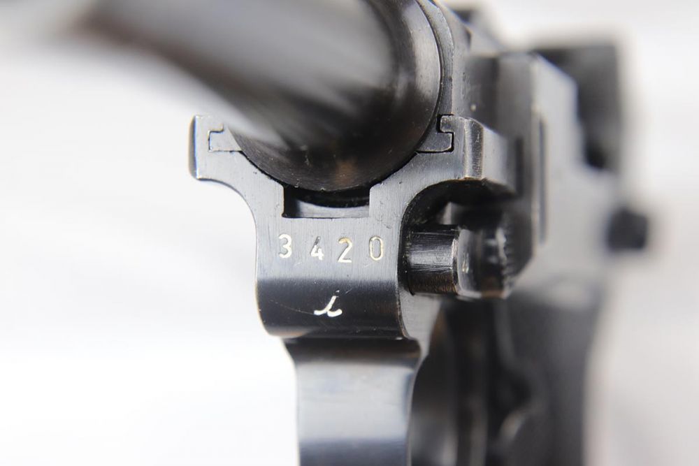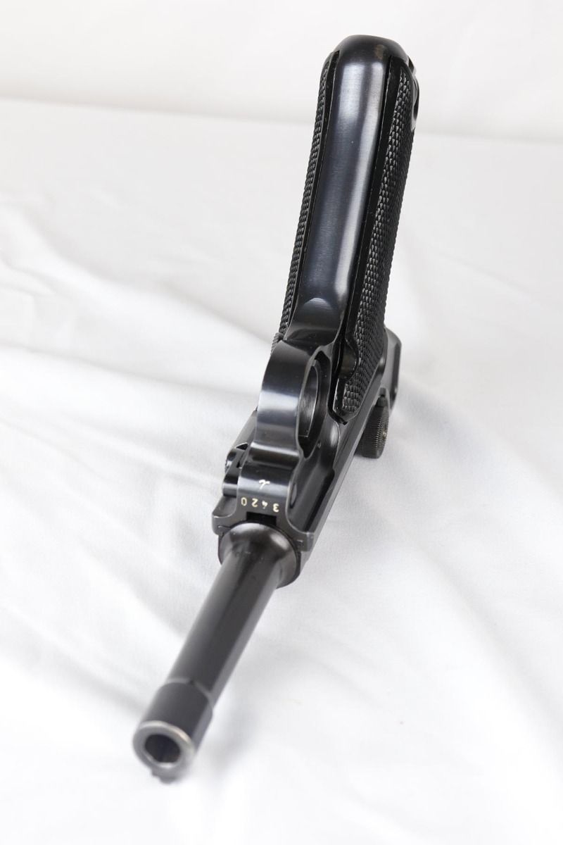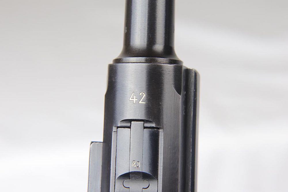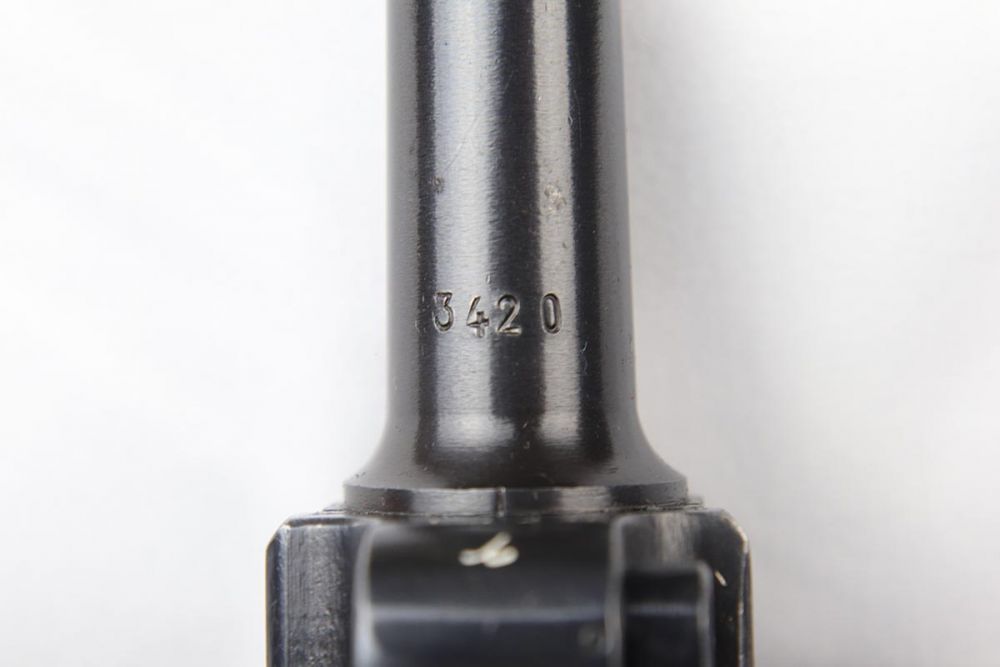 4/10/20 – This is an a very nice, fully matching and fully original Mauser luger from 1942, commonly referred to as a Black Widow due to the black plastic grips and magazine. The original finish rates at 97-98% with minor high edge wear on side plate and muzzle. All numbered parts are matching. The bore is shiny with strong rifling and very slight frost. FXO marked magazine.