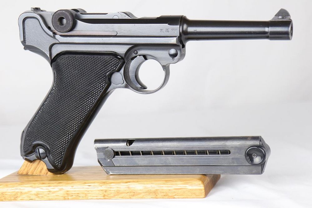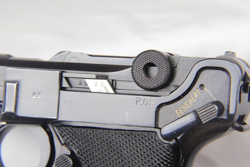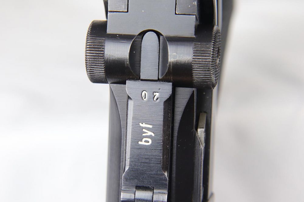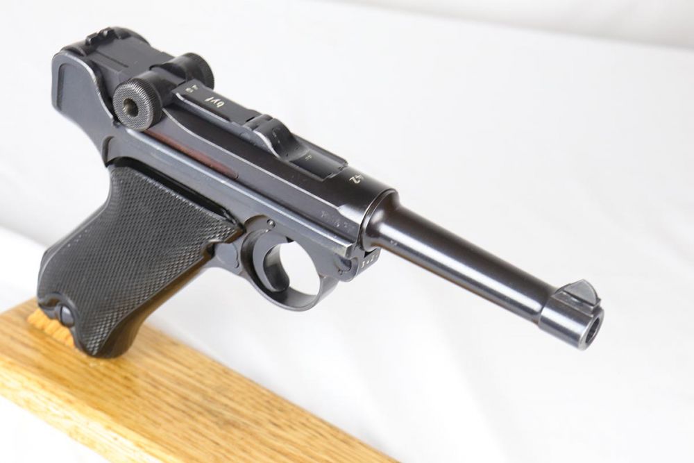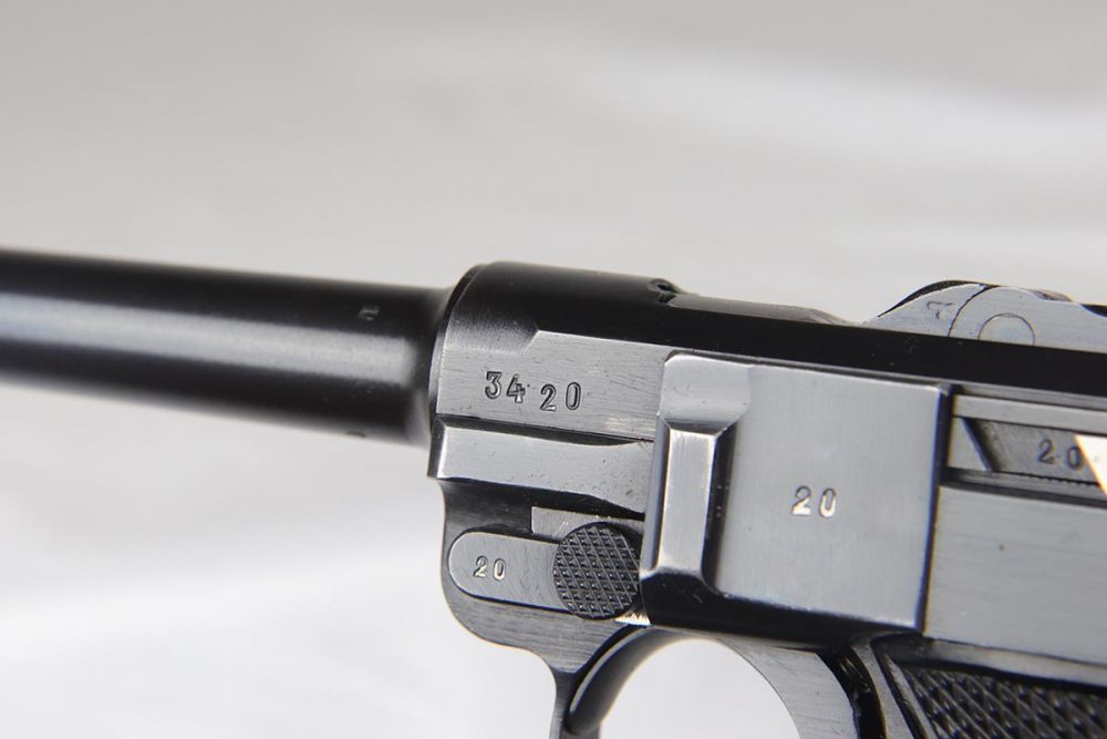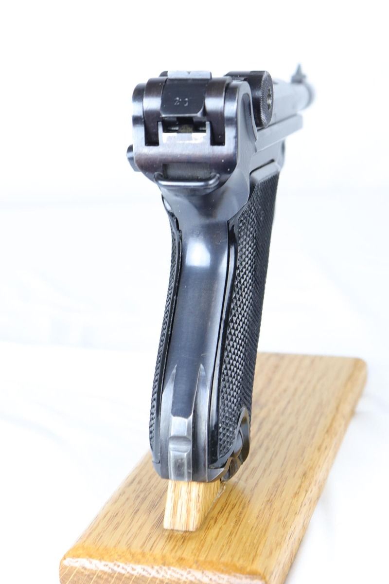 4/10/20 – This is an a very nice, fully matching and fully original Mauser luger from 1942, commonly referred to as a Black Widow due to the black plastic grips and magazine. The original finish rates at 97-98% with minor high edge wear on side plate and muzzle. All numbered parts are matching. The bore is shiny with strong rifling and very slight frost. FXO marked magazine.