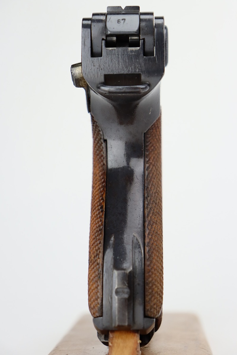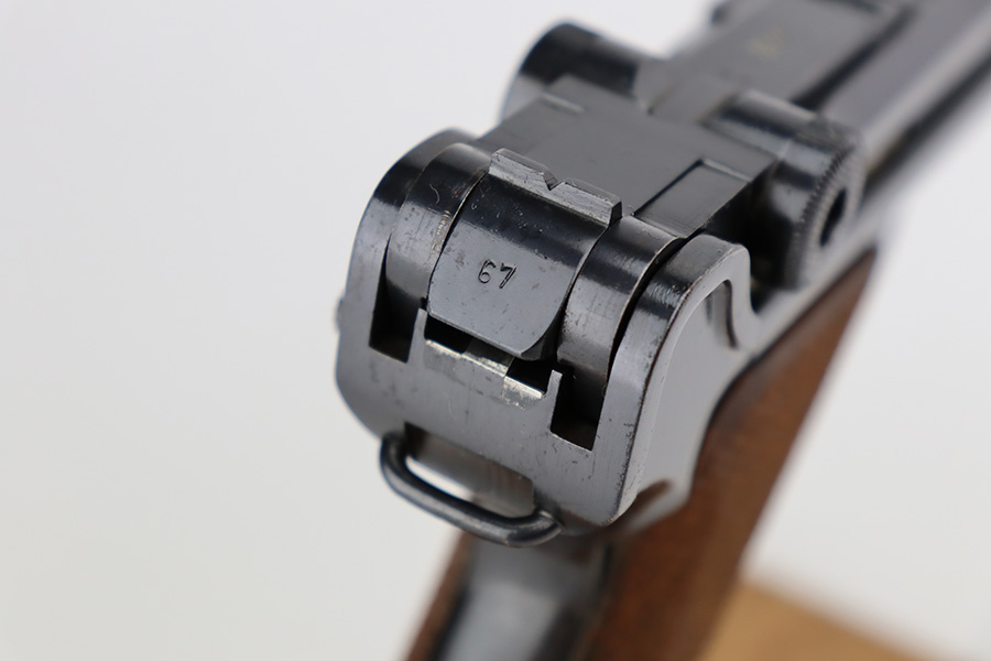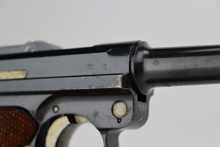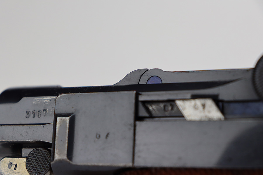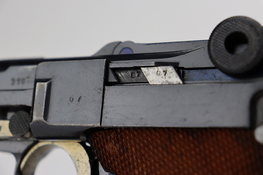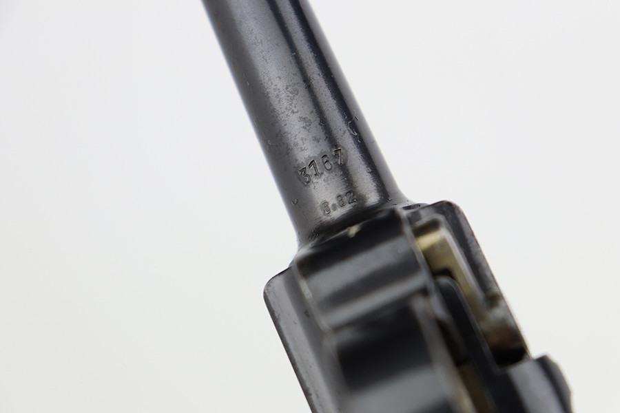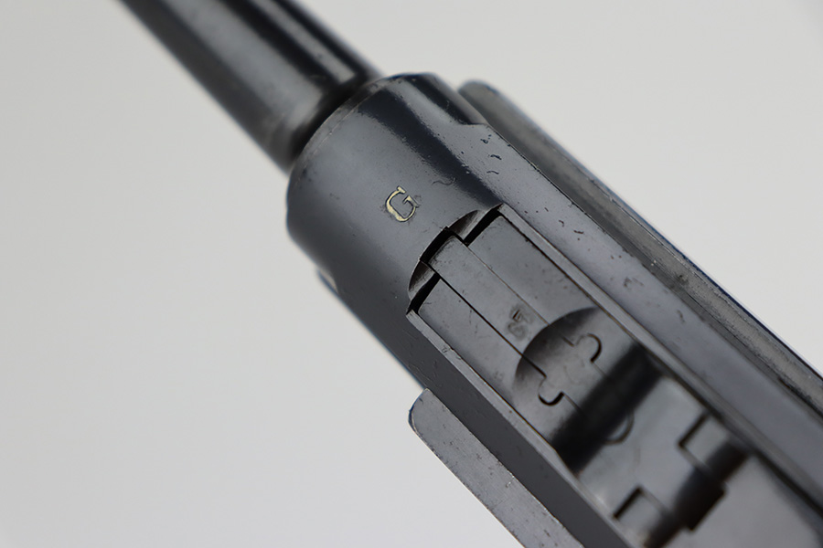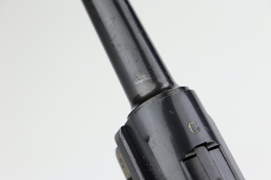 7/28/23 – This is a very nice Mauser Luger from 1935 with ‘G’ code on chamber. All numbered parts of the pistol match, including the original grips. Period original but mismatched magazine. The bluing is excellent but somewhat difficult to properly rate on this one, as there’s a general light thinning on the barrel and straps but not much actual bluing loss. Excellent bore. Beautiful grips with no chips or cracks.