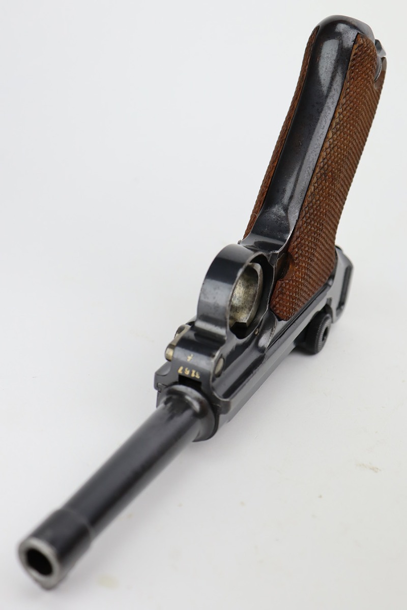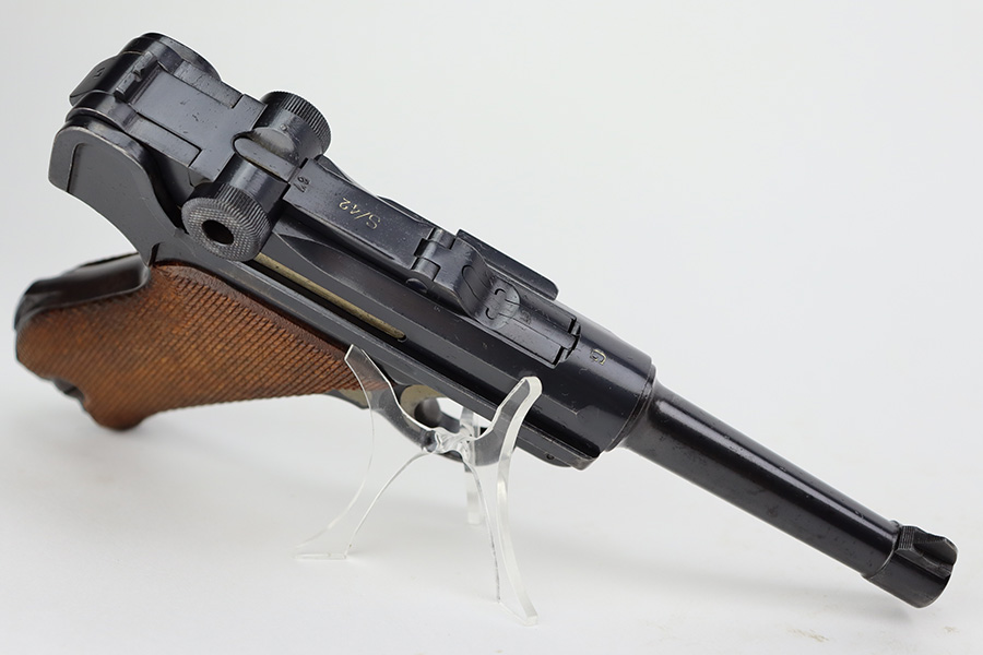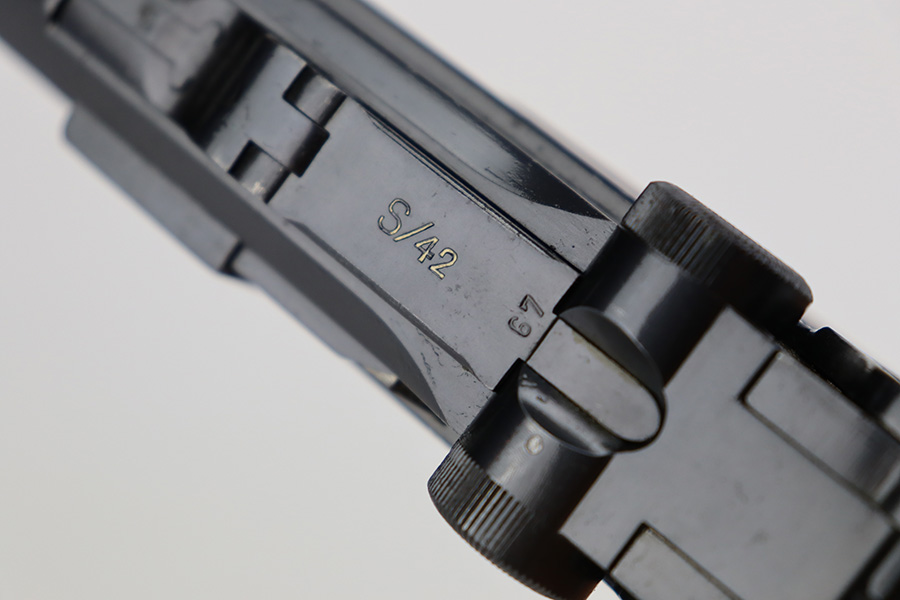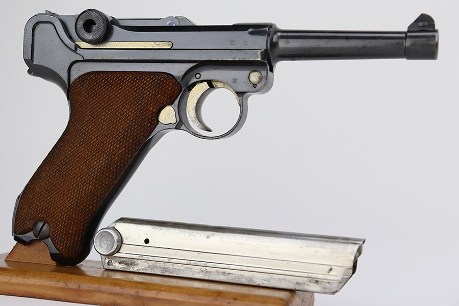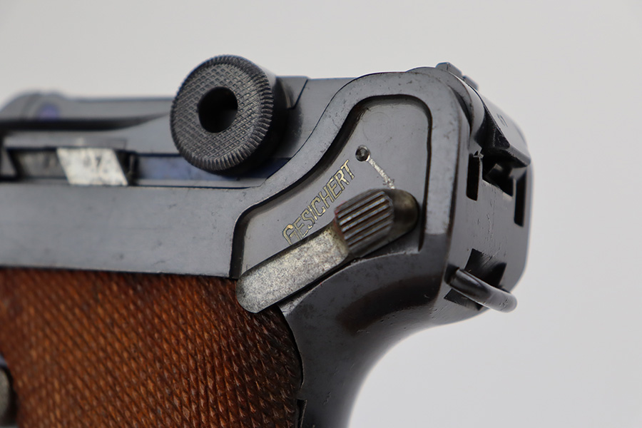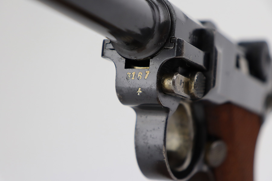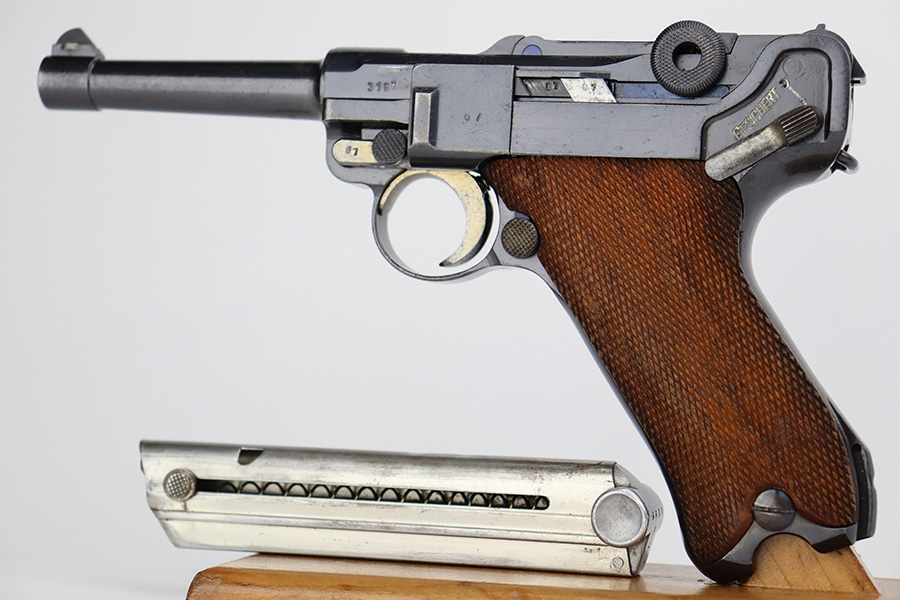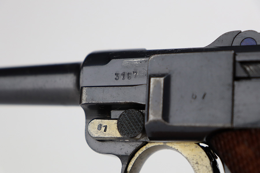 7/28/23 – This is a very nice Mauser Luger from 1935 with ‘G’ code on chamber. All numbered parts of the pistol match, including the original grips. Period original but mismatched magazine. The bluing is excellent but somewhat difficult to properly rate on this one, as there’s a general light thinning on the barrel and straps but not much actual bluing loss. Excellent bore. Beautiful grips with no chips or cracks.