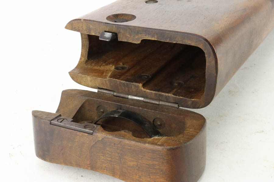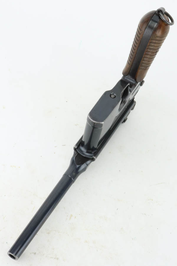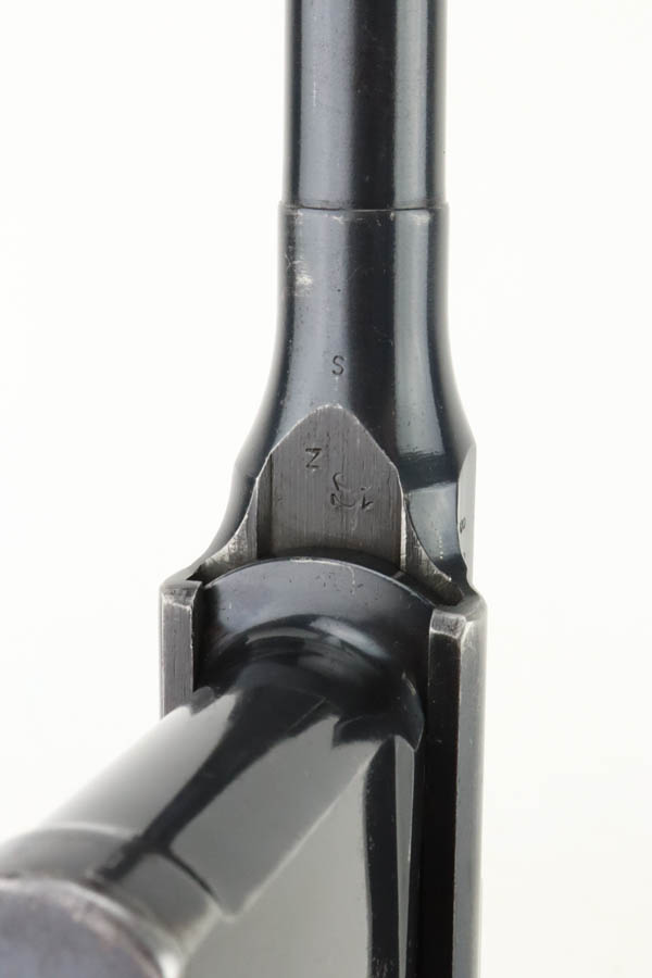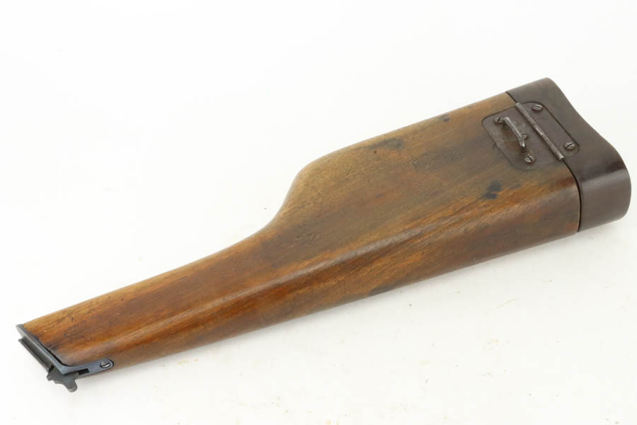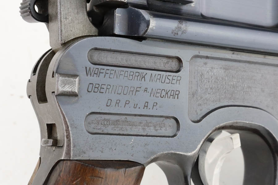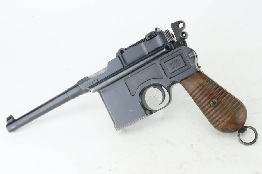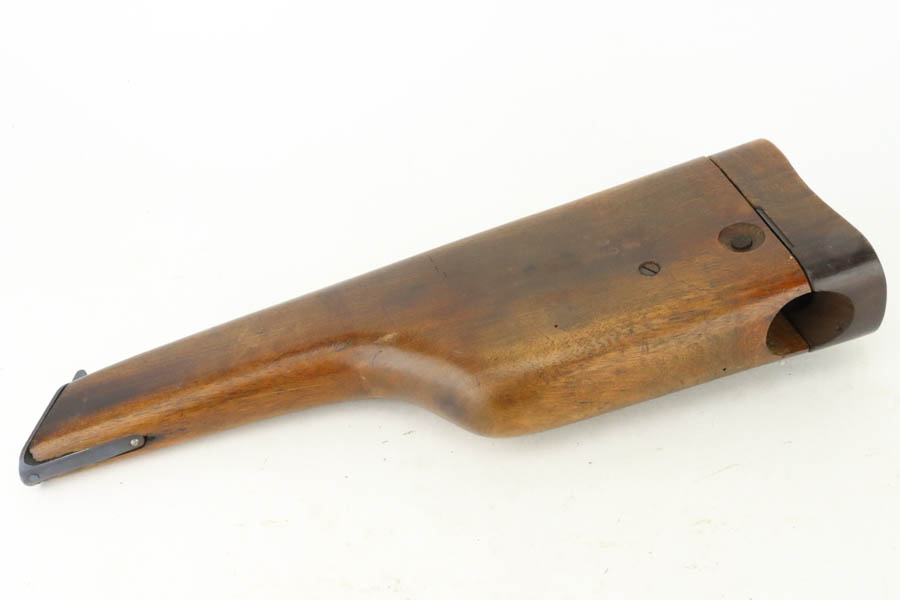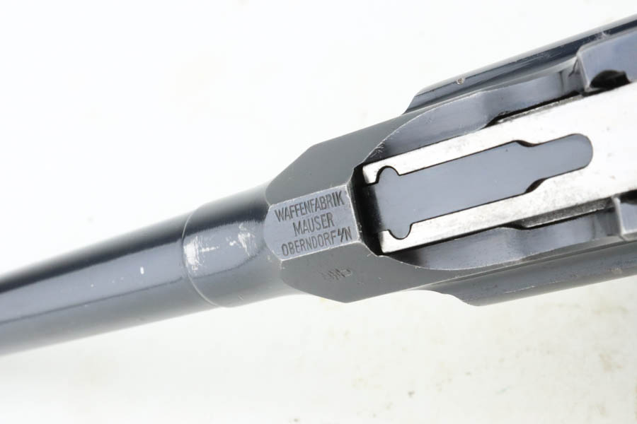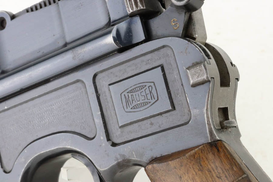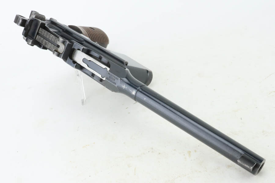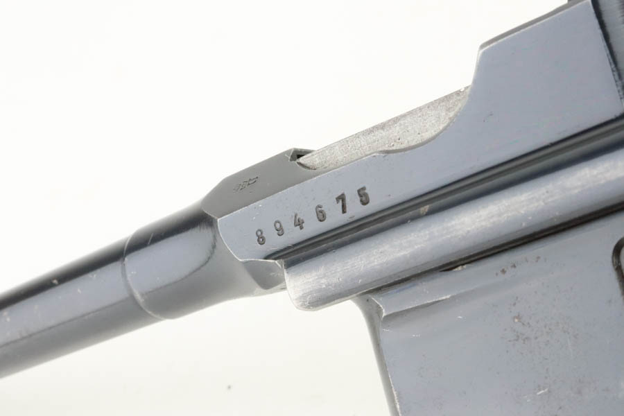 7/17/24 – This is an excellent example of a commercial Mauser Model 1930 Broomhandle from the 1930’s. This variant appeared in 1930, and was the first C-96 to have a real model designation. Mauser called it the Modell 1930, but the common modern name is the M-30. With the M-30, Mauser dropped the Bolo-sized C-96 for good, and reverted to the standard formula which had dominated throughout the prewar and wartime eras – 10 shot magazine, large grip, long barrel, 1000 meter tangent sight, and grooved walnut grip panels. This particular example comes with an excellent Mauser banner marked wood stock. The gun has retained about 95% of its original high polish finish. There is general high edge wear, some light marks here and there, and some patina on the grip straps. Fitted with un-numbered wood grips. Excellent, shiny bore.