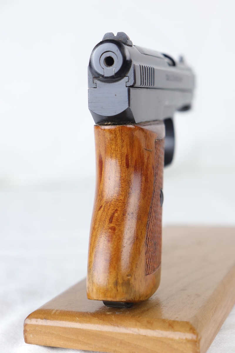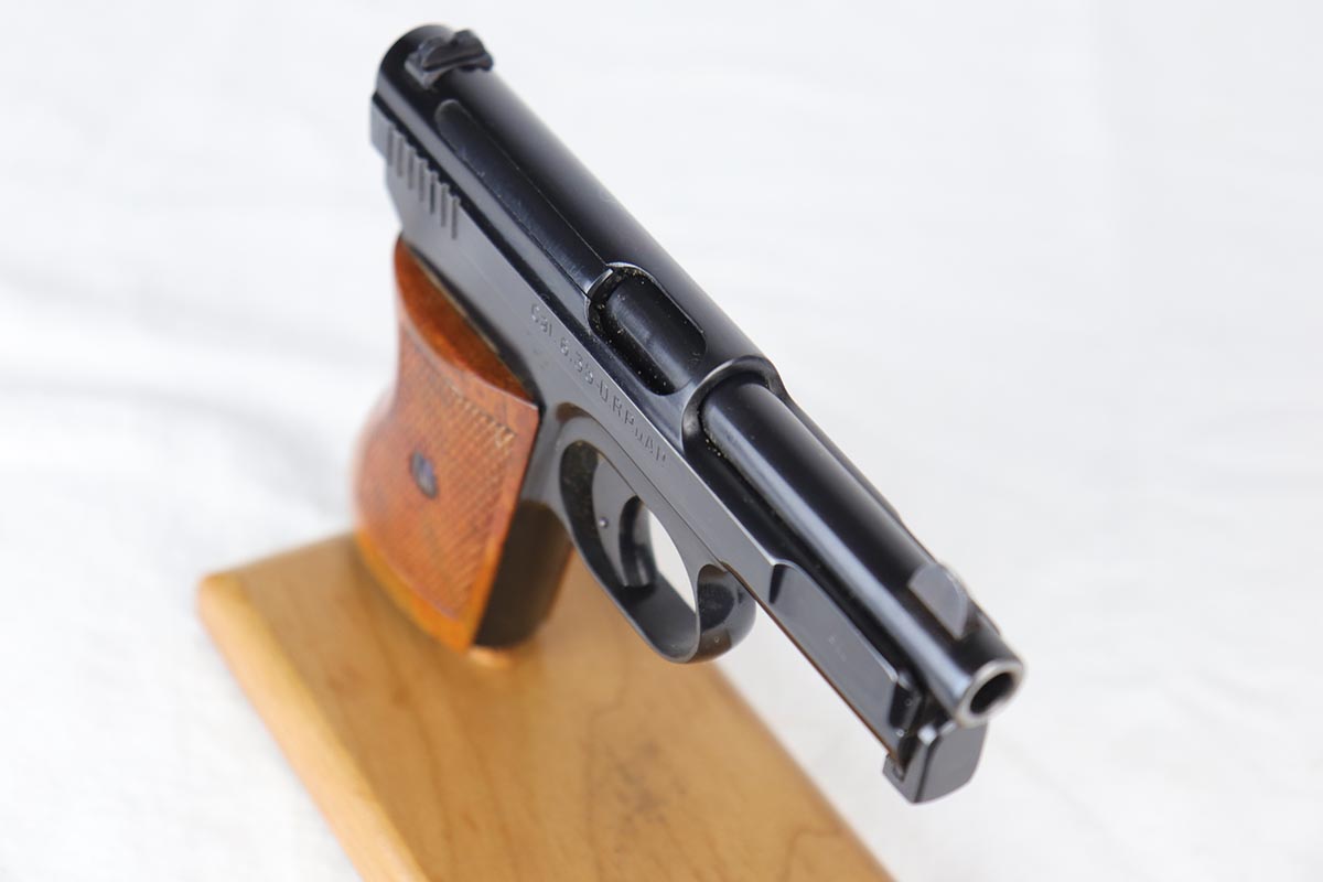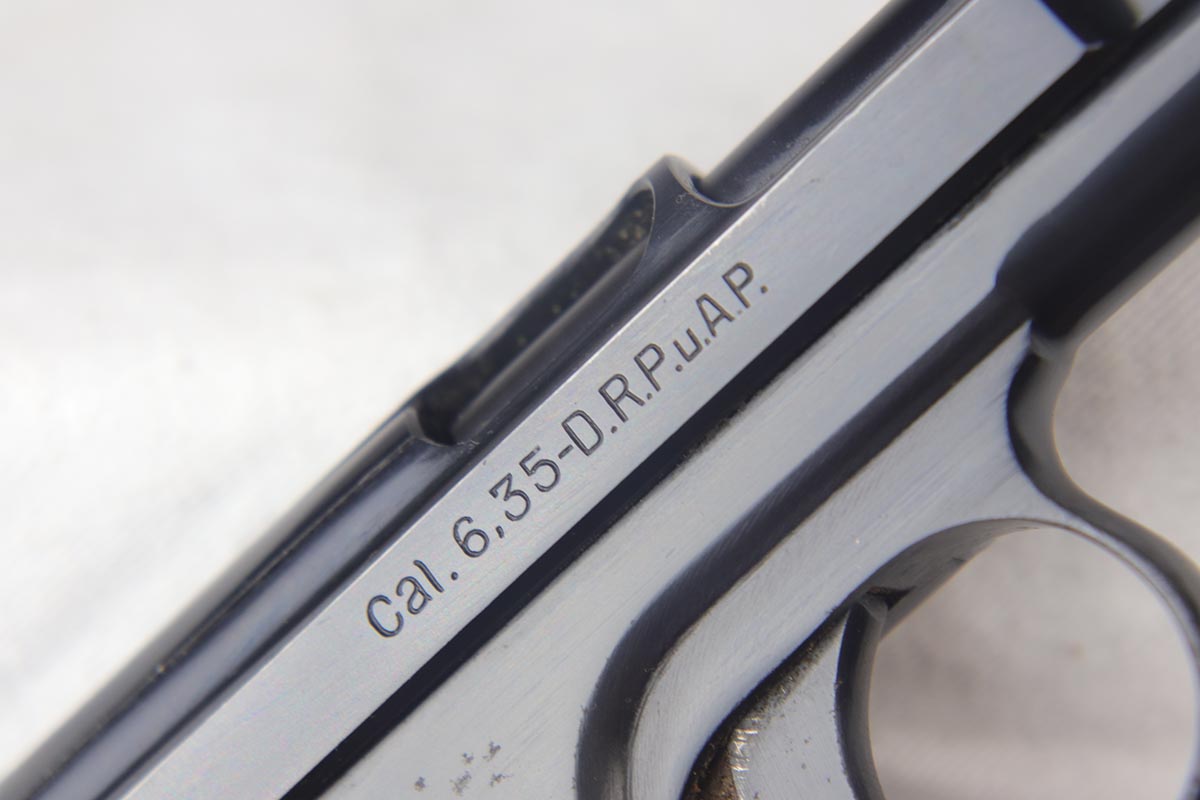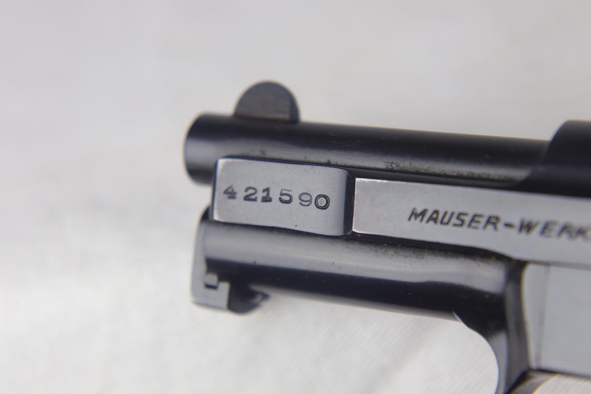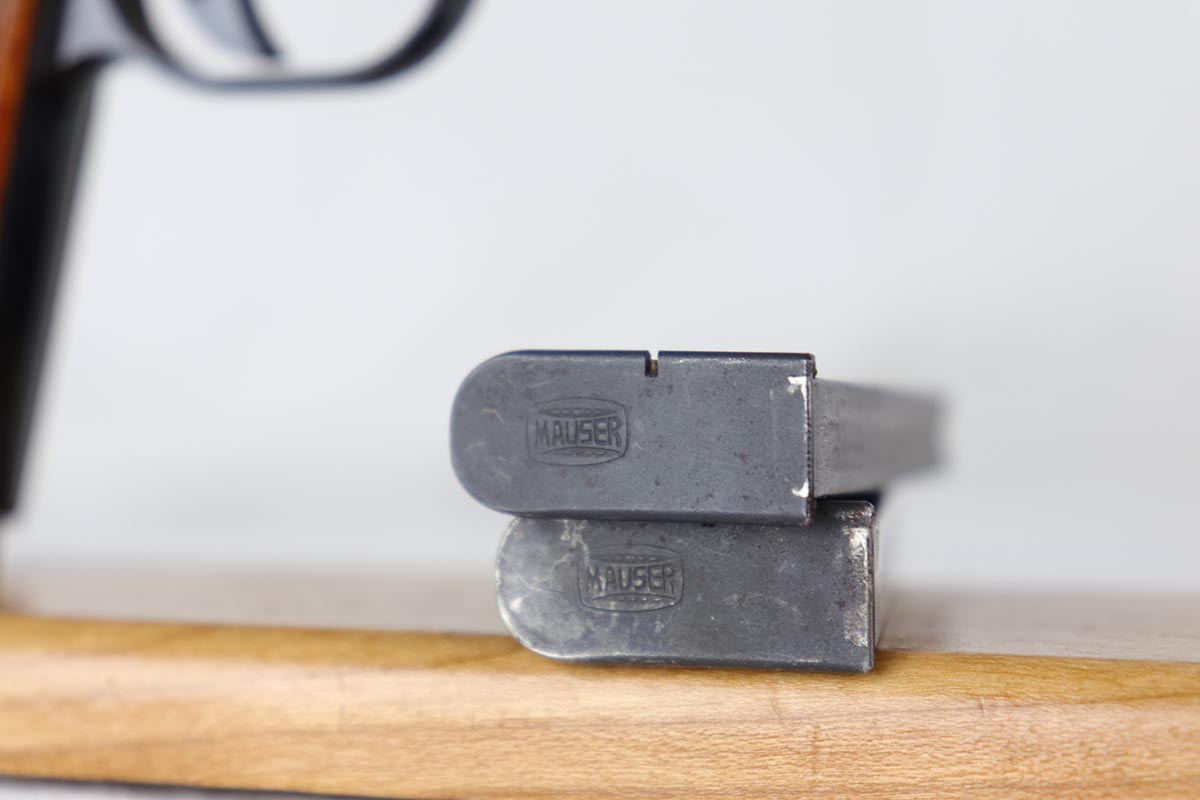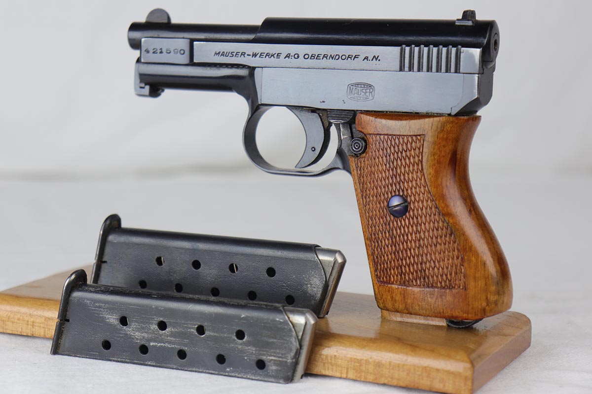 7/25/18 – This is a near-mint Mauser model 1910 pistol with two original magazines. The finish rates at 98+% blue with minor edge wear on the back left side of the frame, and a small area of freckling on the trigger guard. Minty bore and grips. Crown/U proofs on slide. Both magazines feature Mauser banner on base plate.