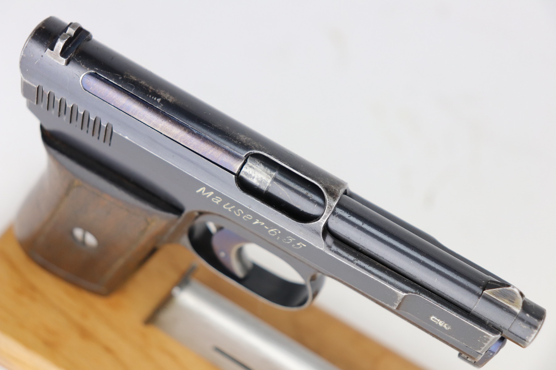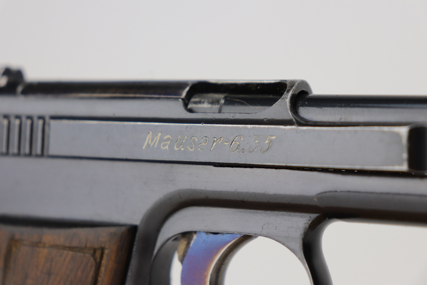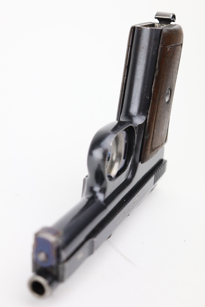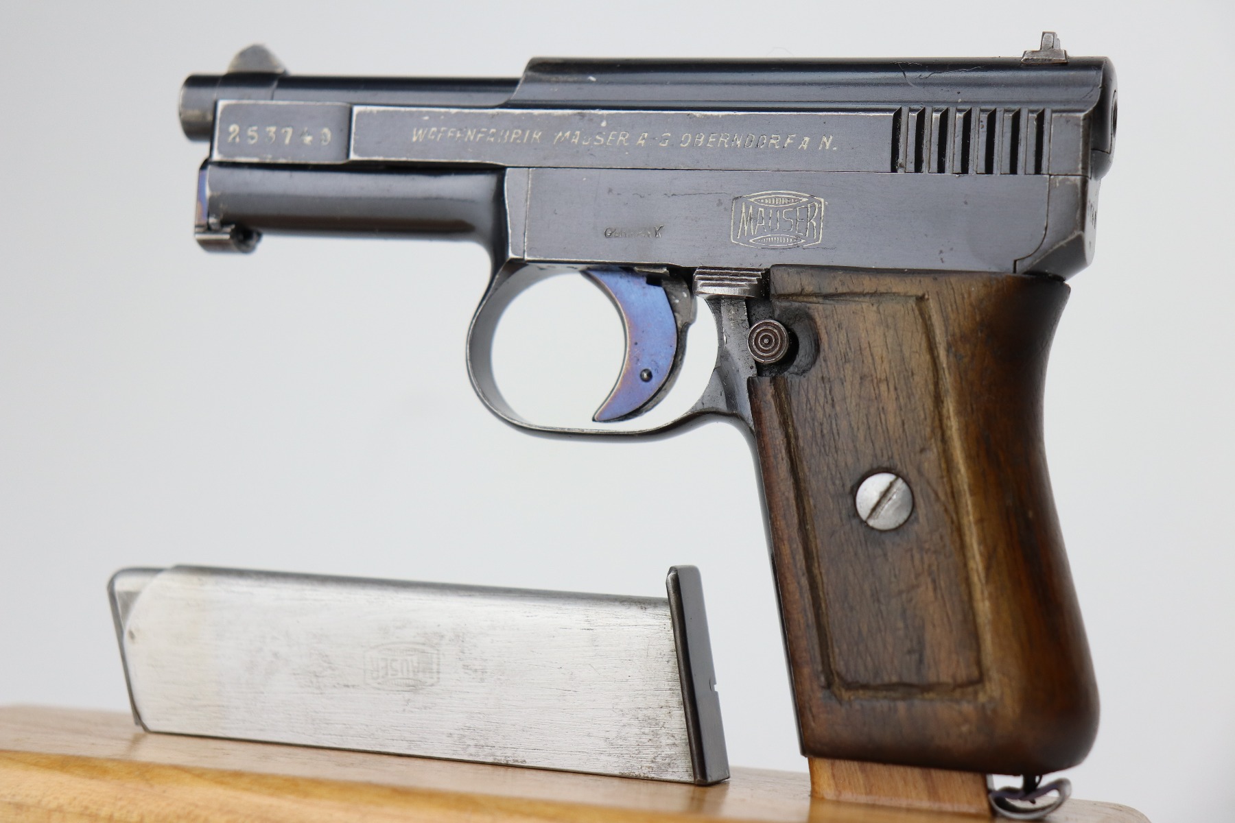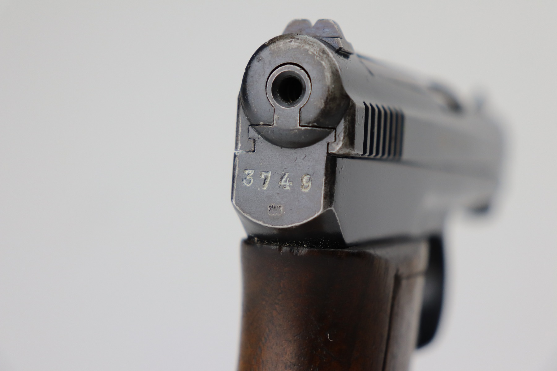 3/31/21 – This is an excellent example of a Mauser Model 1910. It is all matching and has the proper “Crown U” proofs. It has a “Germany” export mark on the left side of the frame, indicating it was sold in the international commercial market. There is an unknown marking on the tang. It looks to be a “Script W”. We’re not sure what it means – could be a retailer. The gun has retained about 95% of its original bluing. There is spotty wear on the front strap, around the muzzle, on the high edges of the slide, and on the top of the slide. The fire bluing on the trigger is in tact, but the screws have no finish. Comes with a nice grip and a period-correct magazine. The grip has minor bruises throughout.