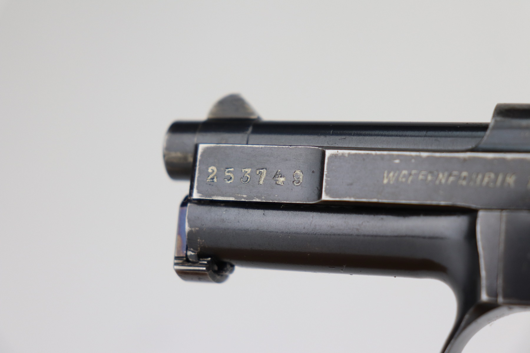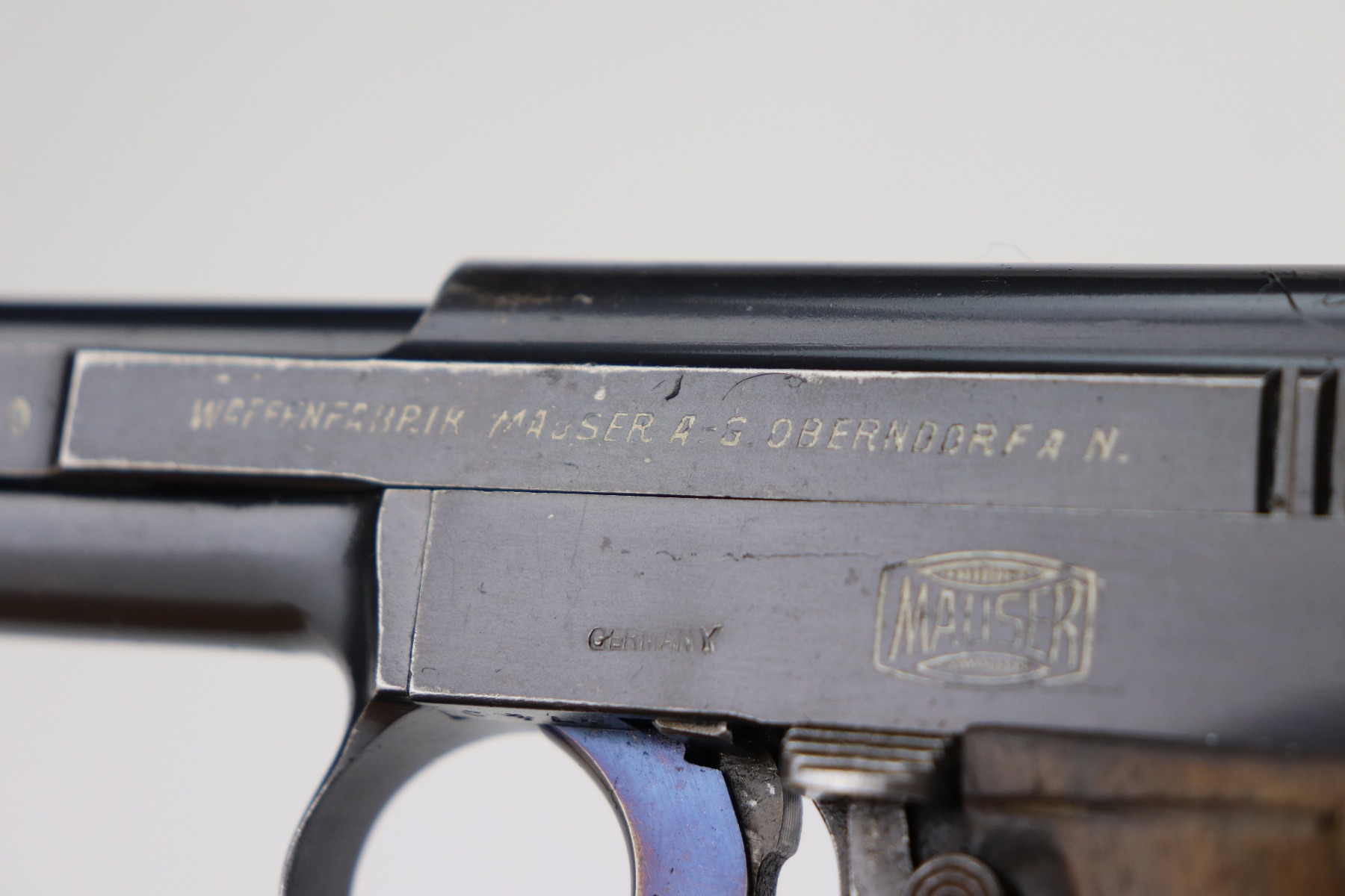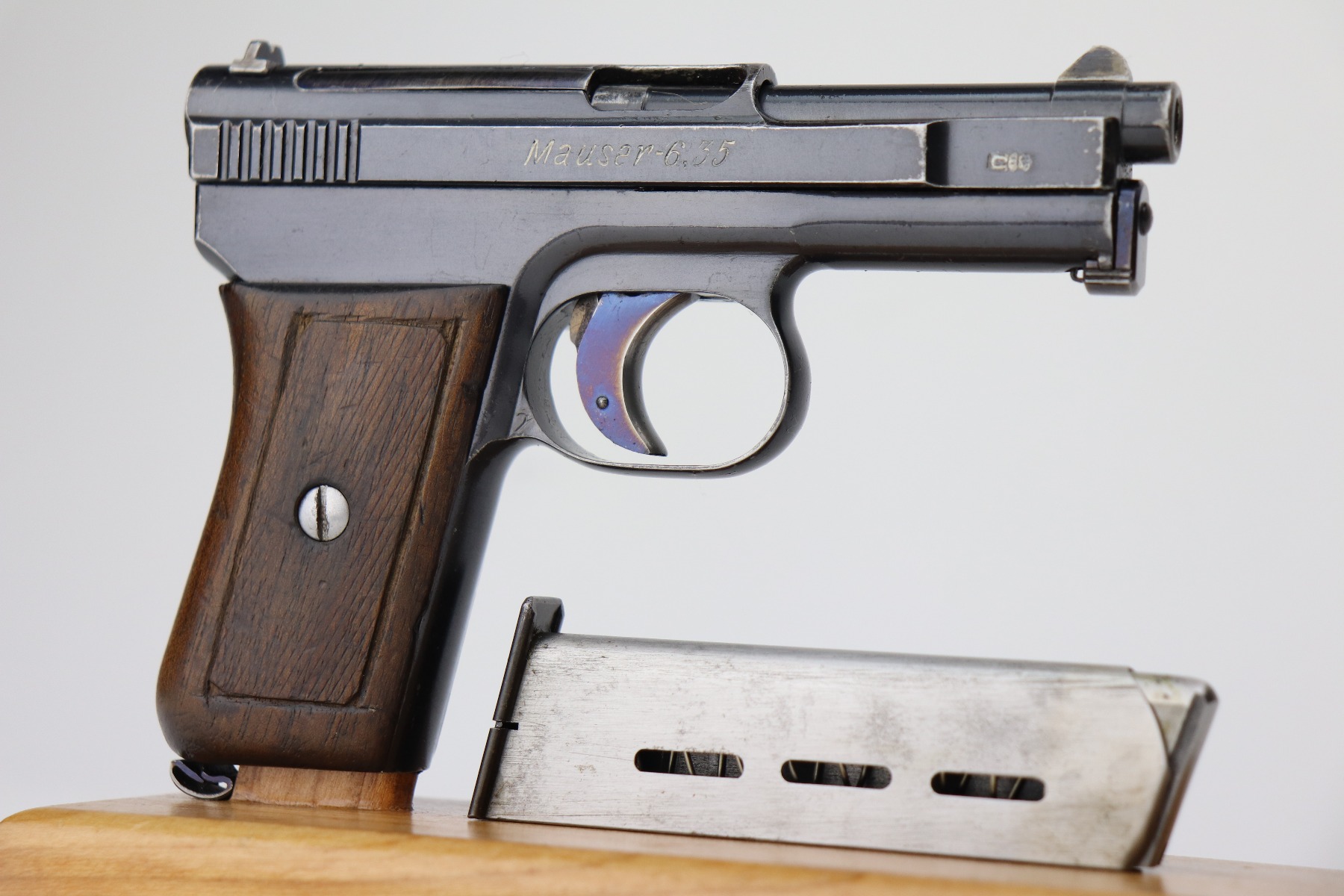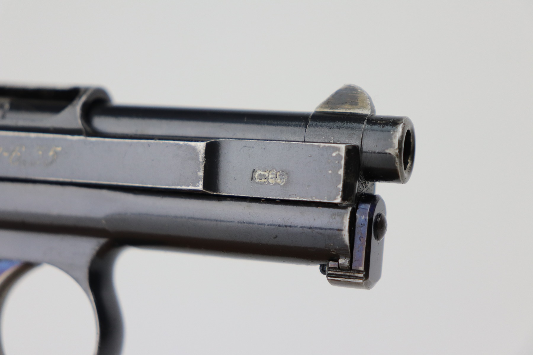 3/31/21 – This is an excellent example of a Mauser Model 1910. It is all matching and has the proper “Crown U” proofs. It has a “Germany” export mark on the left side of the frame, indicating it was sold in the international commercial market. There is an unknown marking on the tang. It looks to be a “Script W”. We’re not sure what it means – could be a retailer. The gun has retained about 95% of its original bluing. There is spotty wear on the front strap, around the muzzle, on the high edges of the slide, and on the top of the slide. The fire bluing on the trigger is in tact, but the screws have no finish. Comes with a nice grip and a period-correct magazine. The grip has minor bruises throughout.