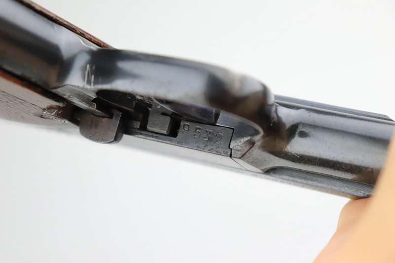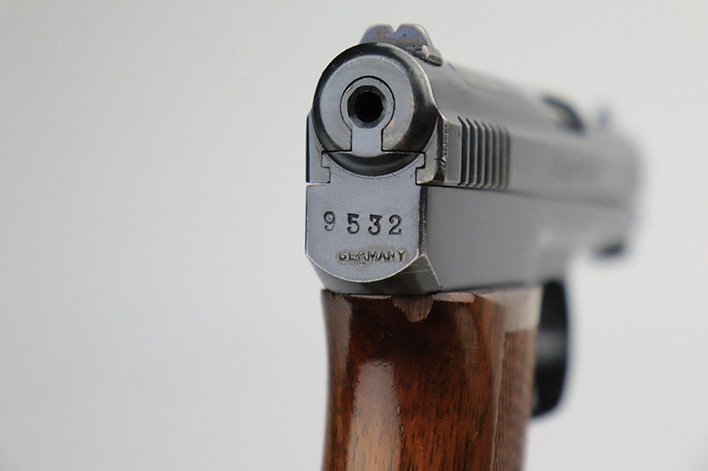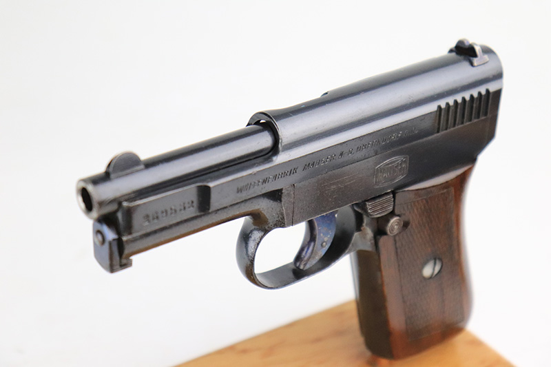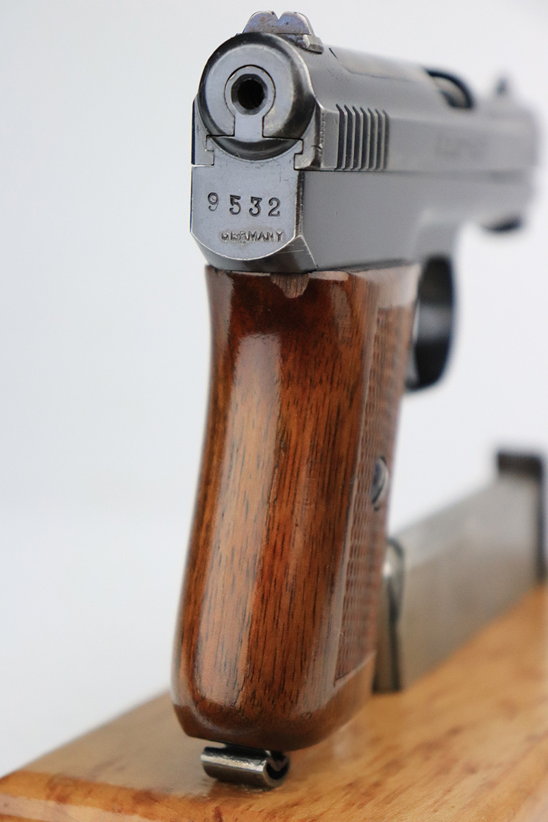 10/11/22 – This is an excellent example of a Mauser Model 1910 manufactured in the 1920’s. It is all matching and has the proper “Crown U” commercial proofs. It has retained about 98% of its original finish. While there is very little actual finish loss, there are areas with tiny dots of oxidation on the left side of the frame, underside of the frame, and left side of the trigger. Some light surface rust on the front strap. A few very light scratches on the left side of the frame and around the muzzle. Comes with a nice wood grip – tiny chip on the spine. Also comes with one period-correct magazine and one reproduction magazine. Mint bore.