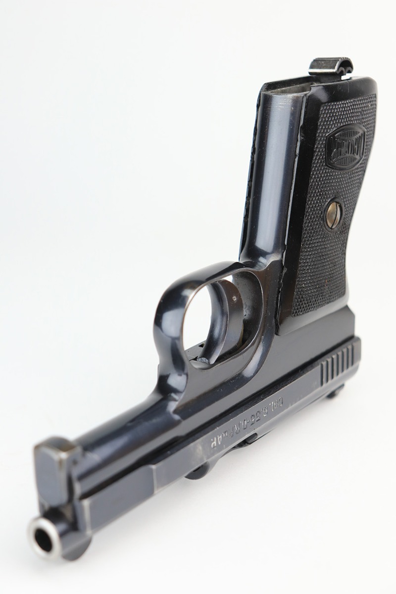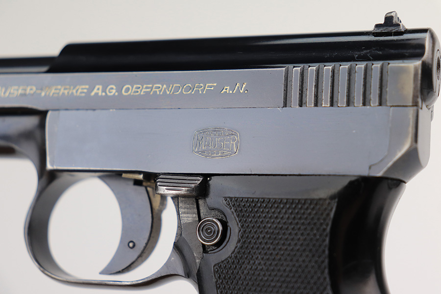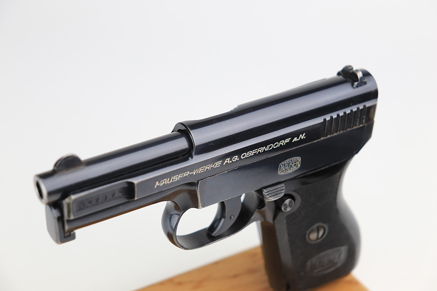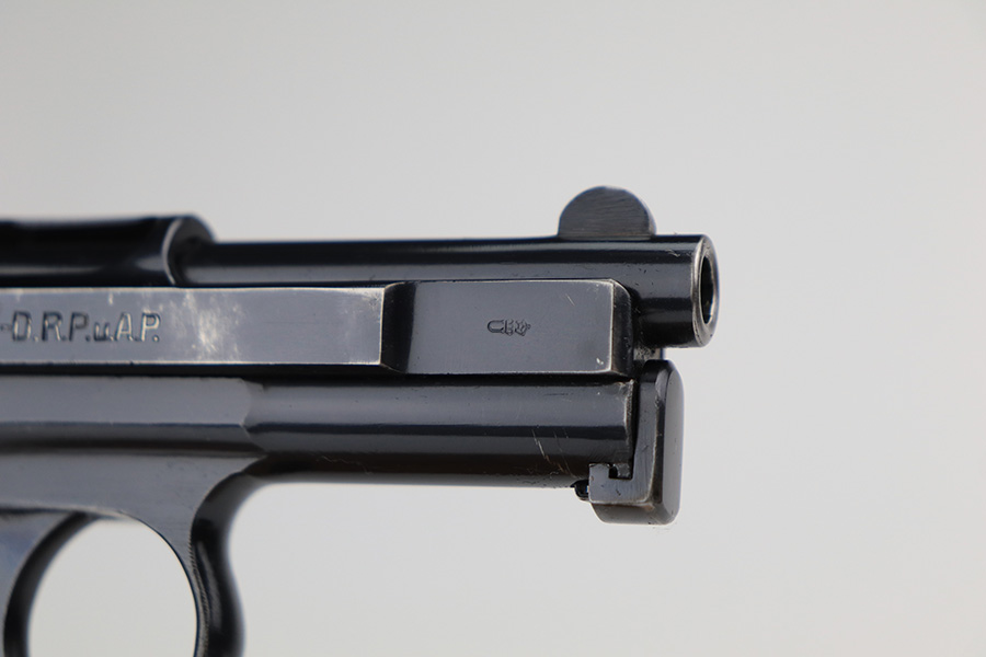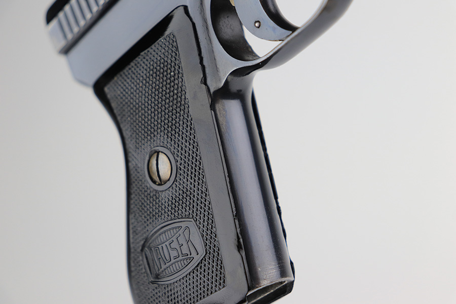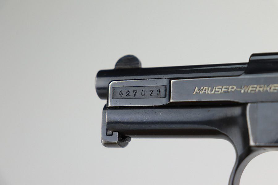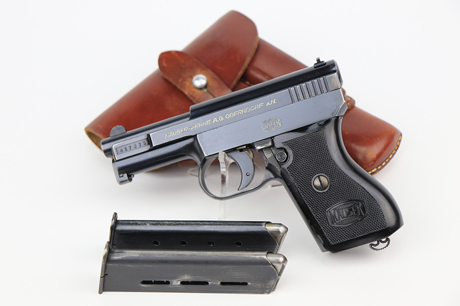 10/22/24 – This is an excellent example of a transitional Mauser Model 1910/34 sold in the commercial market in the 1930’s. The gun is all matching and has the proper “Crown U” commercial proofs. It comes as a rig with two proper magazines and a rare and minty .25 caliber leather Akah holster with a “Mauser 6.35mm” ink stamp on the inside. Also on the inside is a handwritten name, address, and what looks like a GI number. The gun has retained about 96% of its original high polish finish. There is very minor wear concentrated around the muzzle and on the side rail of the slide – mostly on the right side. A few tiny handling marks on the front strap. Comes with a period-correct black bakelite grip – there are some tiny chips along the front edges of the grip. The bore is mint.