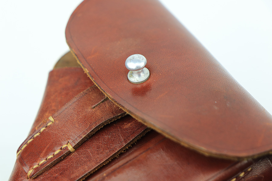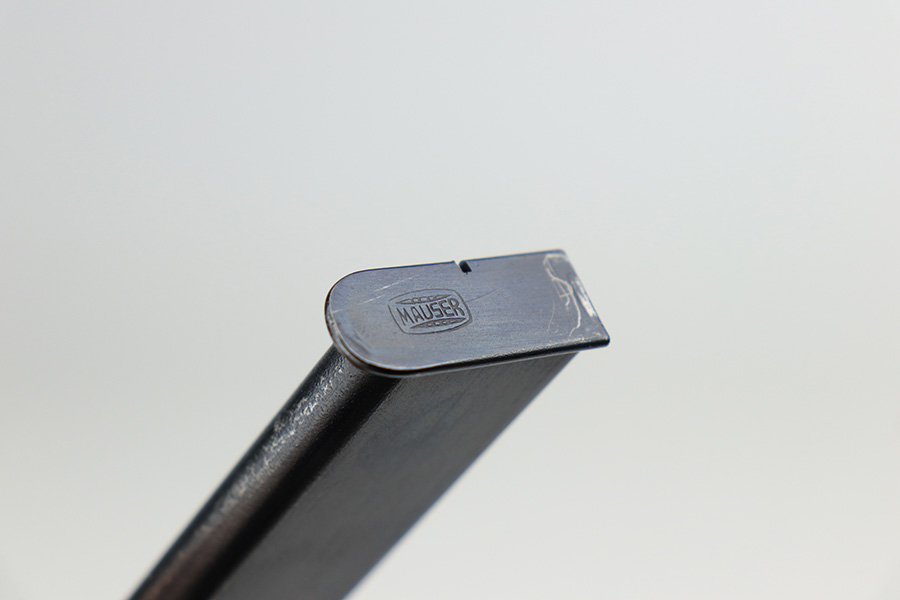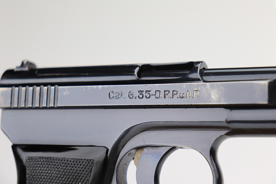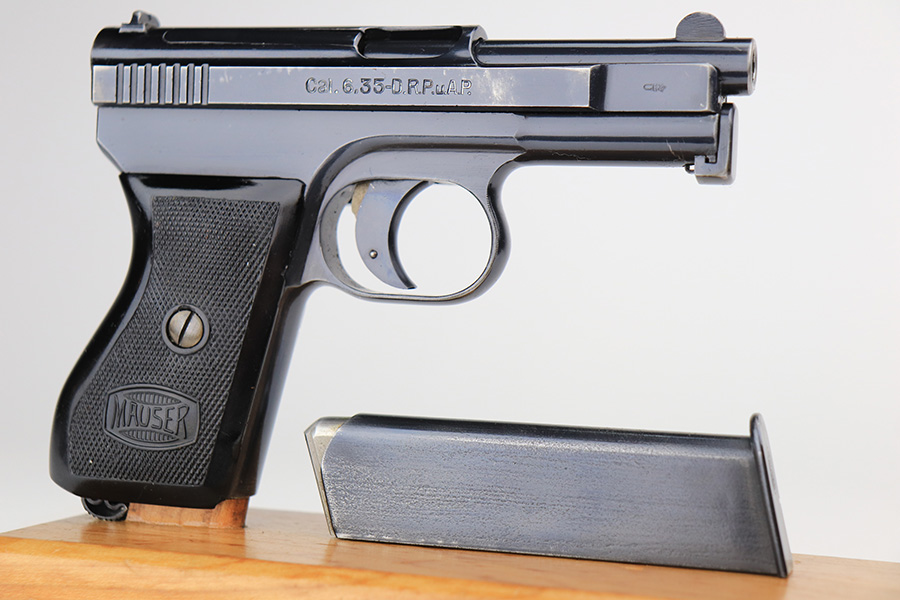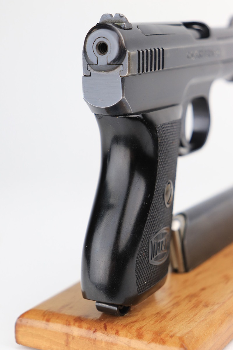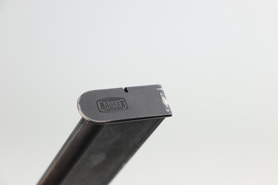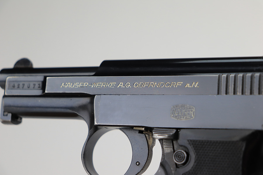 10/22/24 – This is an excellent example of a transitional Mauser Model 1910/34 sold in the commercial market in the 1930’s. The gun is all matching and has the proper “Crown U” commercial proofs. It comes as a rig with two proper magazines and a rare and minty .25 caliber leather Akah holster with a “Mauser 6.35mm” ink stamp on the inside. Also on the inside is a handwritten name, address, and what looks like a GI number. The gun has retained about 96% of its original high polish finish. There is very minor wear concentrated around the muzzle and on the side rail of the slide – mostly on the right side. A few tiny handling marks on the front strap. Comes with a period-correct black bakelite grip – there are some tiny chips along the front edges of the grip. The bore is mint.