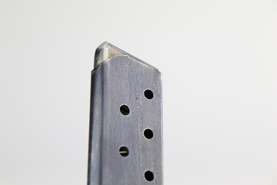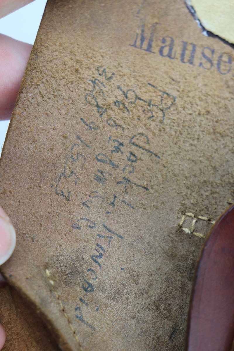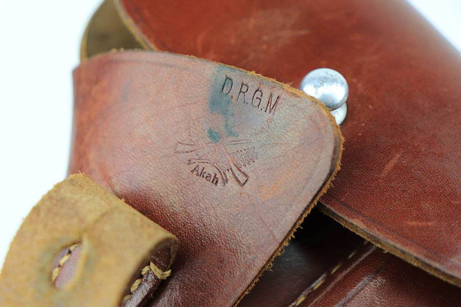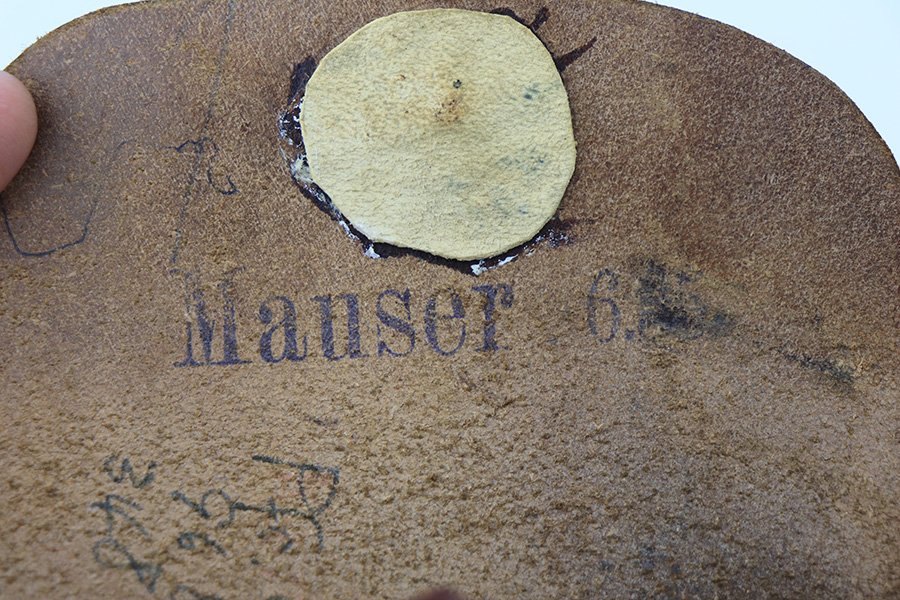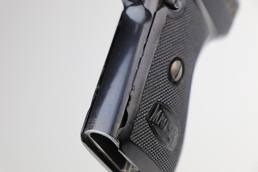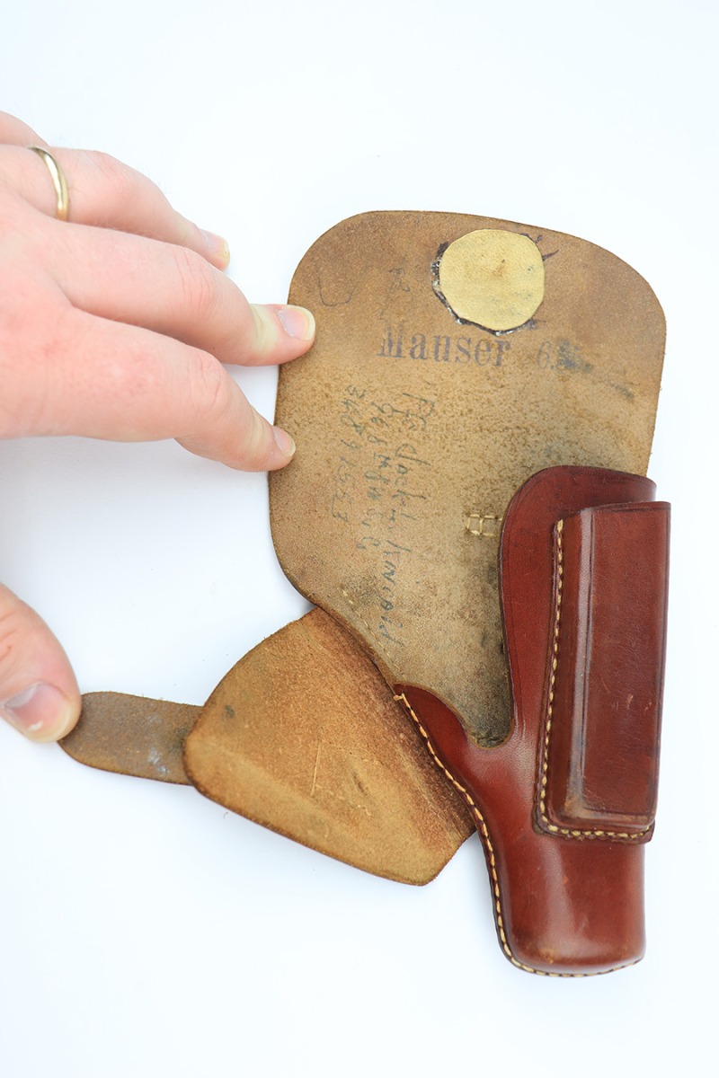 10/22/24 – This is an excellent example of a transitional Mauser Model 1910/34 sold in the commercial market in the 1930’s. The gun is all matching and has the proper “Crown U” commercial proofs. It comes as a rig with two proper magazines and a rare and minty .25 caliber leather Akah holster with a “Mauser 6.35mm” ink stamp on the inside. Also on the inside is a handwritten name, address, and what looks like a GI number. The gun has retained about 96% of its original high polish finish. There is very minor wear concentrated around the muzzle and on the side rail of the slide – mostly on the right side. A few tiny handling marks on the front strap. Comes with a period-correct black bakelite grip – there are some tiny chips along the front edges of the grip. The bore is mint.