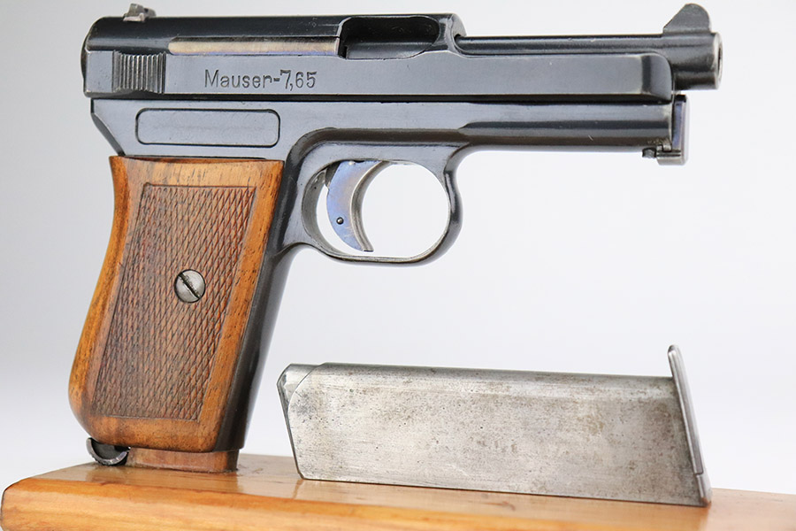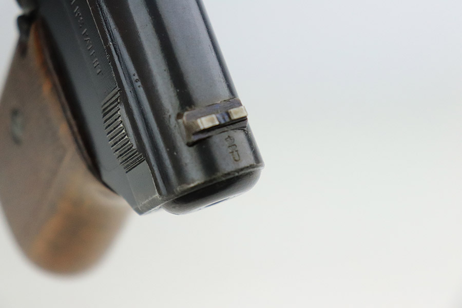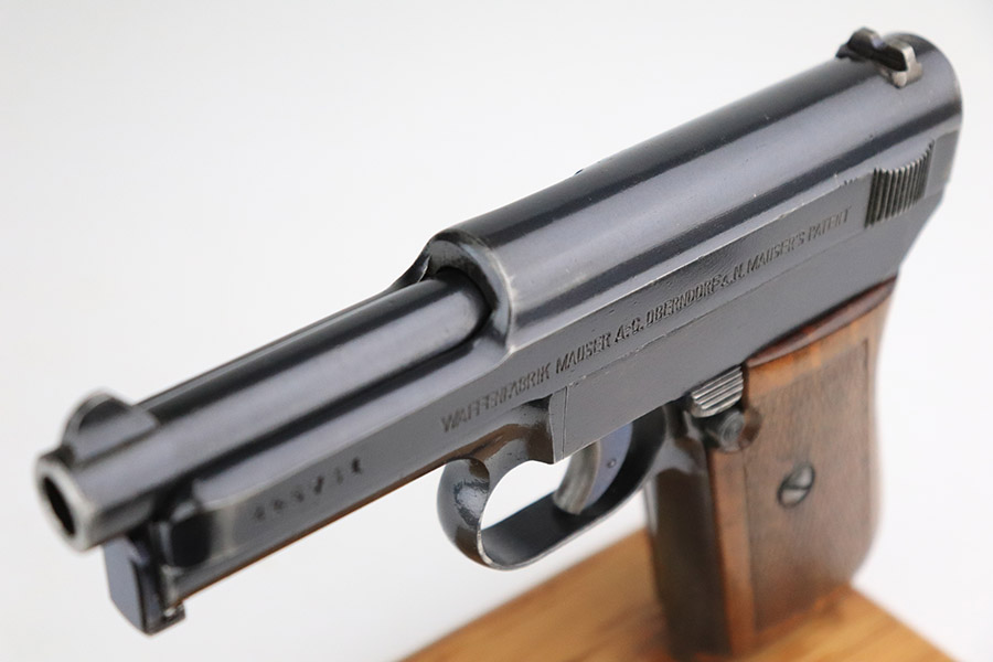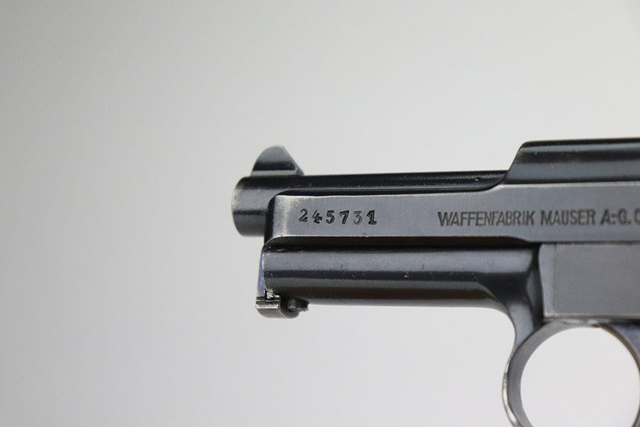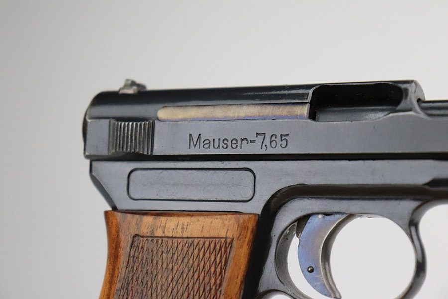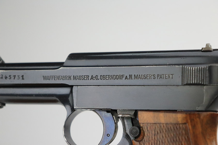 10/26/22 – This is an excellent example of a Mauser Model 1914 sold in the commercial market in the 1920’s. It is all matching and properly “Crown U” proofed. “Germany” export marking on the back of the frame. It has retained about 97% of its original finish. The majority of the finish loss is in an area at the very back of the slide and frame. Very minor muzzle and high edge wear. Very minor thinning and pin-pricking on the front strap. Comes with a very nice wood grip and one proper magazine. Excellent bore with strong rifling.