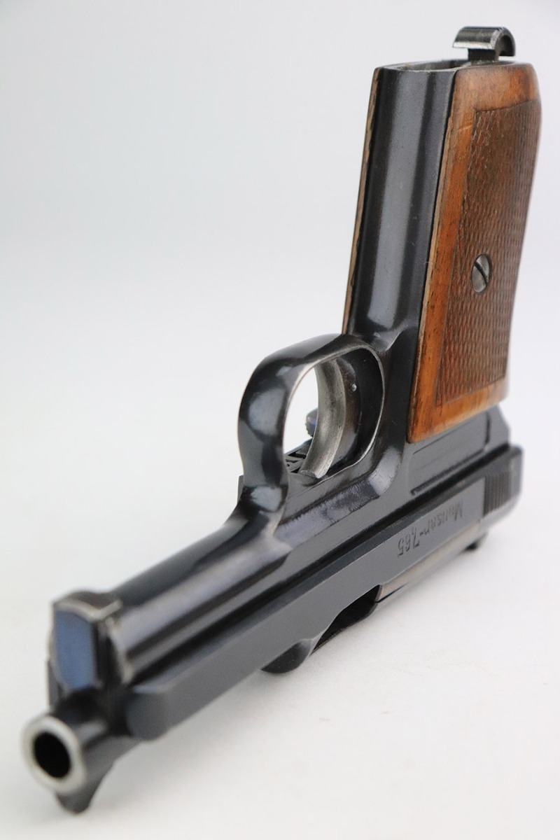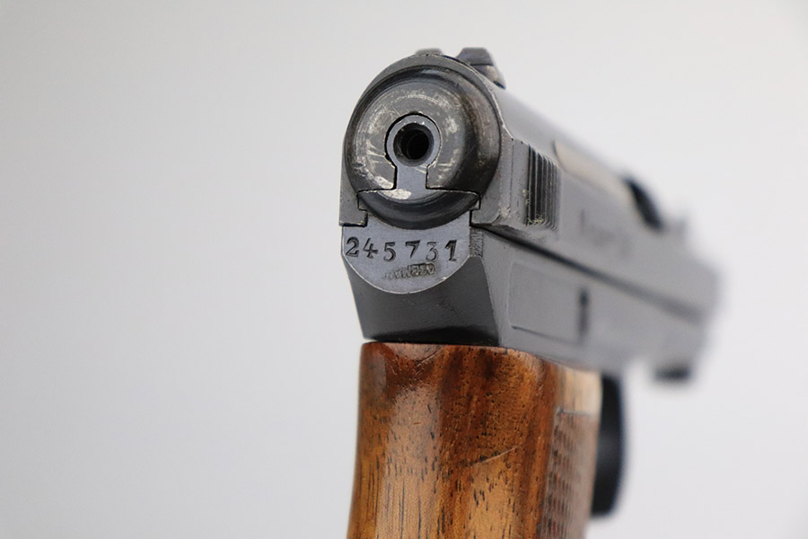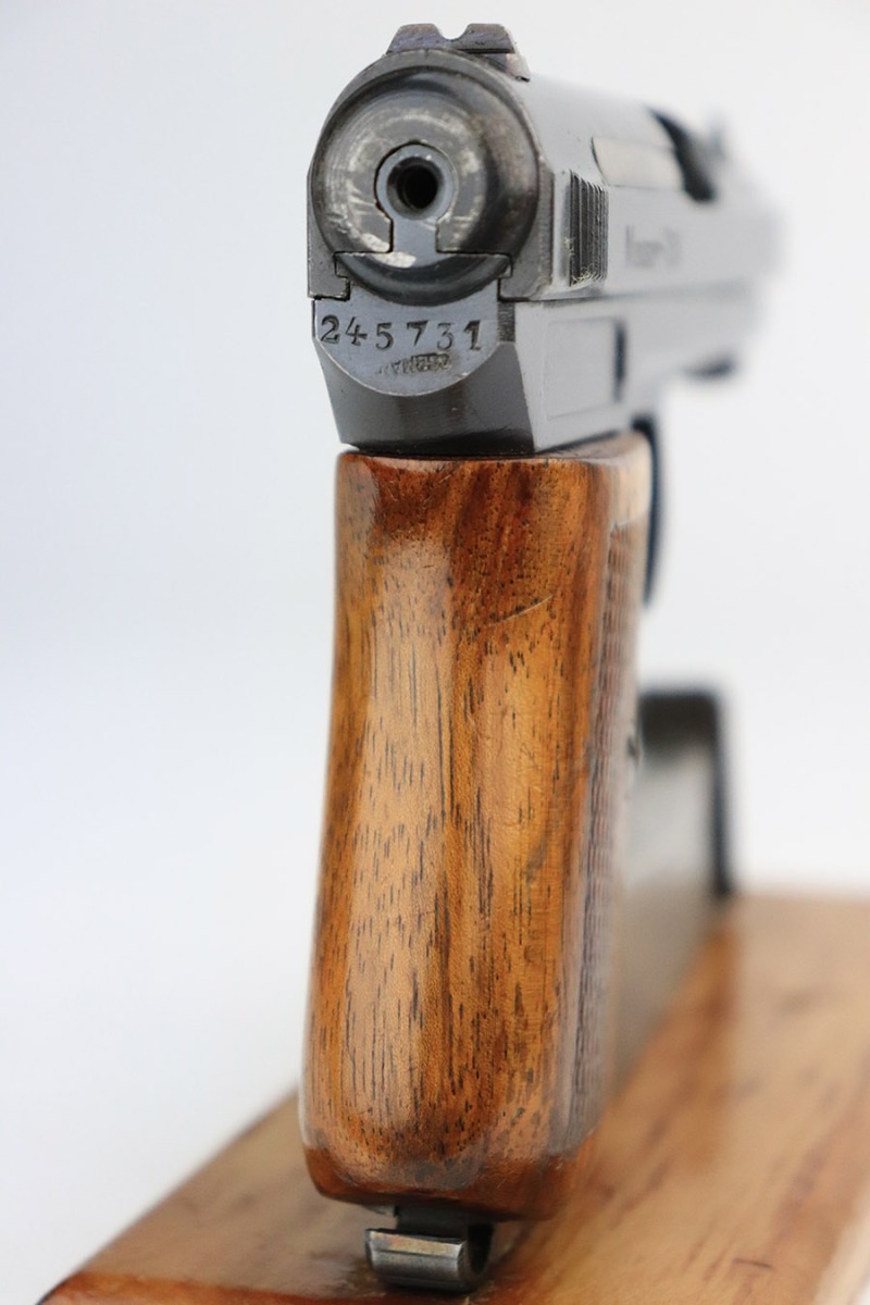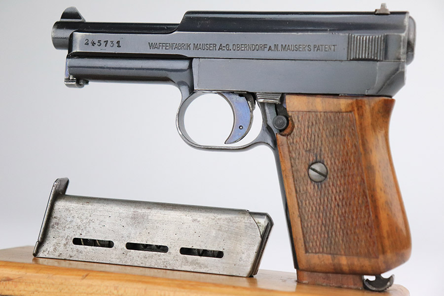 10/26/22 – This is an excellent example of a Mauser Model 1914 sold in the commercial market in the 1920’s. It is all matching and properly “Crown U” proofed. “Germany” export marking on the back of the frame. It has retained about 97% of its original finish. The majority of the finish loss is in an area at the very back of the slide and frame. Very minor muzzle and high edge wear. Very minor thinning and pin-pricking on the front strap. Comes with a very nice wood grip and one proper magazine. Excellent bore with strong rifling.