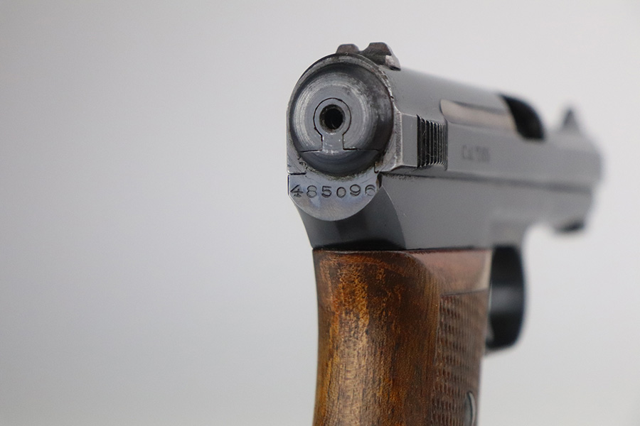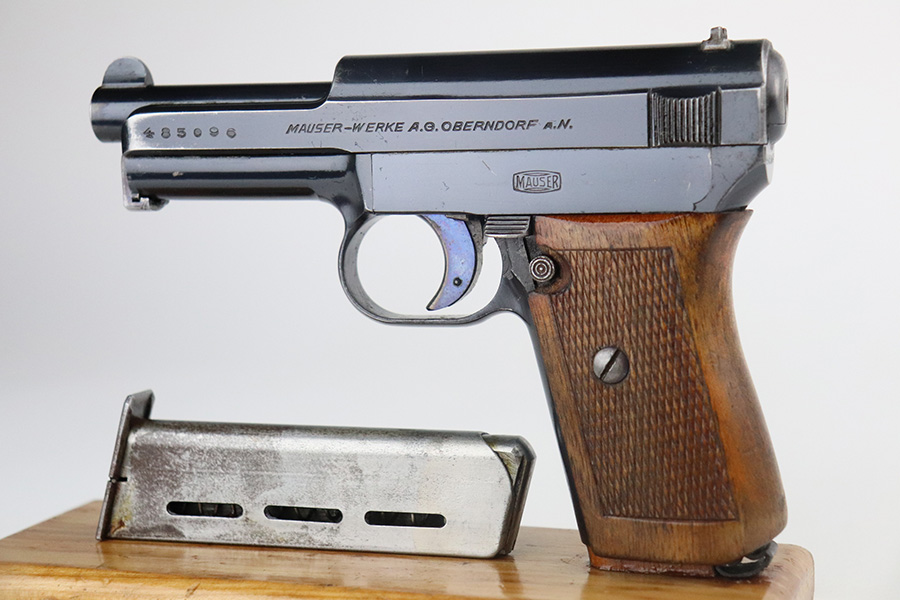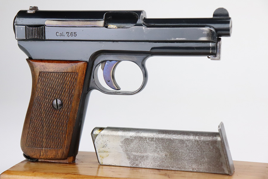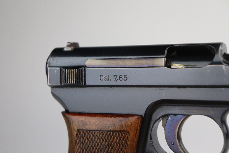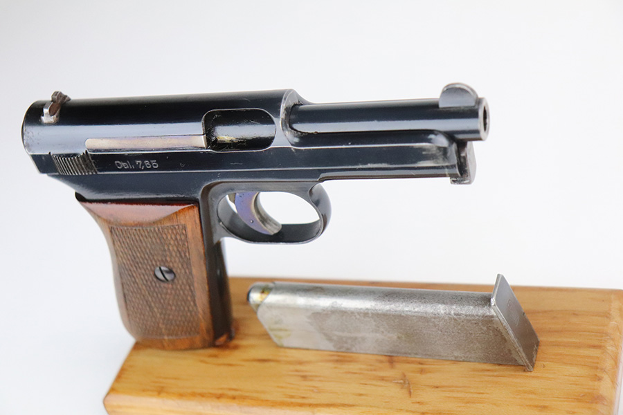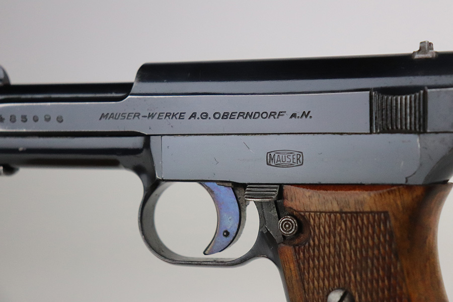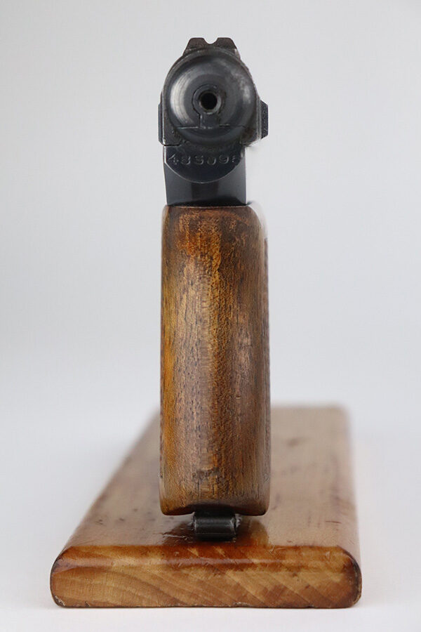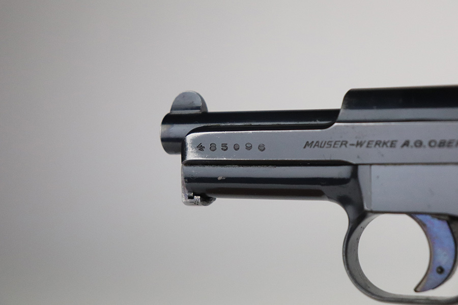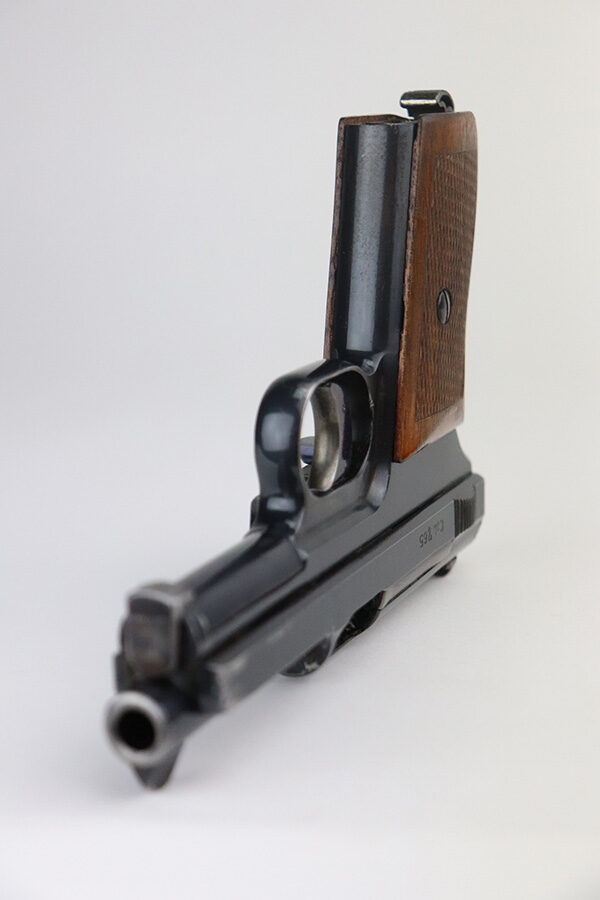 7/9/21 – This is an excellent example of a transitional Mauser Model 1914/34 manufactured in the 1930’s. It is all matching and has the proper “Crown U” proofs. It has retained about 95% of its original high polish finish. There is minor wear on the high edges of the slide and around the muzzle. Some scratchy wear on the left side of the frame. Spotty freckling on the front strap. The fire blue on the trigger is mostly intact. The gun comes with a nice wood grip and a period-correct magazine. Excellent bore – shiny with strong rifling.