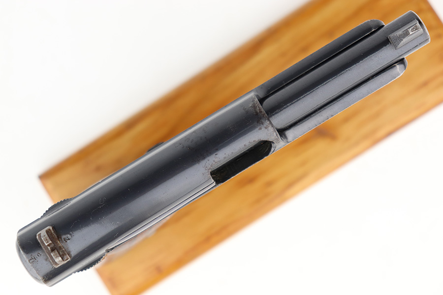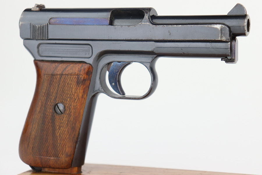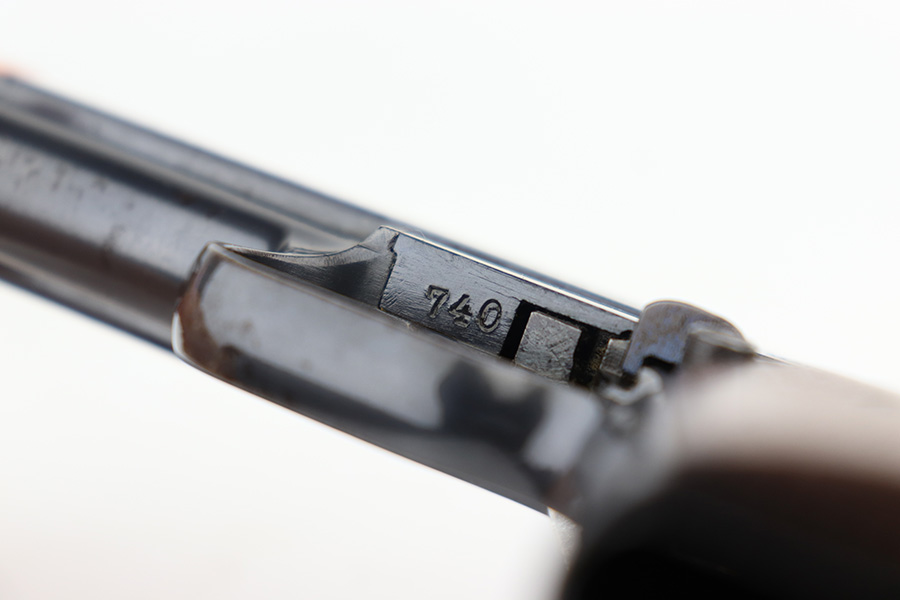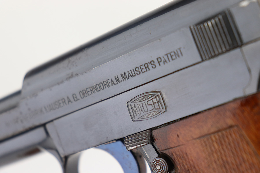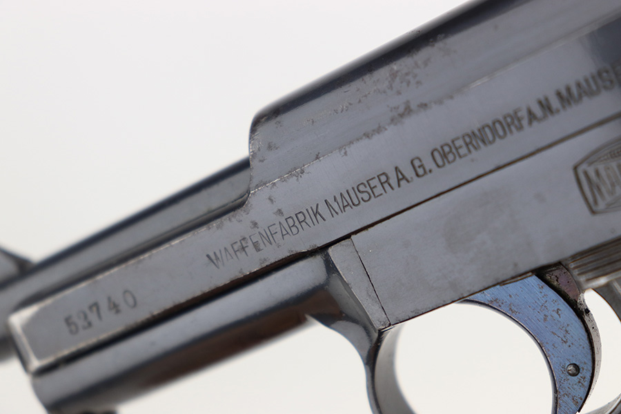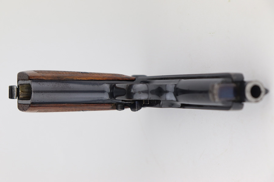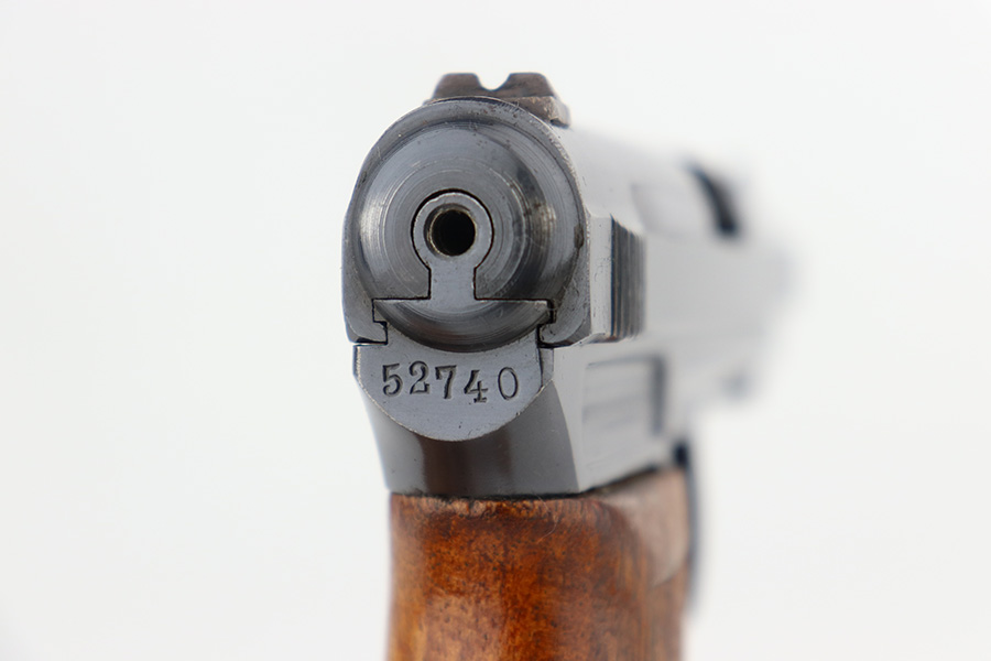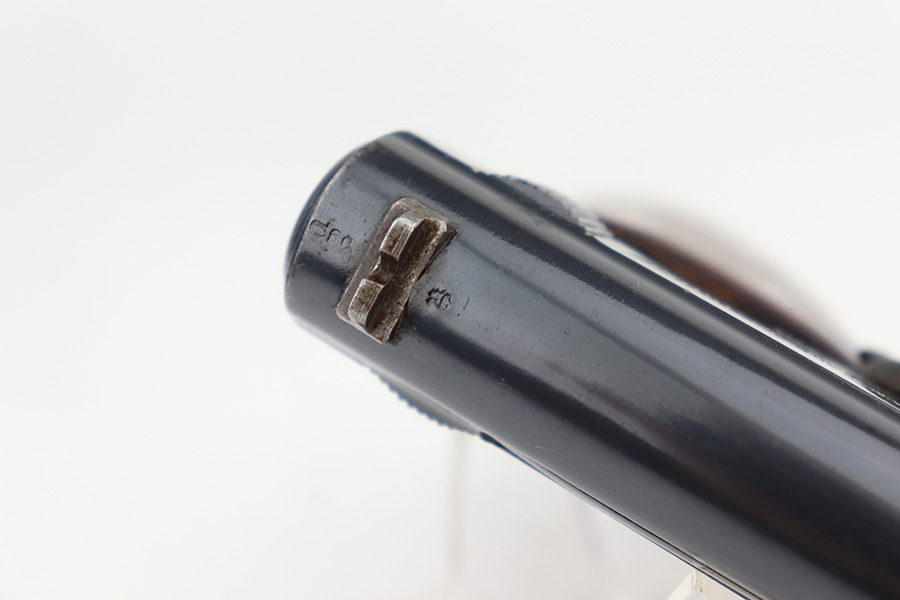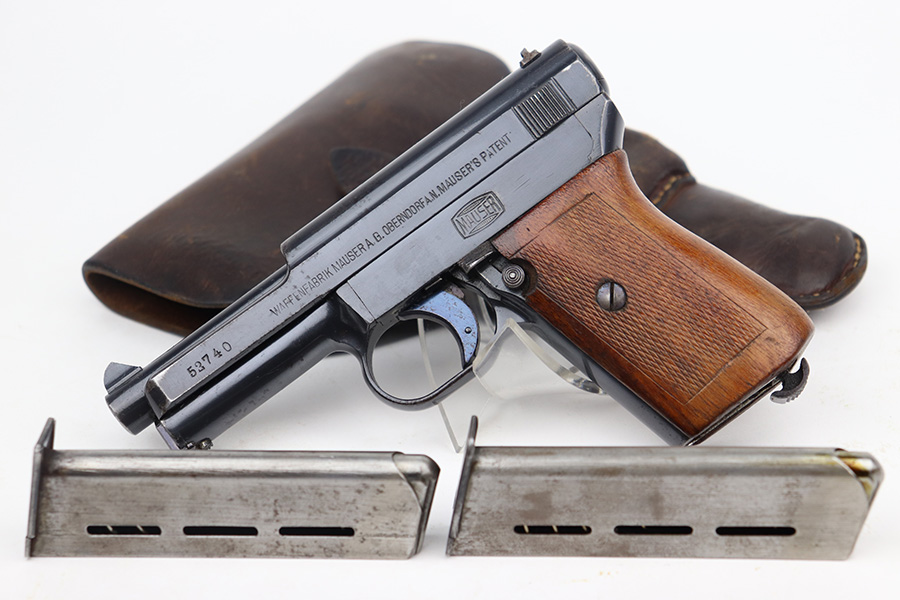 11/28/22 – This is an excellent example of a Mauser Model 1914, chambered in 7.65mm. It is all matching and has the proper “Double Crown U” proofs. This one also has a small Imperial military proof on the top of the slide, indicating it was issued to an Imperial German officer during WW1. It comes as a rig with a nice un-marked chocolate leather holster and two proper magazines. The gun itself has retained about 96% of its original finish with minor wear around the muzzle and some of the high edges. Although there isn’t much actual finish loss, there are areas of light spotty oxidation along both sides of the slide and on the underside of the frame. Comes with a very nice period-correct wood grip – no cracks or chips. Excellent bore with strong rifling.