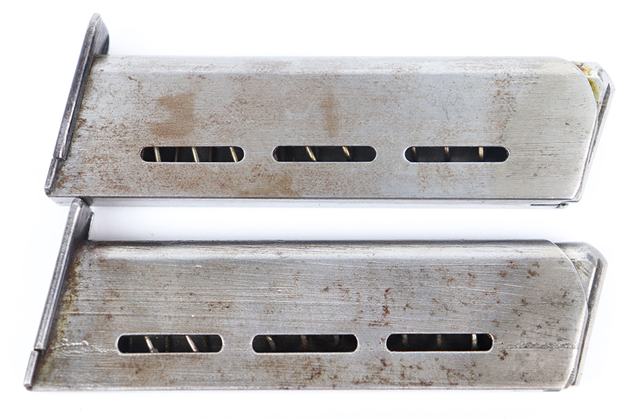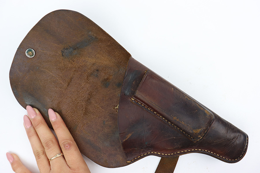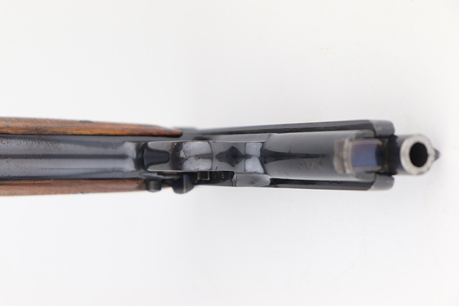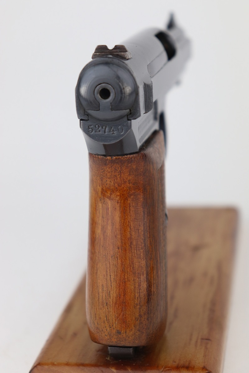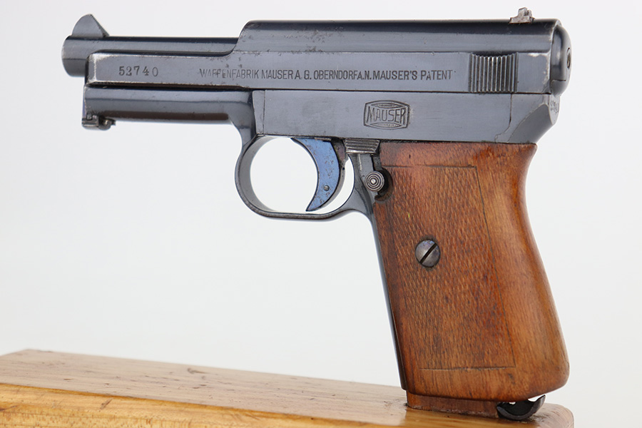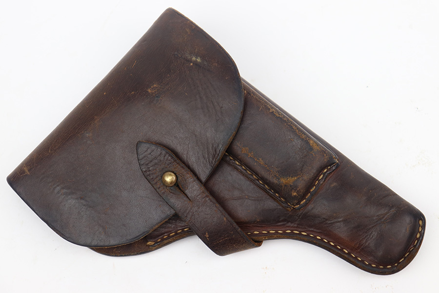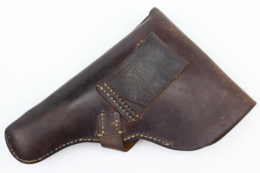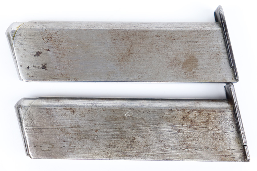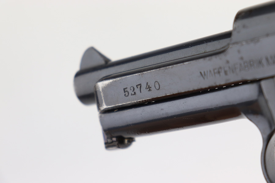11/28/22 – This is an excellent example of a Mauser Model 1914, chambered in 7.65mm. It is all matching and has the proper “Double Crown U” proofs. This one also has a small Imperial military proof on the top of the slide, indicating it was issued to an Imperial German officer during WW1. It comes as a rig with a nice un-marked chocolate leather holster and two proper magazines. The gun itself has retained about 96% of its original finish with minor wear around the muzzle and some of the high edges. Although there isn’t much actual finish loss, there are areas of light spotty oxidation along both sides of the slide and on the underside of the frame. Comes with a very nice period-correct wood grip – no cracks or chips. Excellent bore with strong rifling.